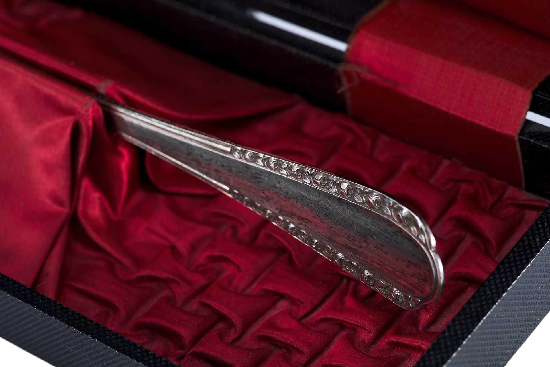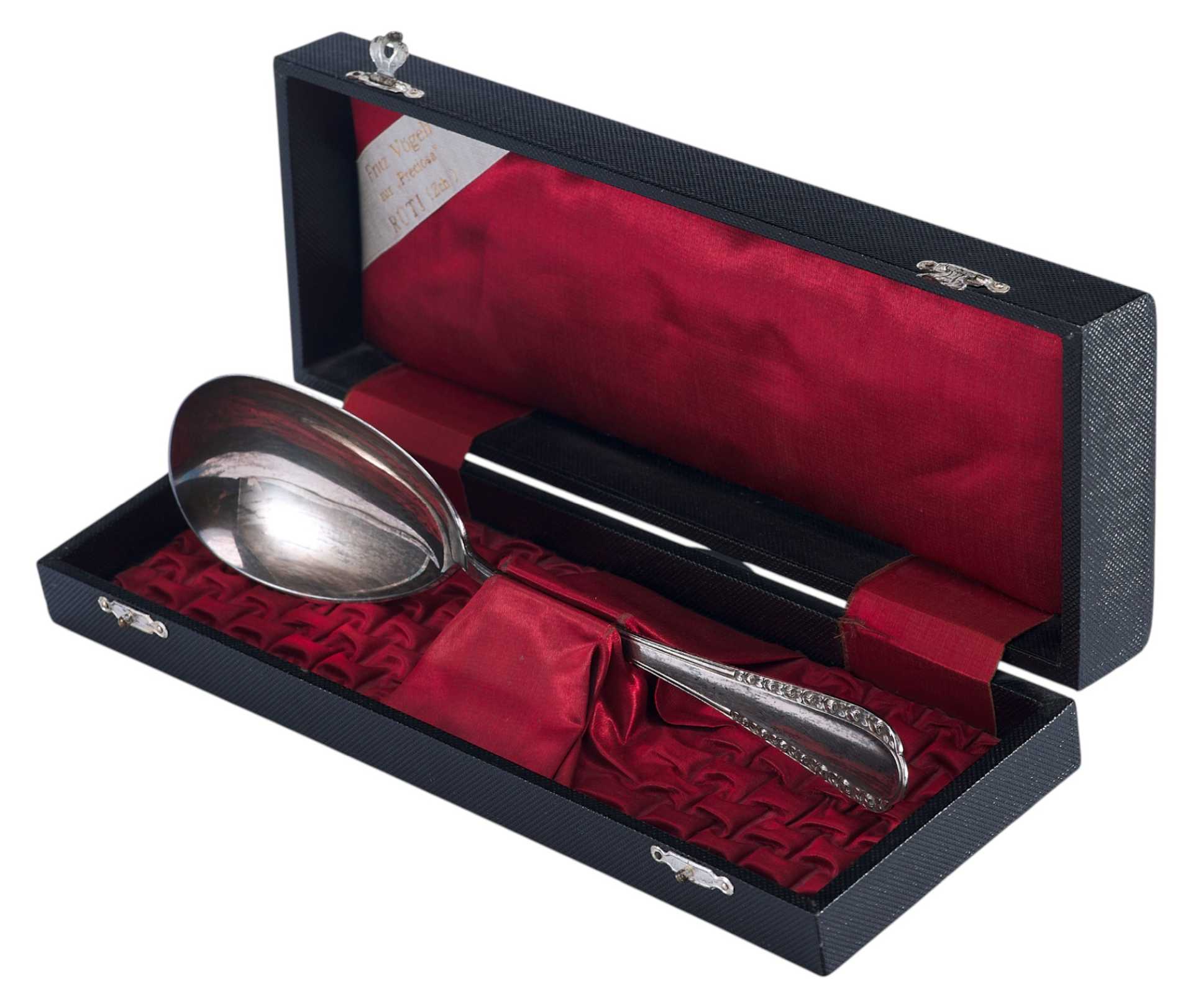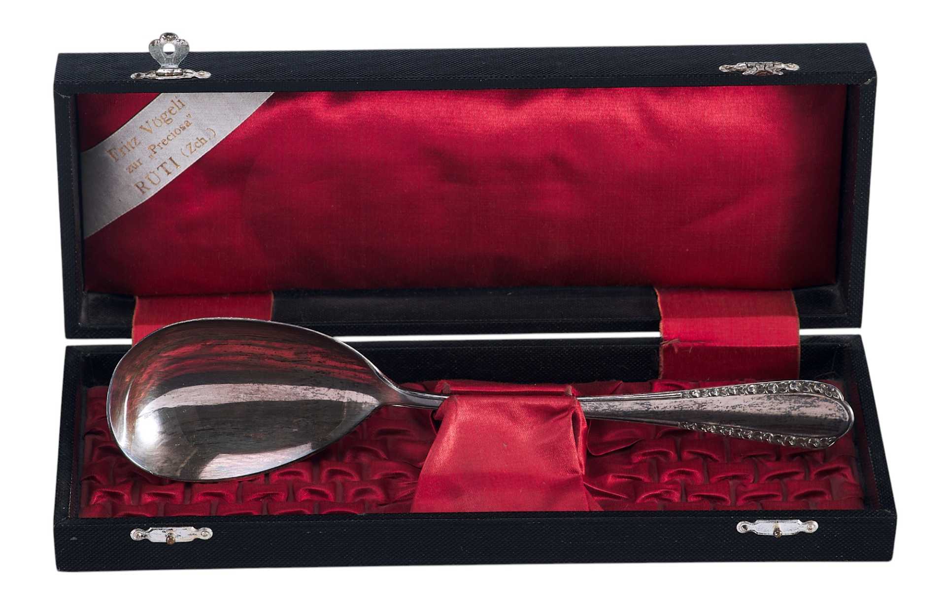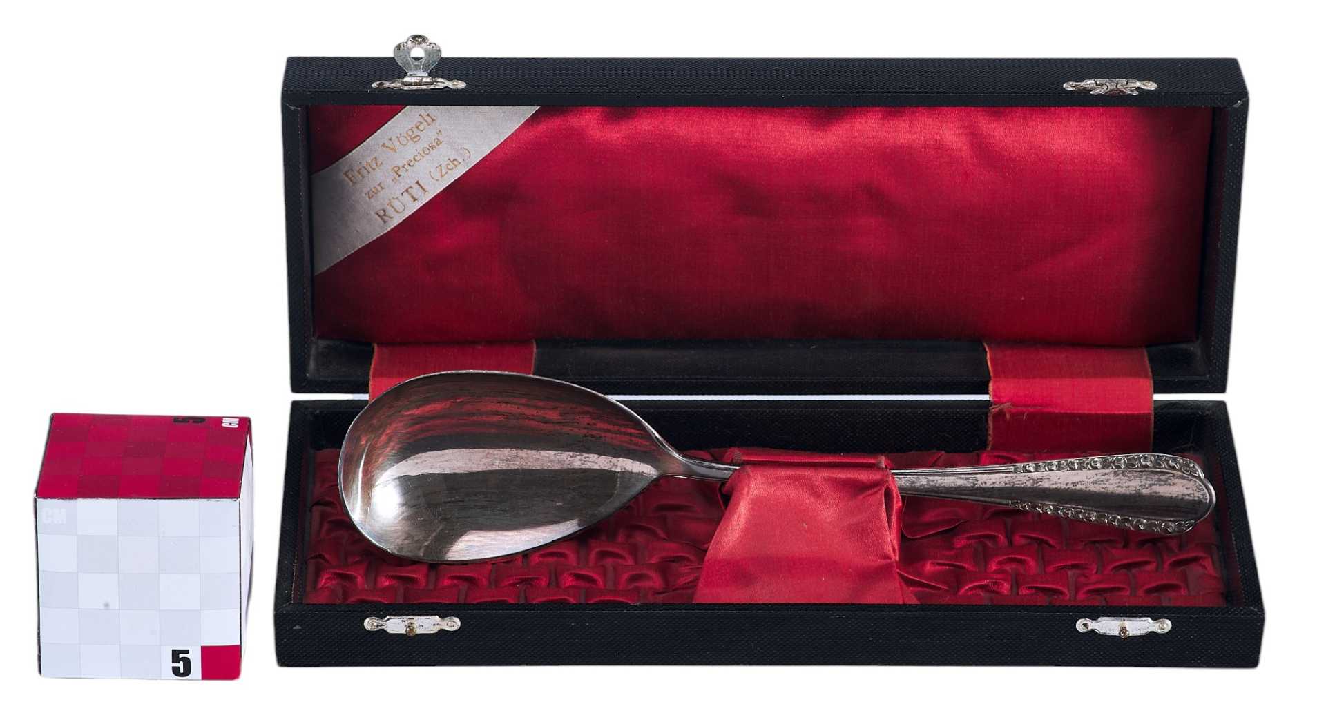 На крышке футляра внутри имеется белая лента с надписью: «Fritz Vogeli zuř Preciosa” RÚTI (Zch)» - швейцарский магазин серебряных изделий Франца Вогели.