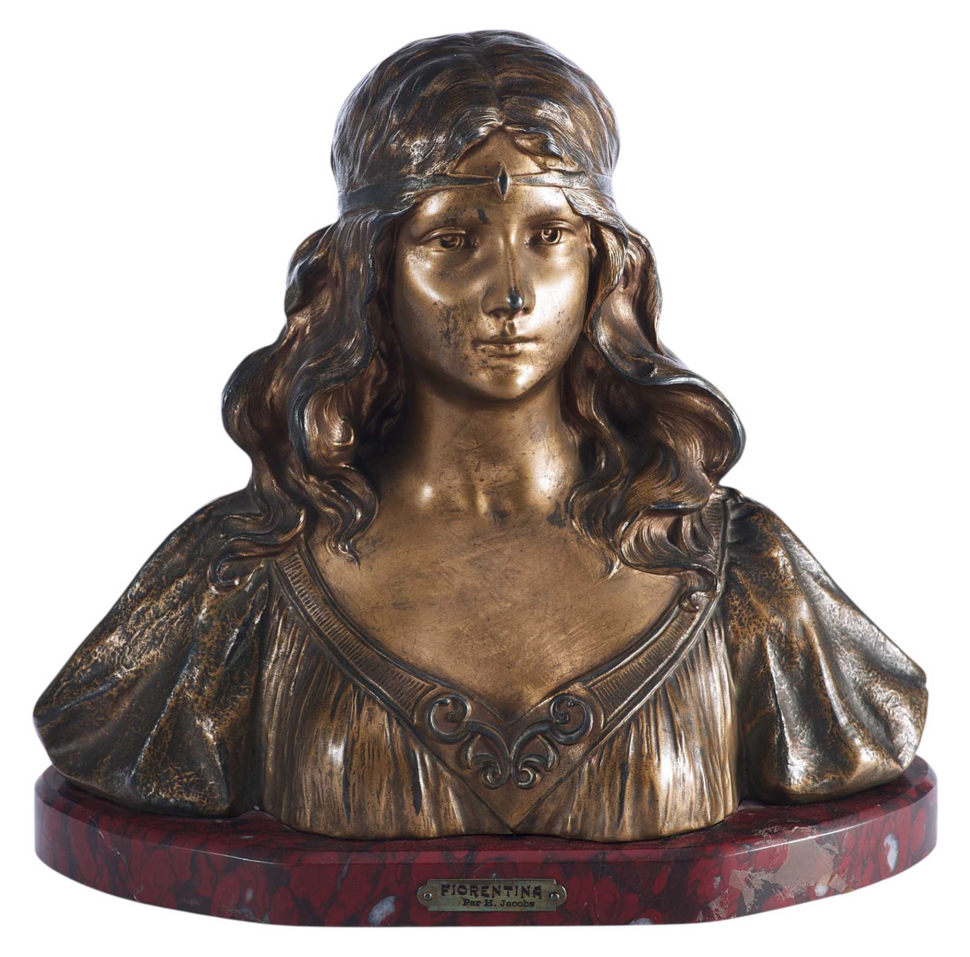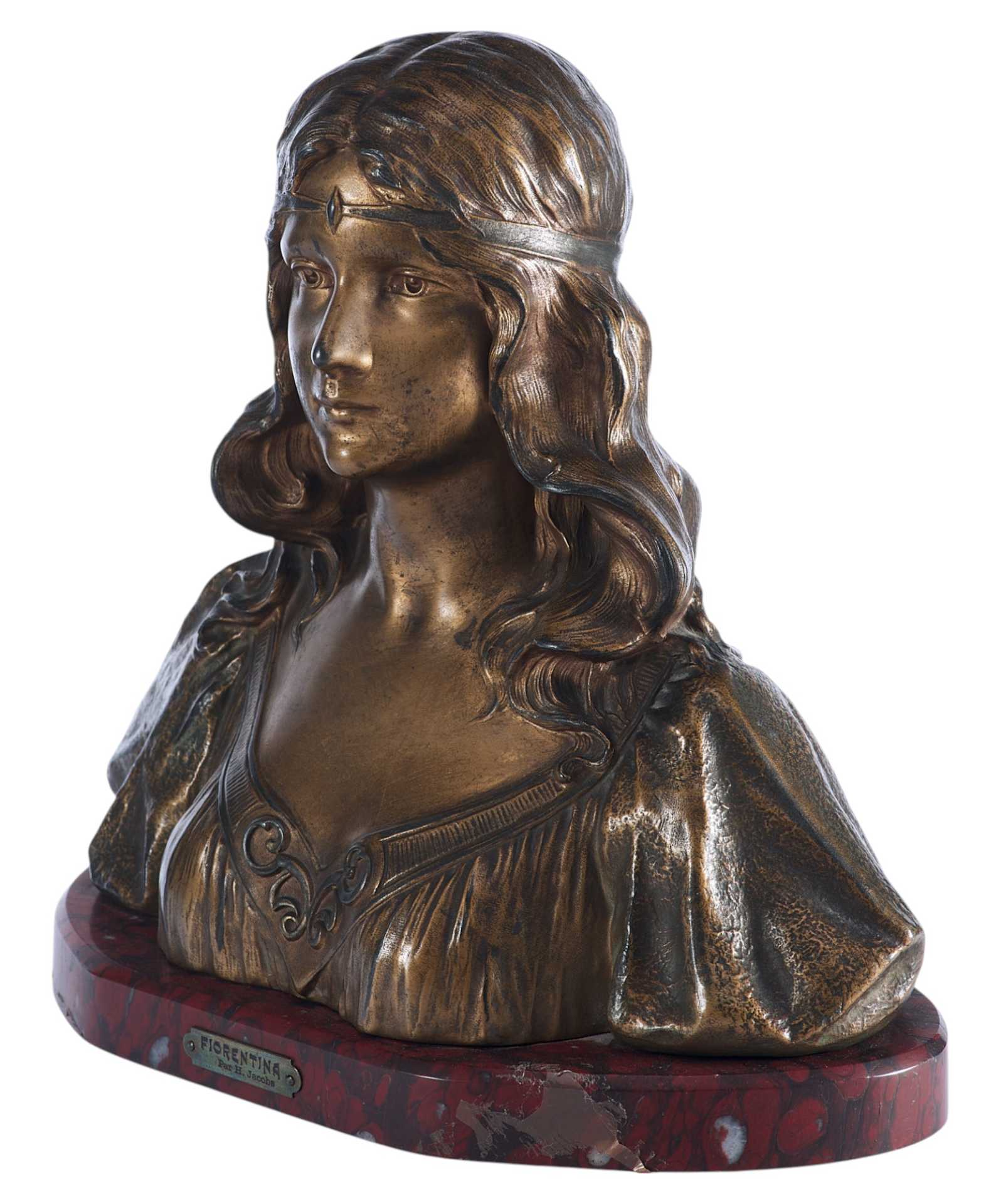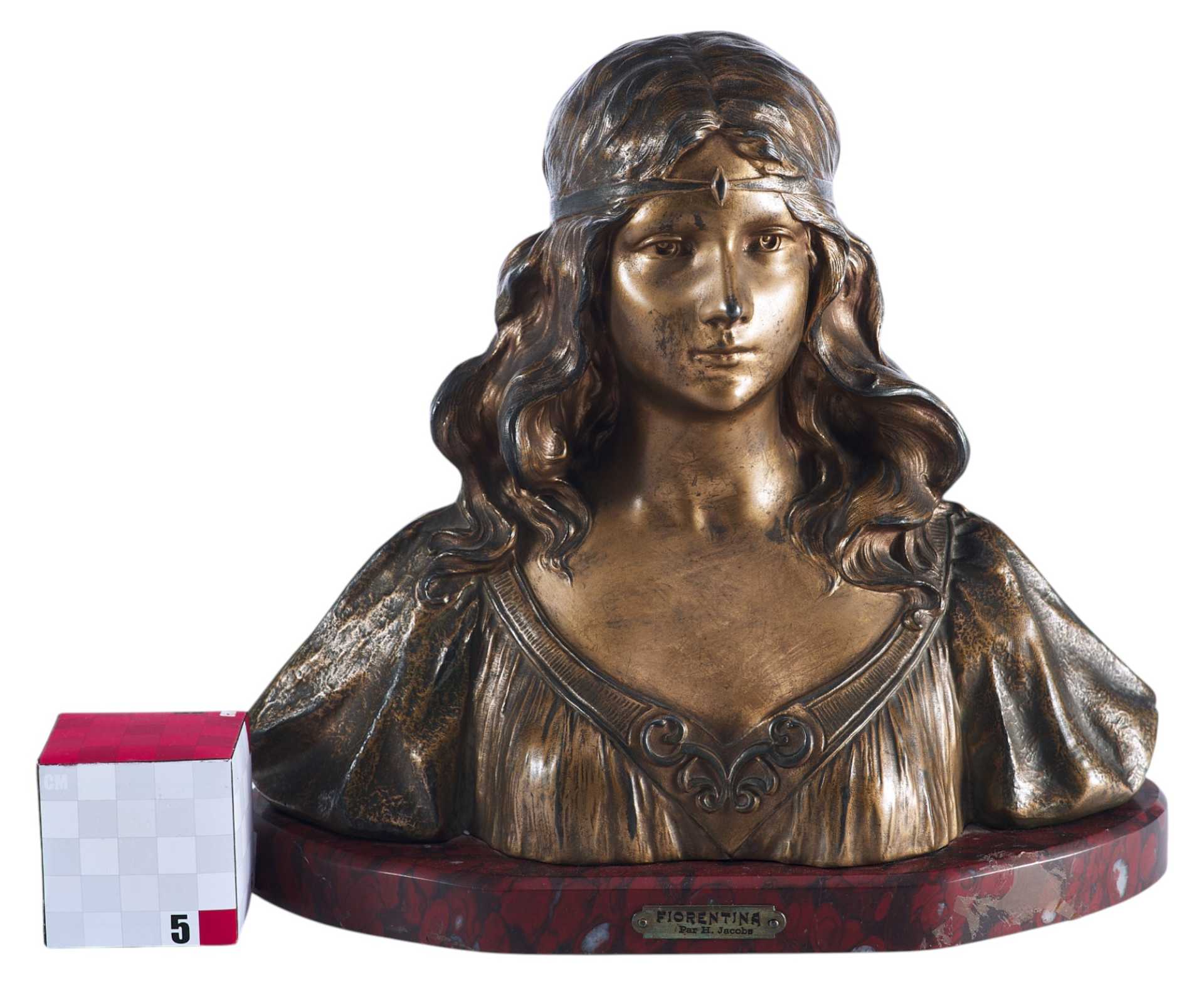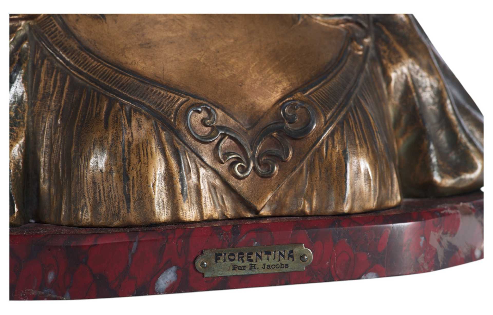 На подставке шильдик с надписью “FIORENTINA Par EL Jacobs”. Фиорентина (Флорентийка) с EL Якобса. Бюст с изображением флорентийки представляет собой типичный пример кабинетной бронзовой пластики, получившей наибольшее распространение в конце XIX — начале XX века. Скульптура отличается высоким качеством исполнения и стилистической гармонией. Художественные признака предмета и состояние используемых материалов не противоречит указанной датировке.