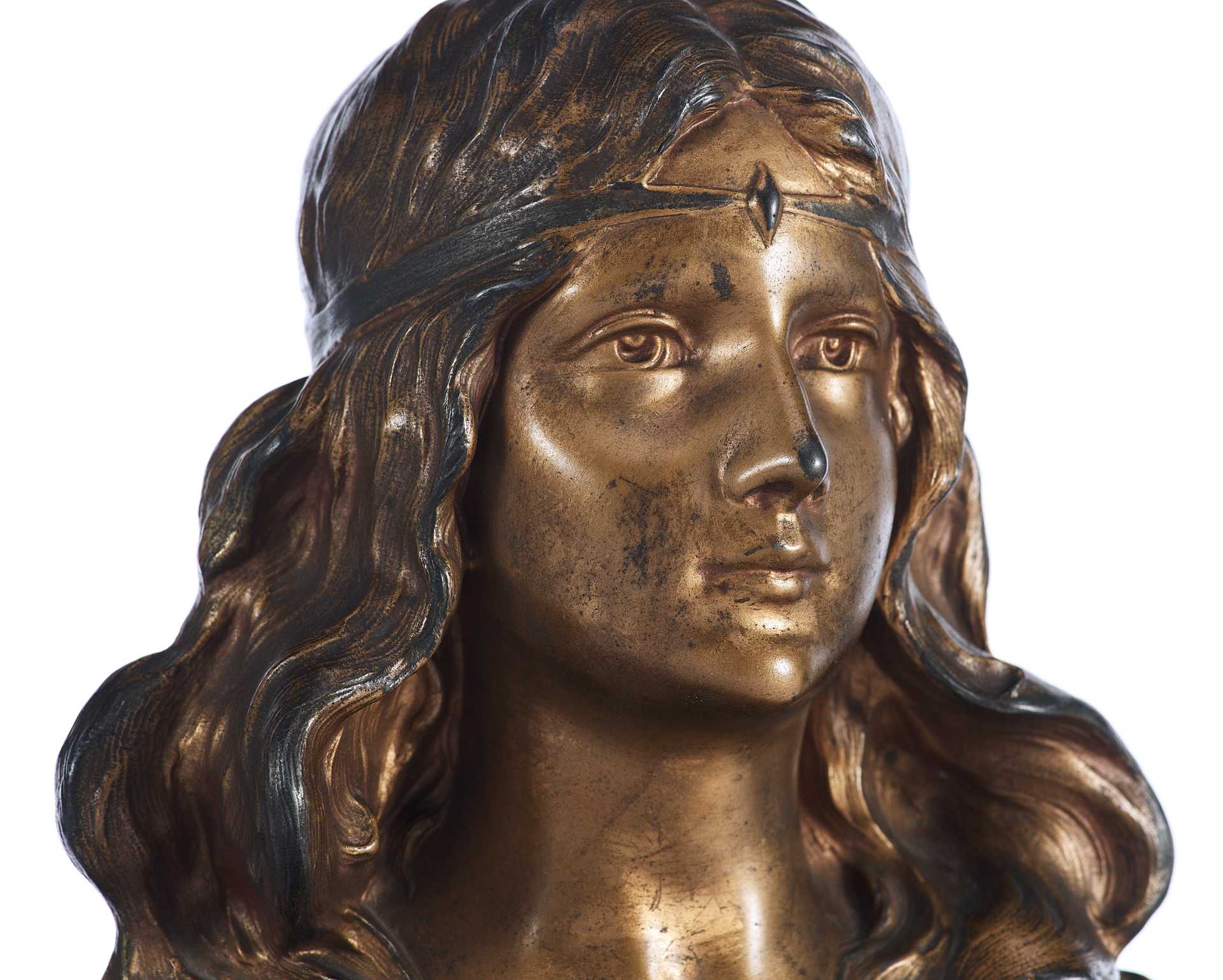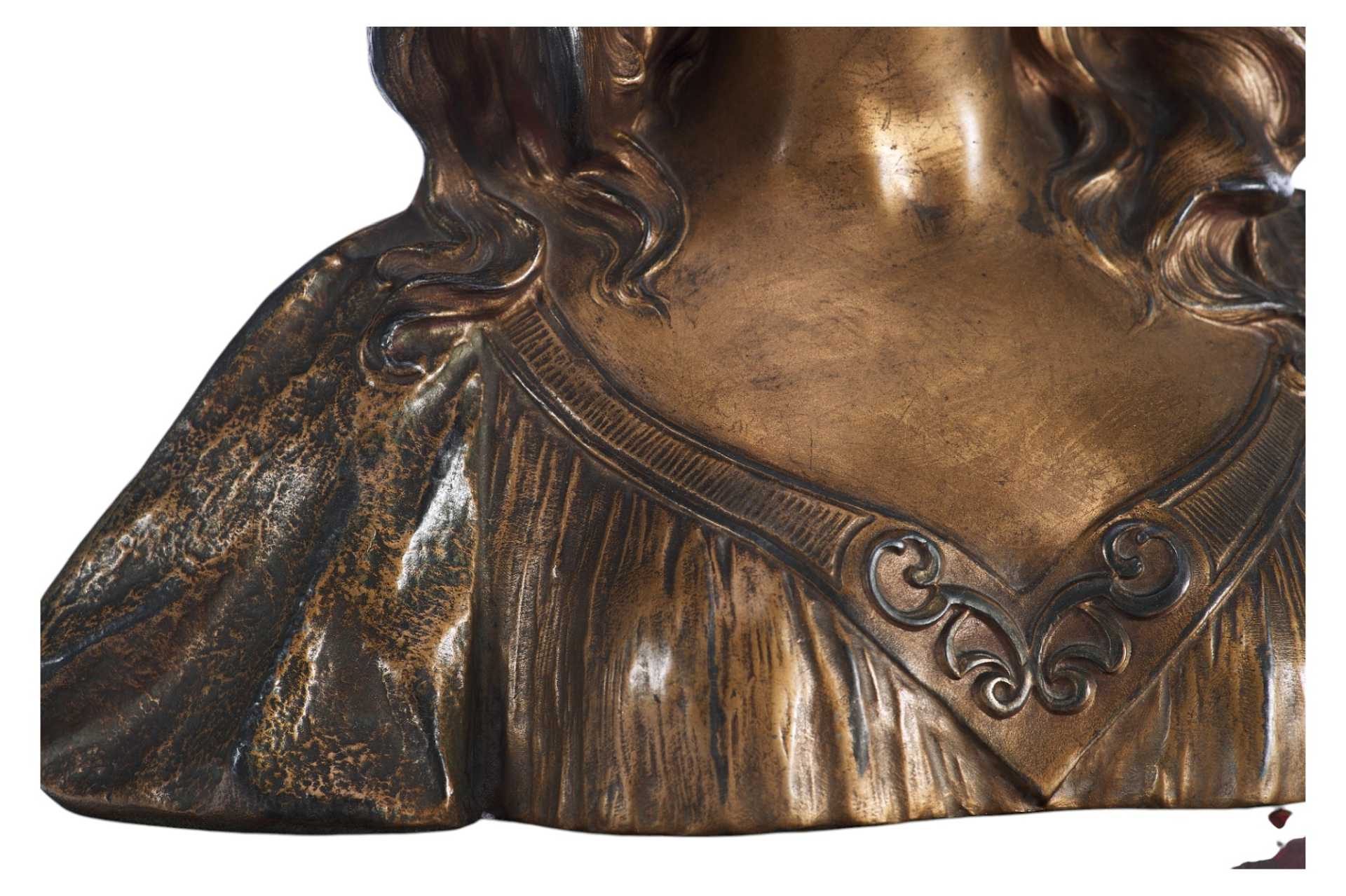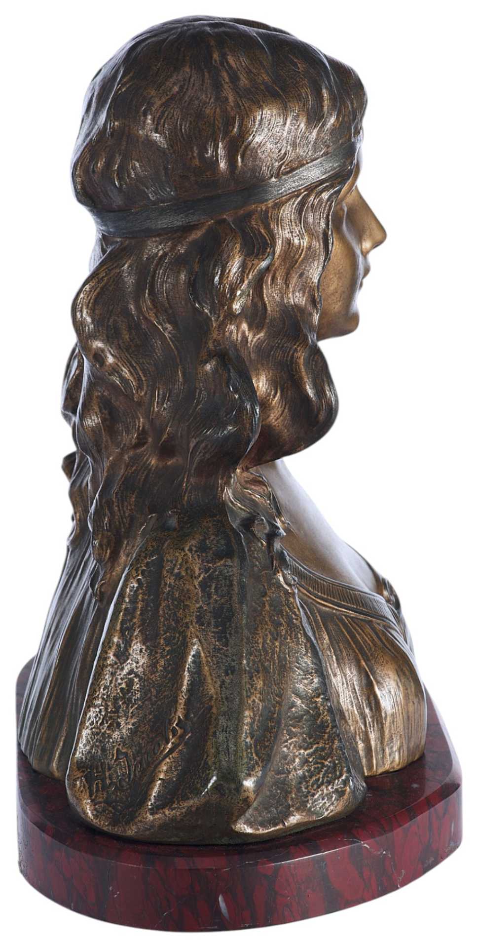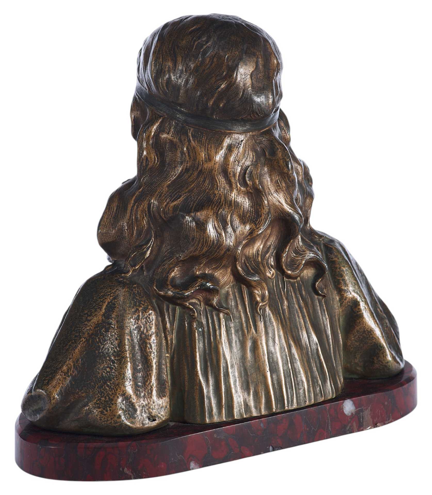 На подставке шильдик с надписью “FIORENTINA Par EL Jacobs”. Фиорентина (Флорентийка) с EL Якобса. Бюст с изображением флорентийки представляет собой типичный пример кабинетной бронзовой пластики, получившей наибольшее распространение в конце XIX — начале XX века. Скульптура отличается высоким качеством исполнения и стилистической гармонией. Художественные признака предмета и состояние используемых материалов не противоречит указанной датировке.