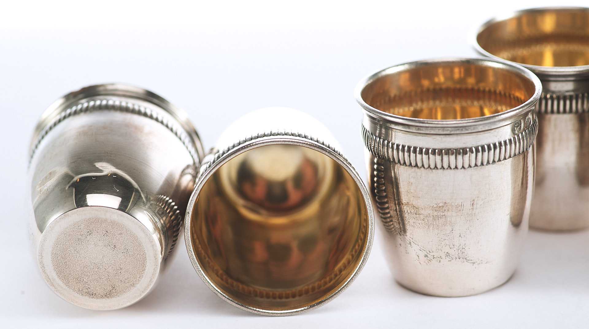 Представлен набор стопок с вертикальным рифленым фризом. Внутренняя поверхность стопок позолочена.