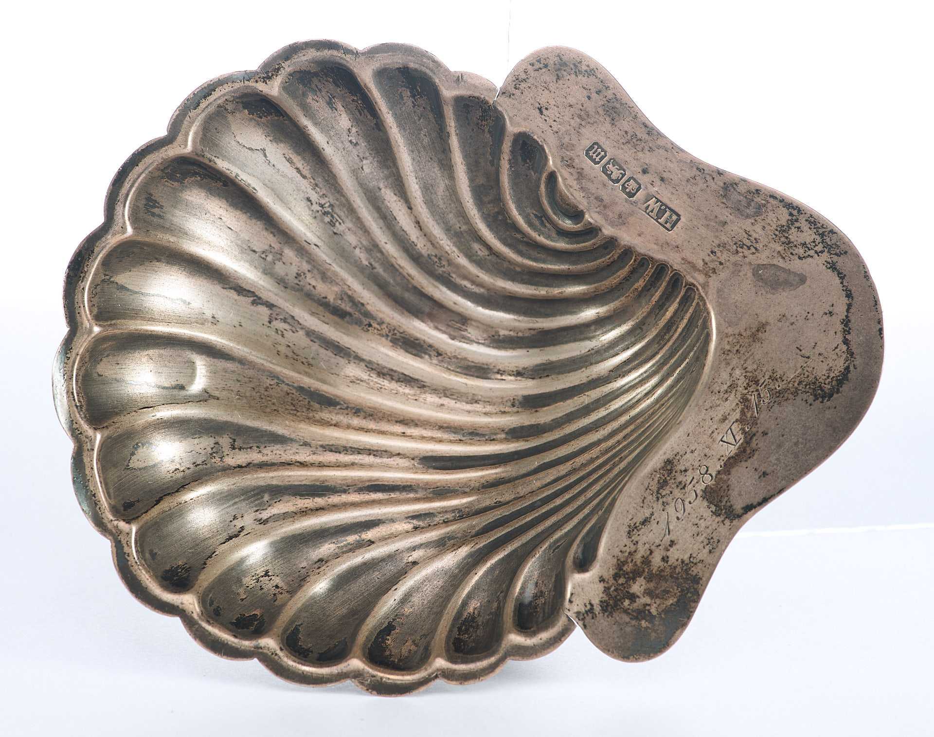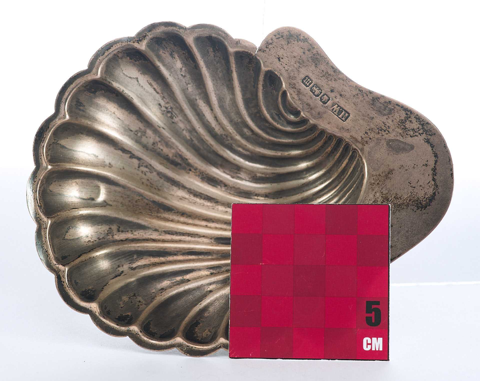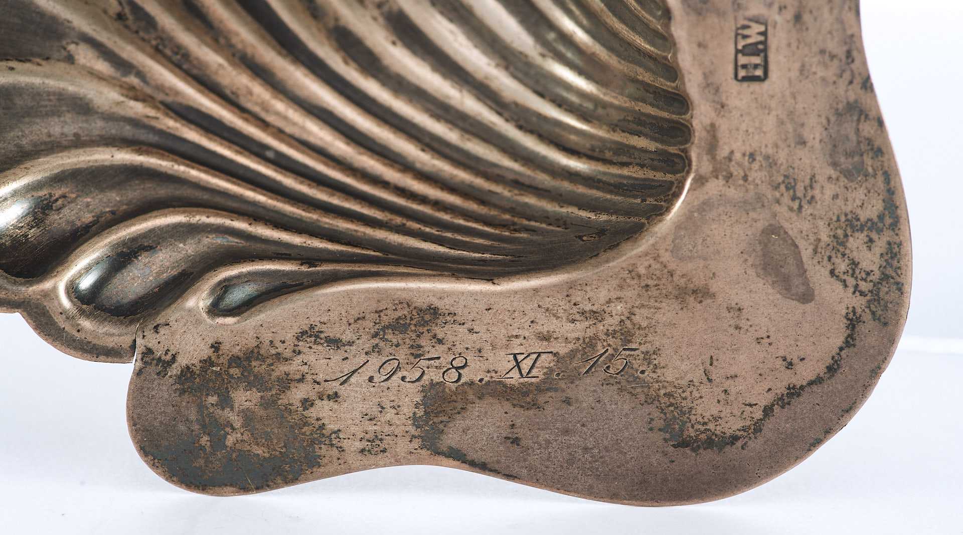 Представлена икорница в форме морской чаши-раковины на трех шаровидных ножках. На «пелюсти» икорницы клеймо