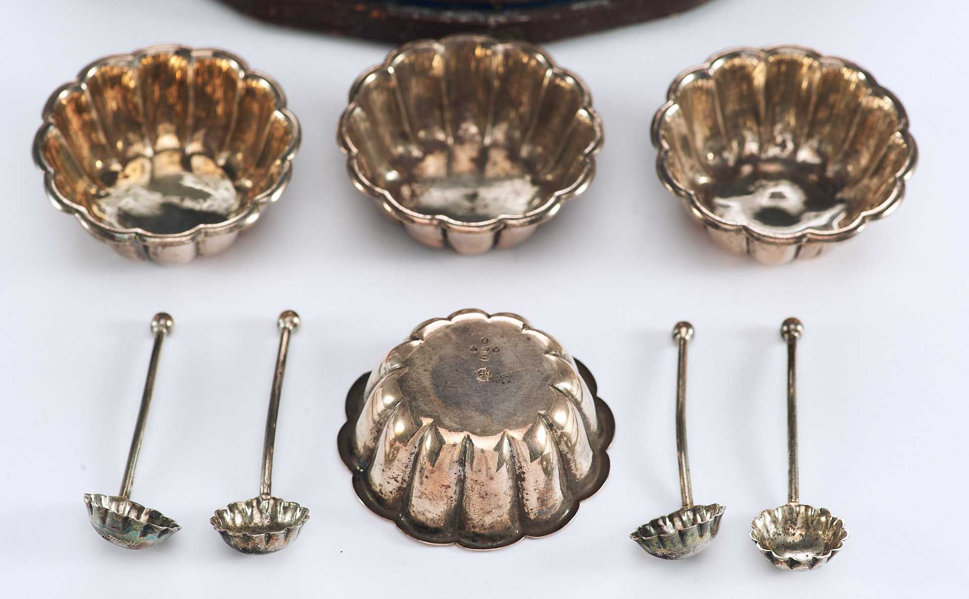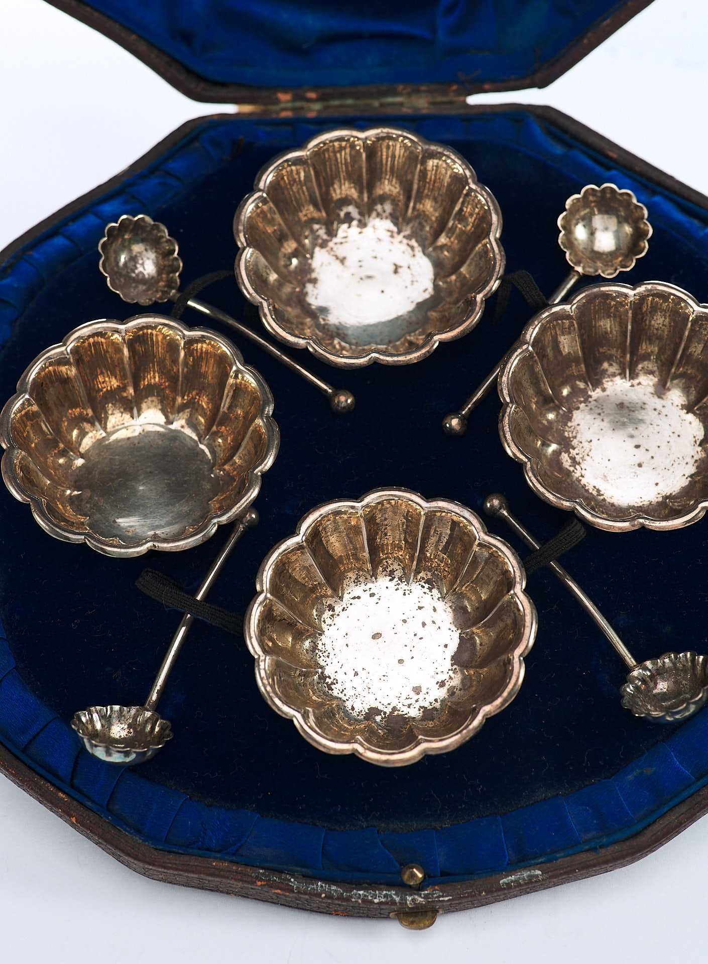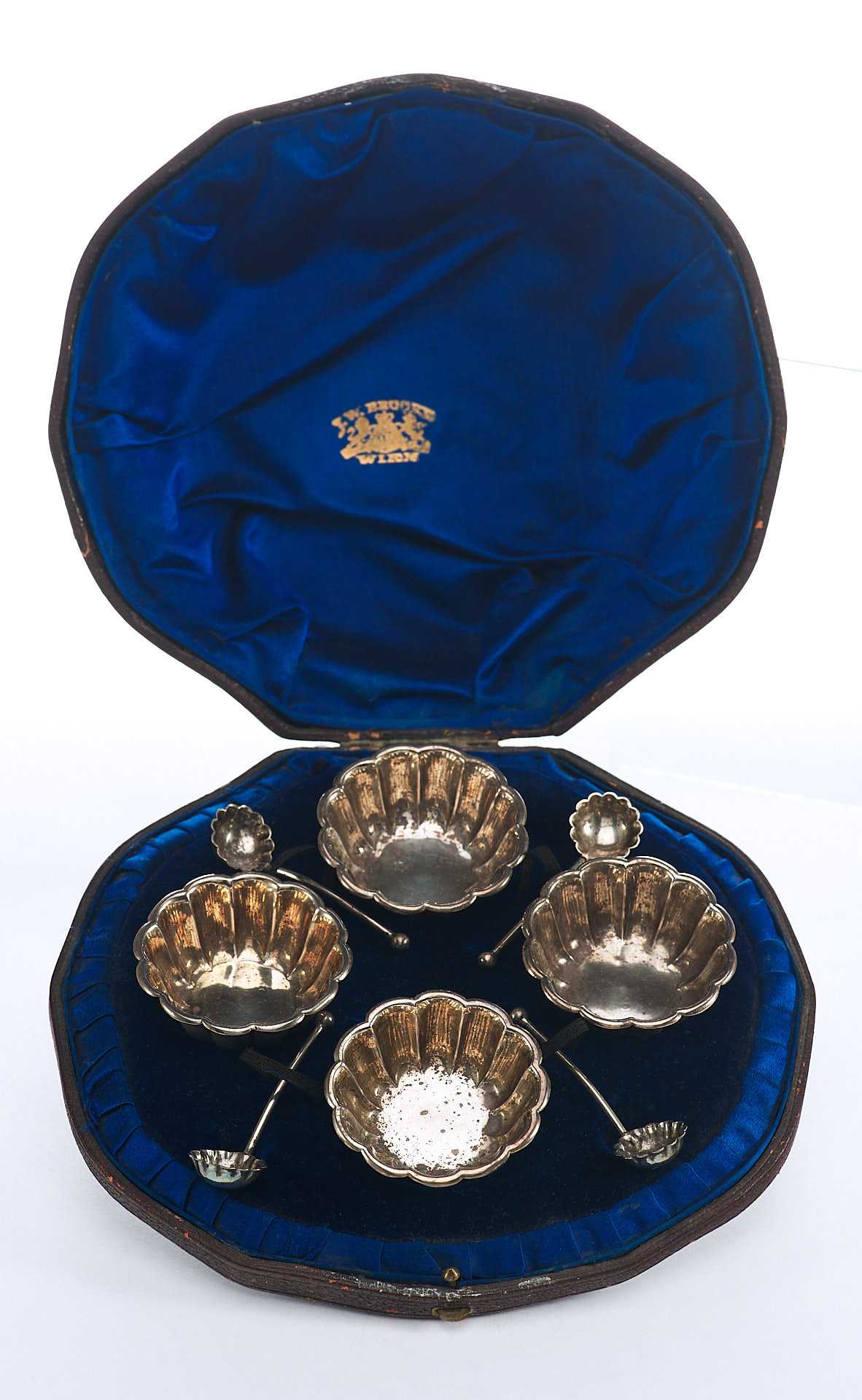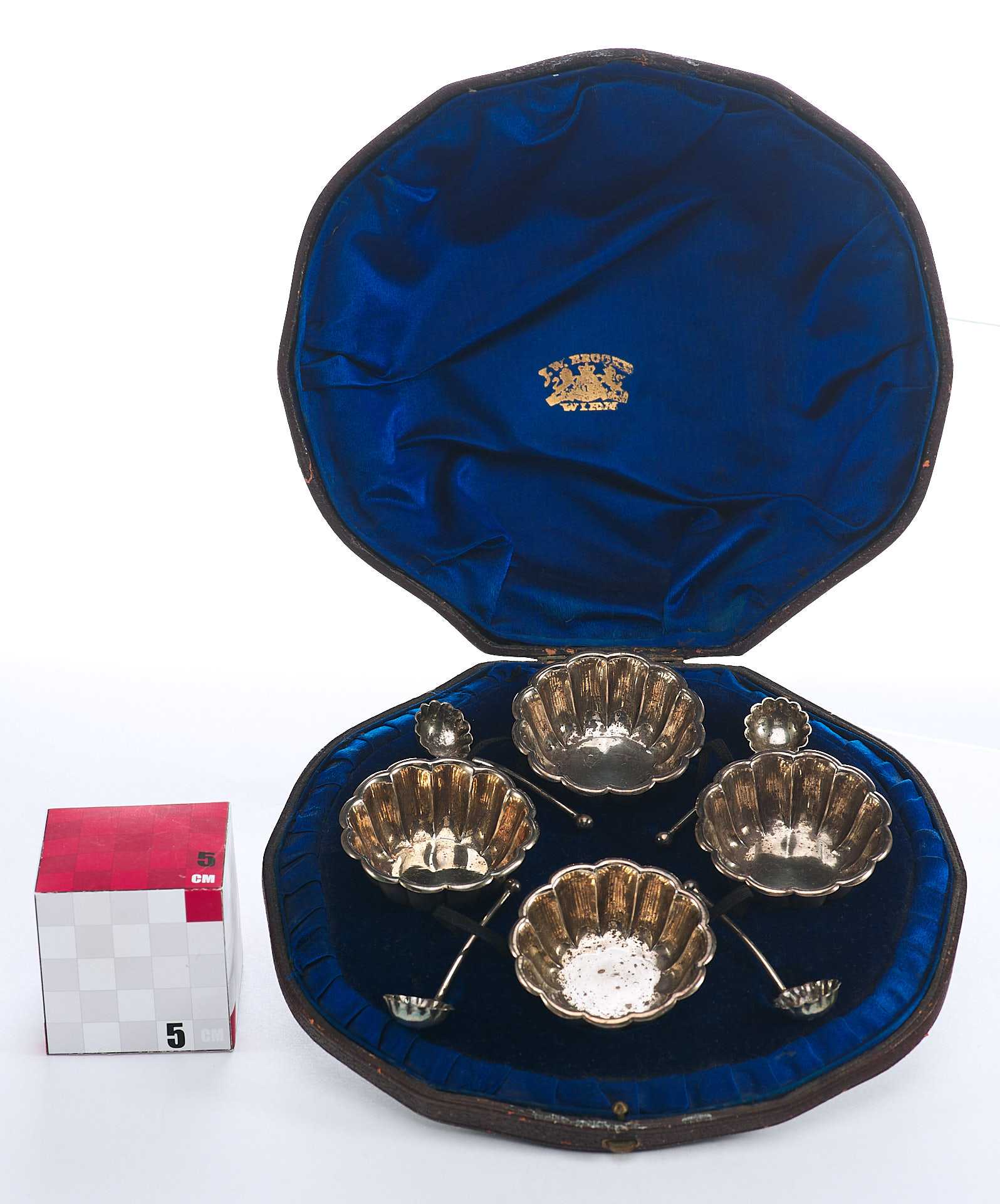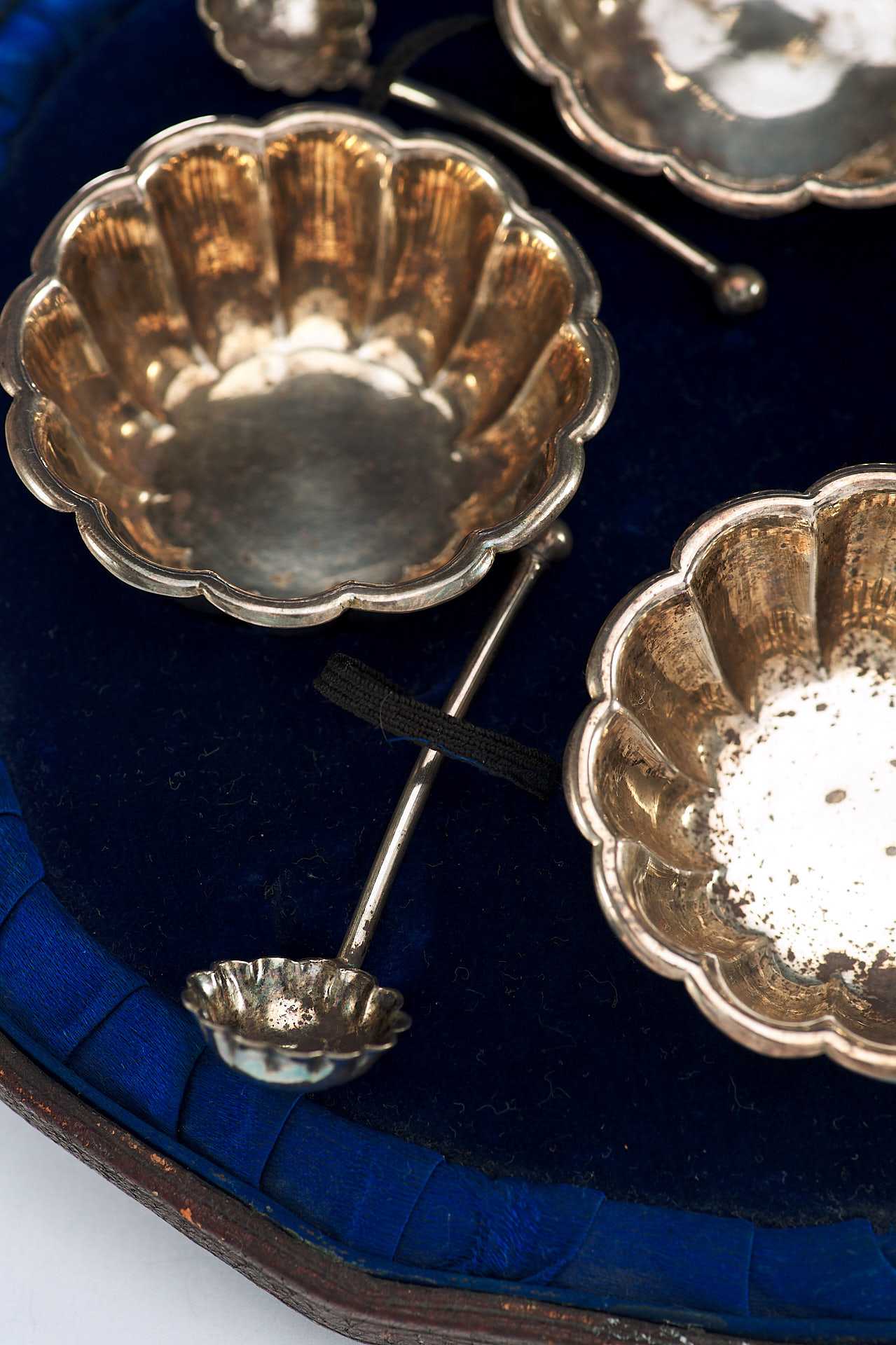 Представлен набор открытых столовых солонок с ложечками, позолоченными изнутри. Солонки, как и черпала ложечек имеют, округлые формы с рифленой поверхностью.