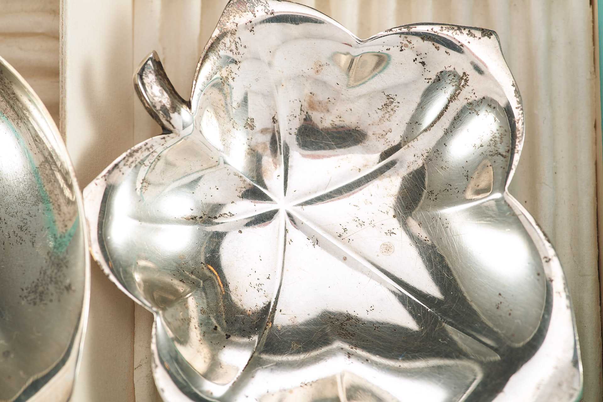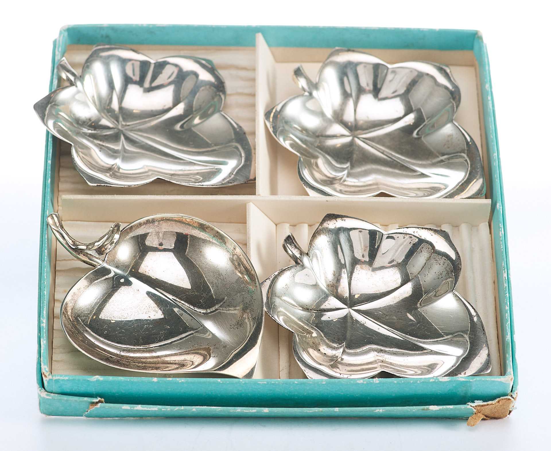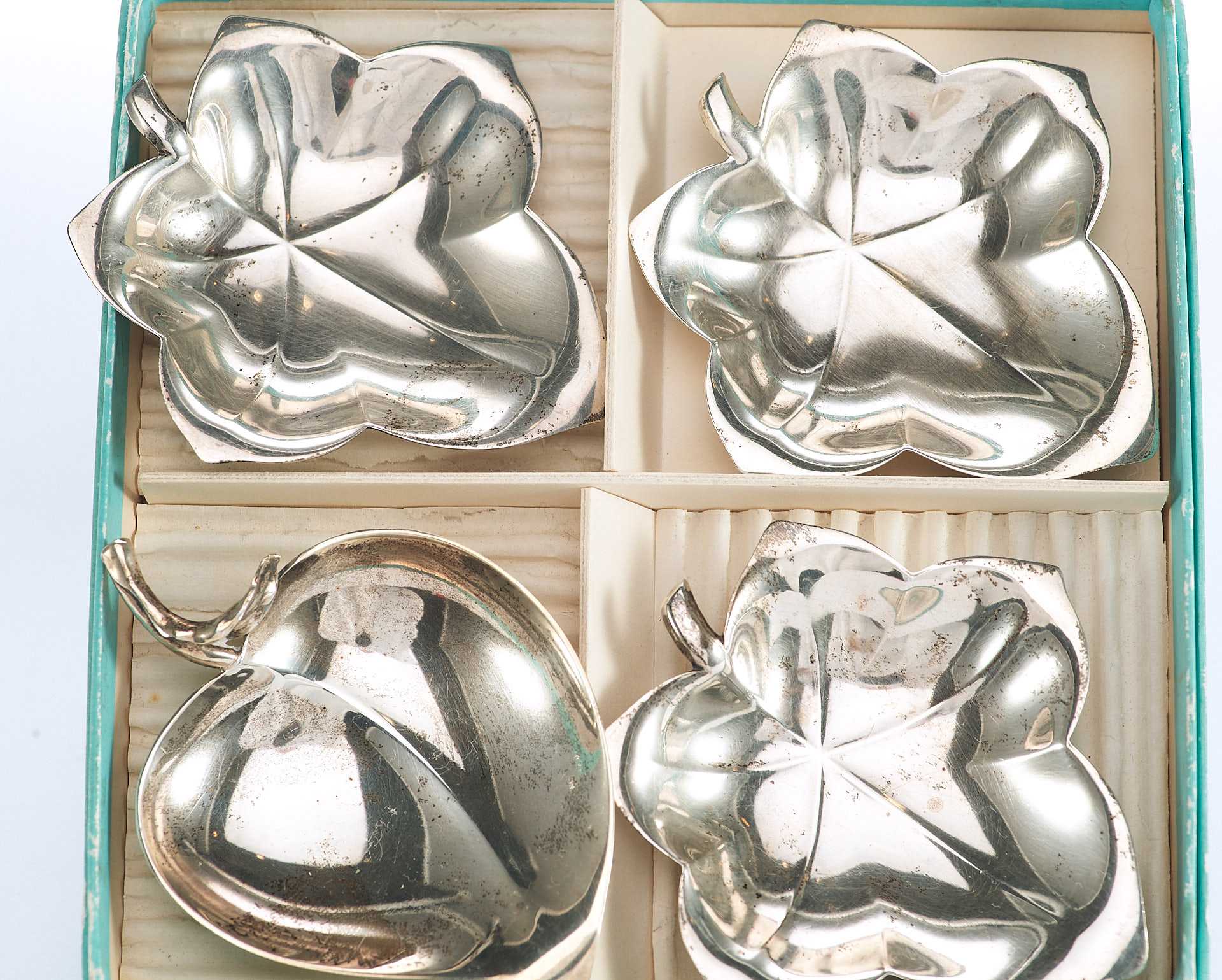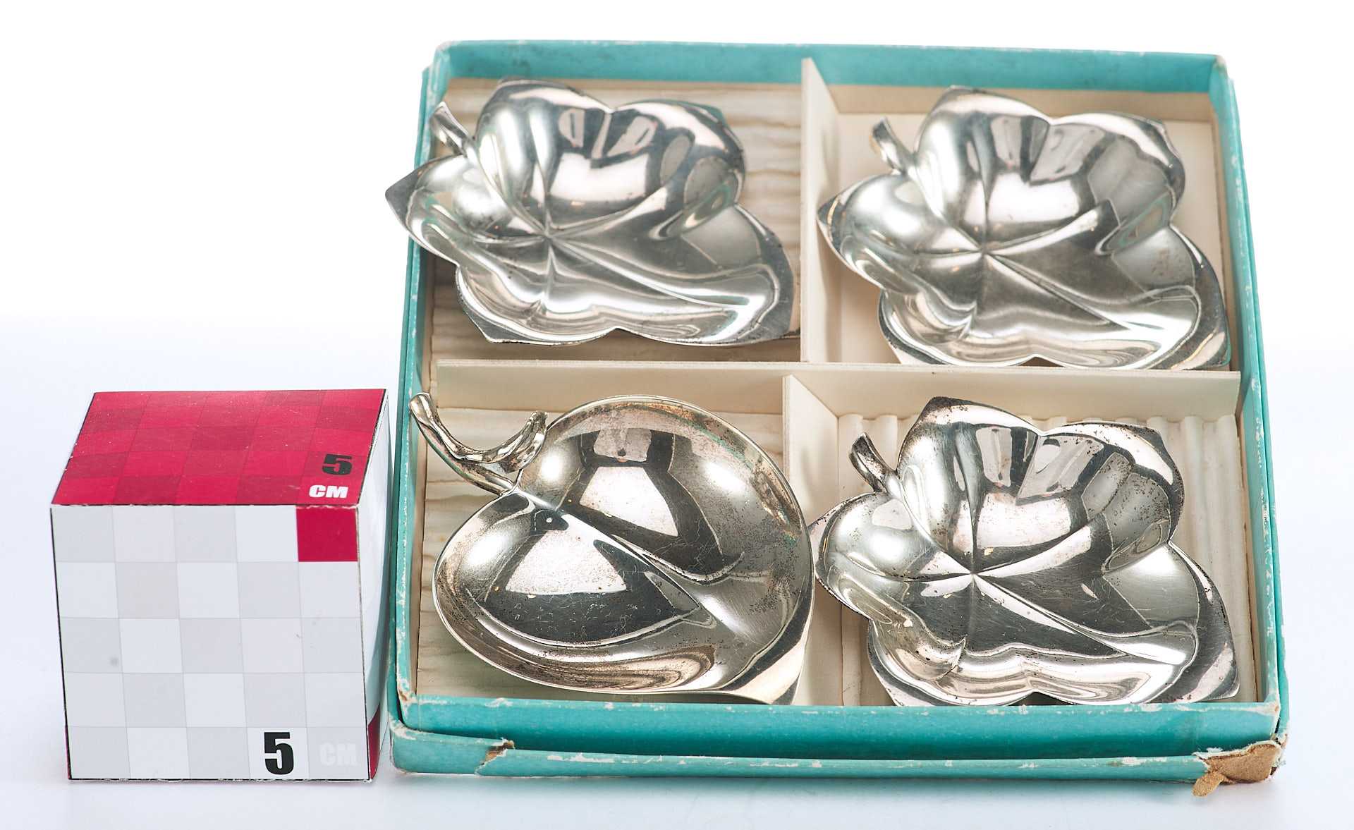 Представлен набор серебряных лоточков в форме листьев и яблока.