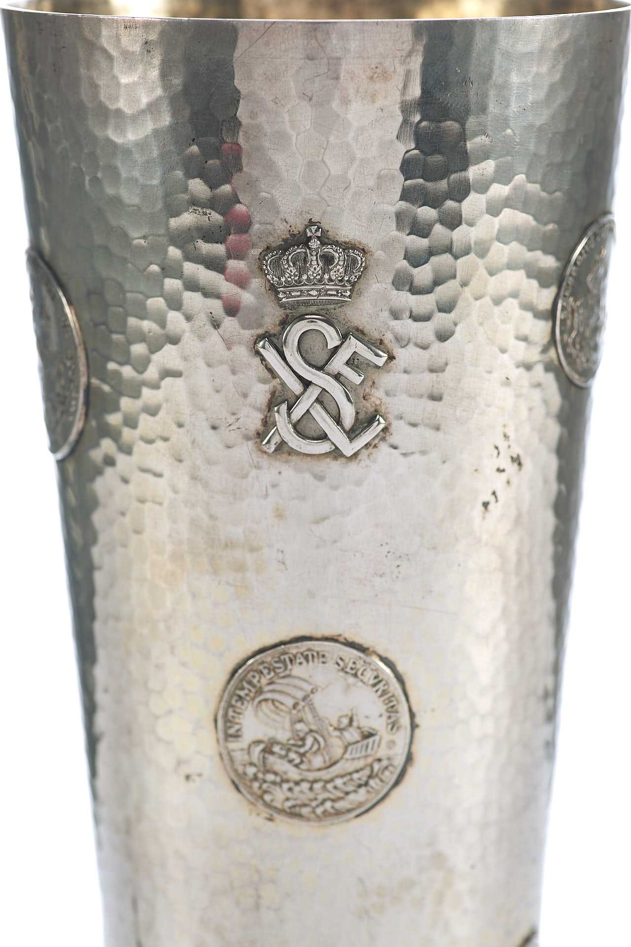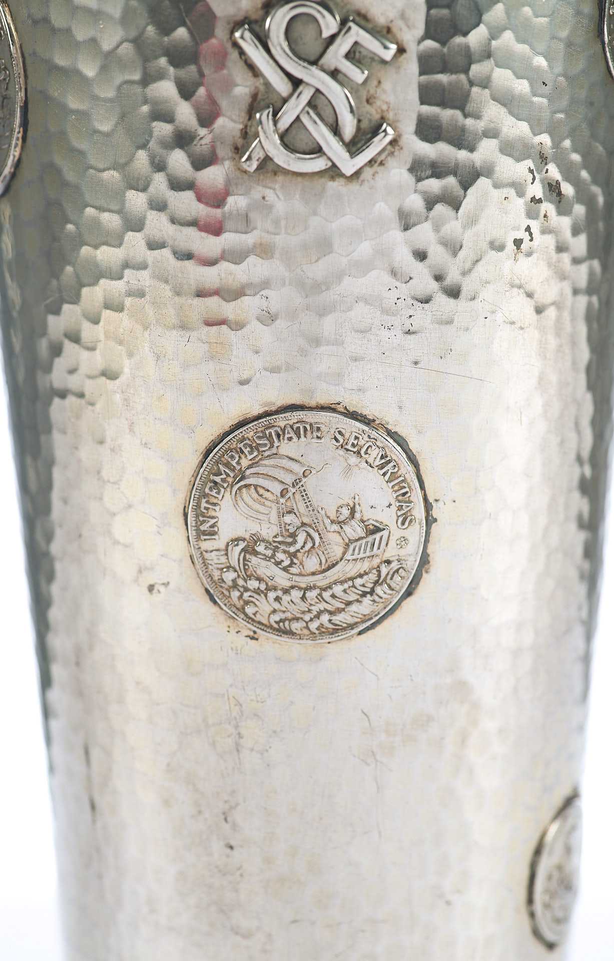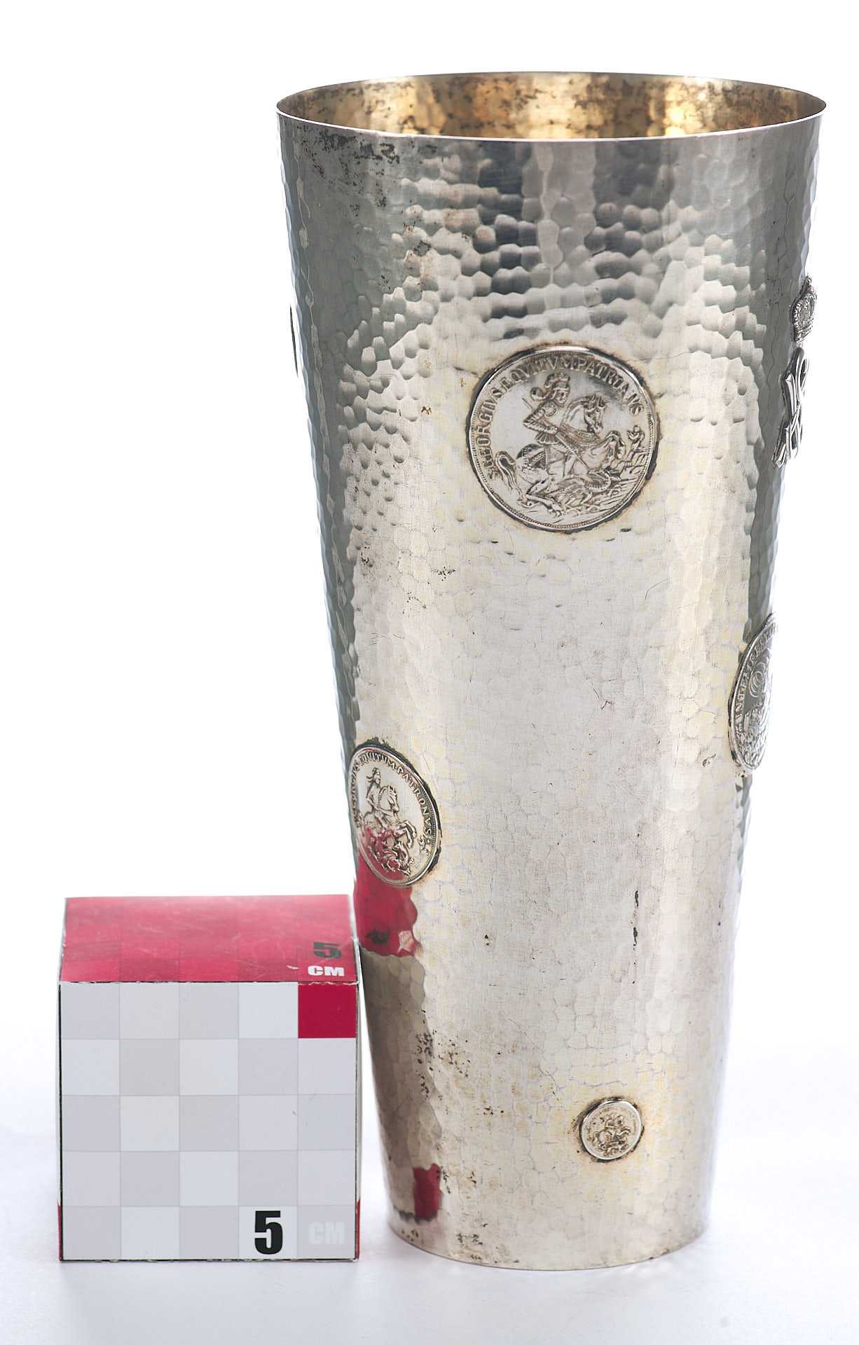 Представлен кубок с фактурной поверхностью, украшенный изображениями аверса и реверса амулета моряков изображающего на одной стороне снятого Георгия поражающего копьем дракона с надписью: «ST. GEORGIUS EQUITUM РATRONUS» Святой Георгий, справедливый заступник); на другой стороне изображение корабля под парусом в море с моряками с надписью: «IN TEMPESTATE SECURITAS» (В ненастье (грозу) защита).