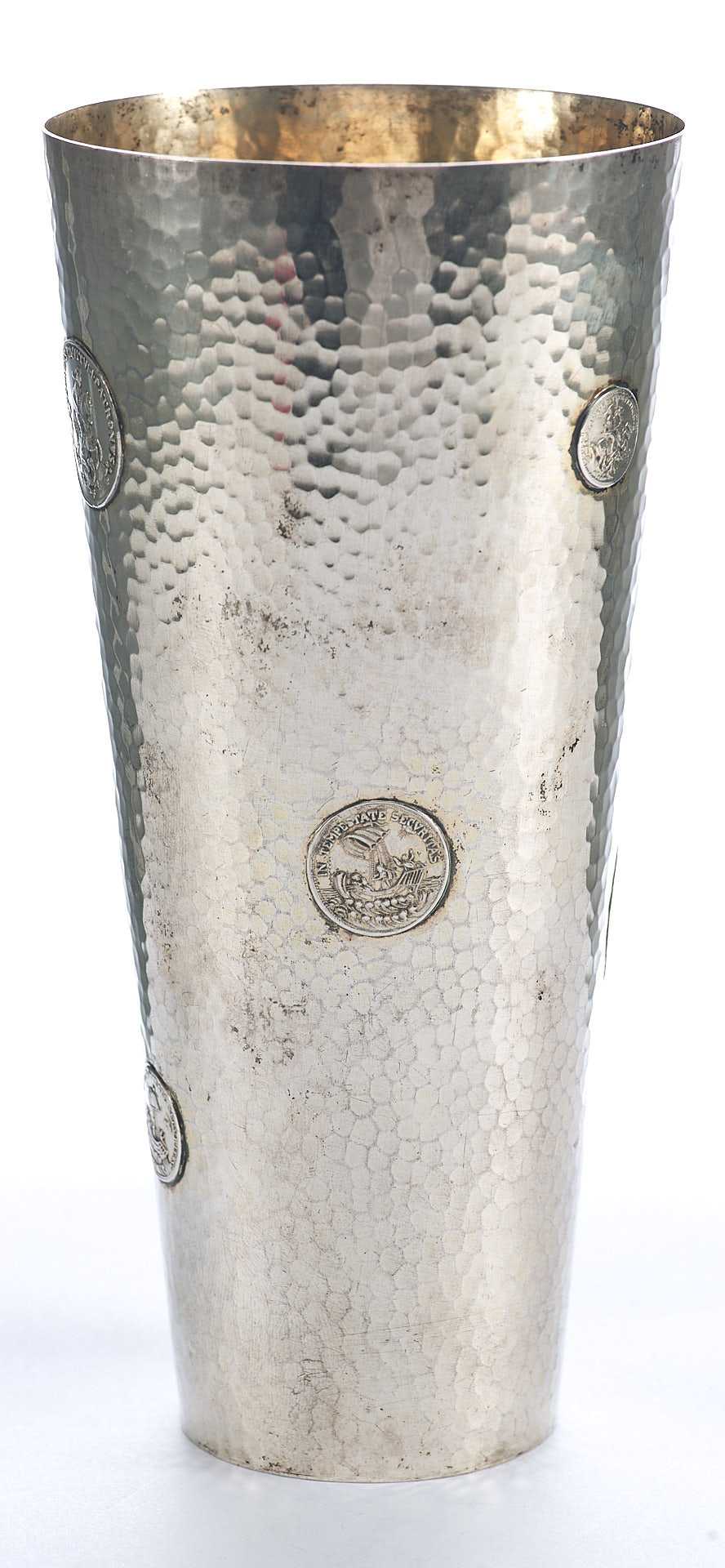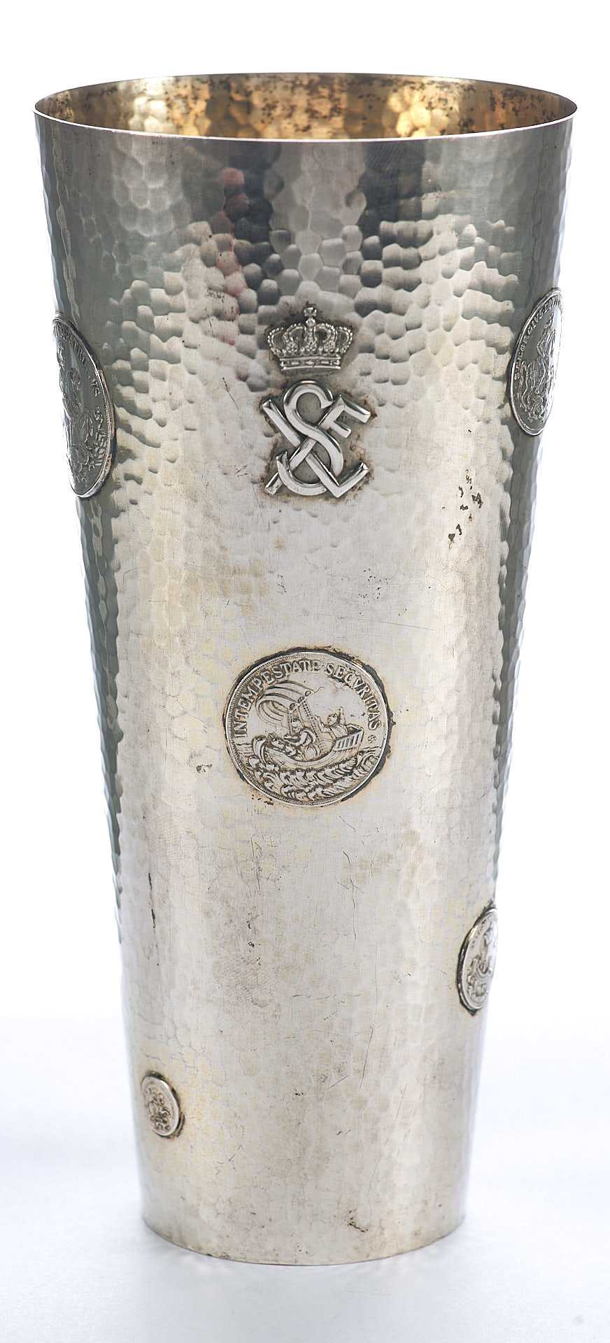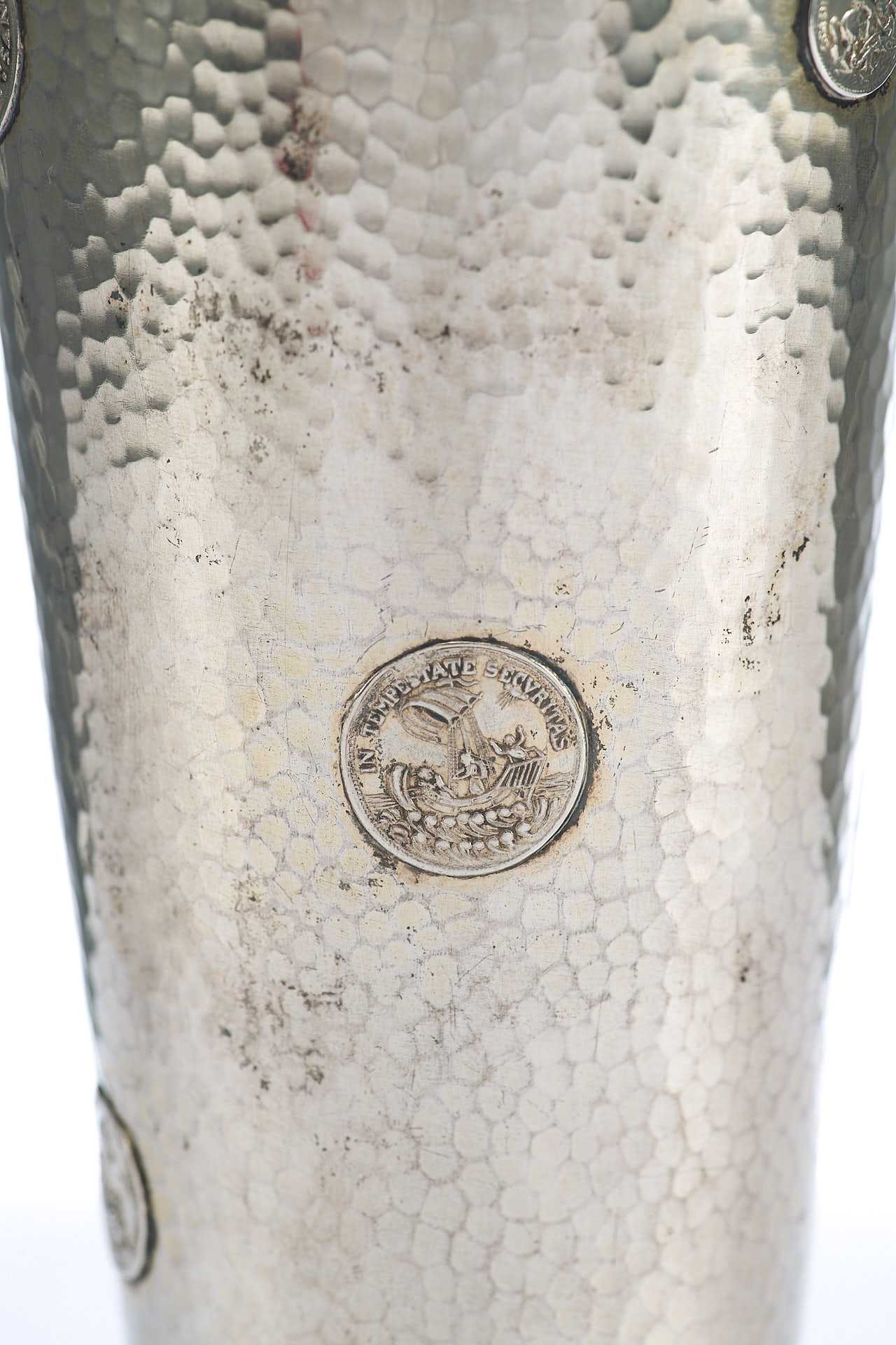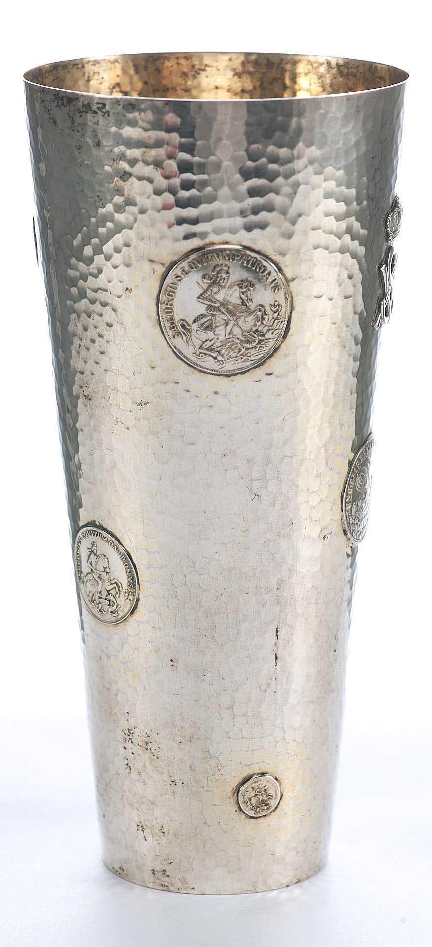Представлен кубок с фактурной поверхностью, украшенный изображениями аверса и реверса амулета моряков изображающего на одной стороне снятого Георгия поражающего копьем дракона с надписью: «ST. GEORGIUS EQUITUM РATRONUS» Святой Георгий, справедливый заступник); на другой стороне изображение корабля под парусом в море с моряками с надписью: «IN TEMPESTATE SECURITAS» (В ненастье (грозу) защита).