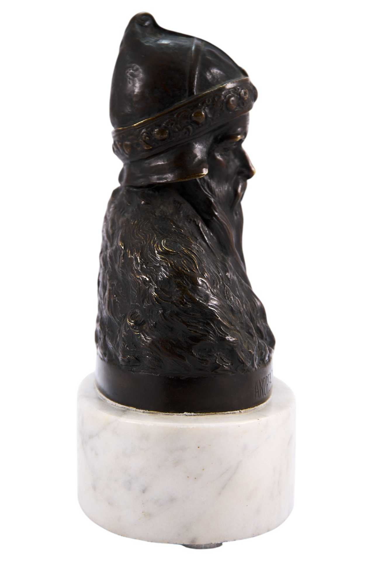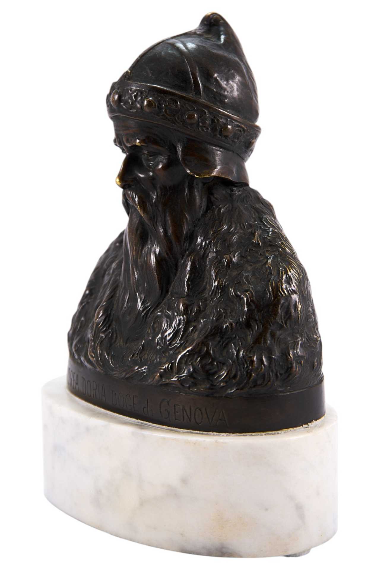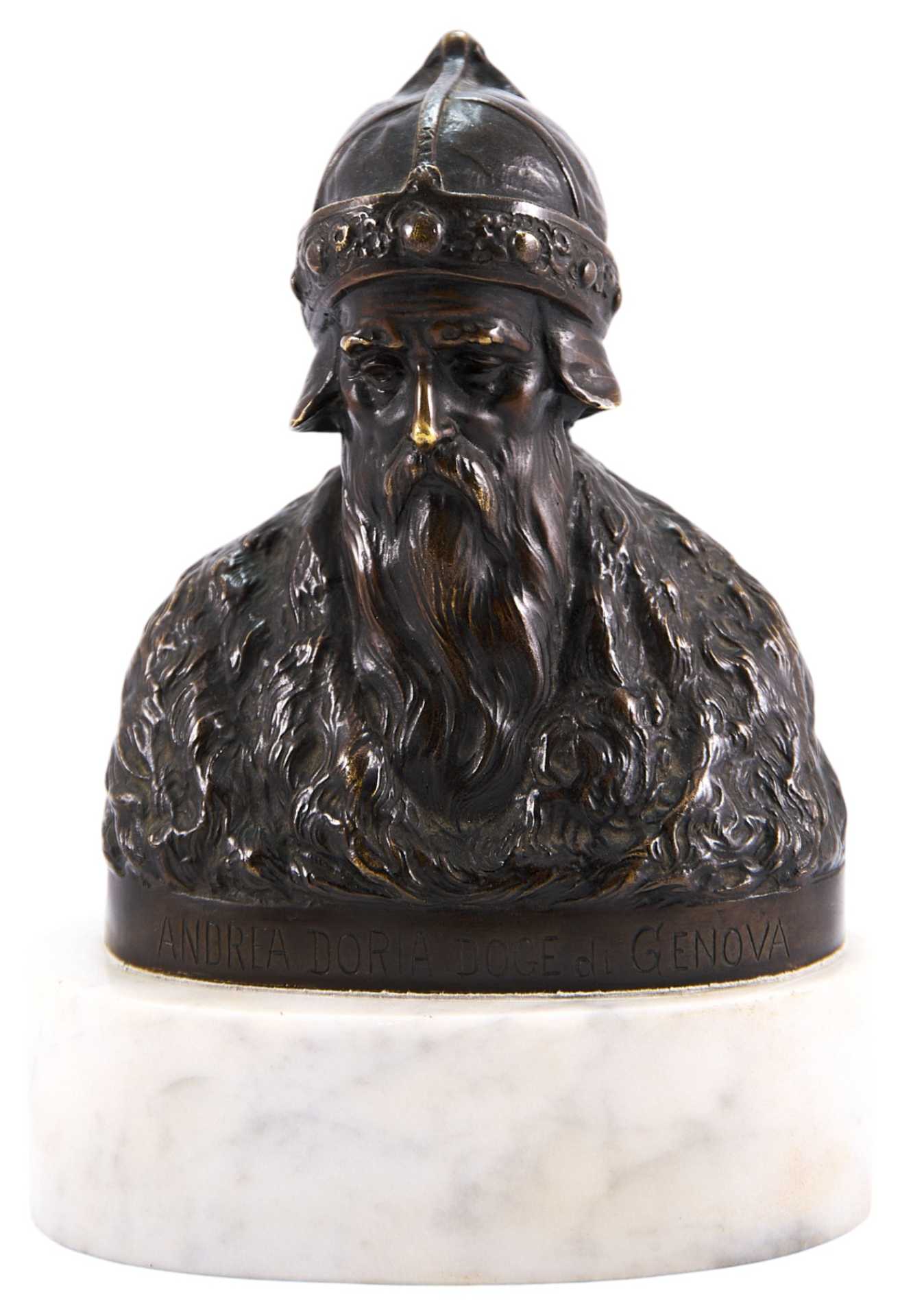 На бюсте имеется подпись: «Andrea Doria Doge di Genova». Скулытгура представляет собой пример кабинетной пластики рубежа XIX - начала XX вв. довольно популярной в Европе, предположительно, в Италии. Андреа Дориа (итал. Andrea Doria’, 21 [30] ноября 1466, Онелья— 15 [25] ноября 1560, Генуя) — генуэзский адмирал и государственный деятель.