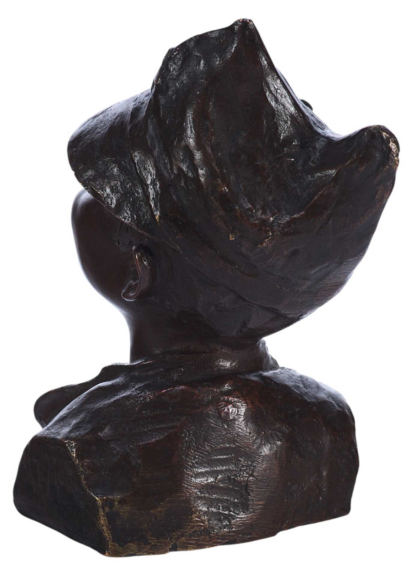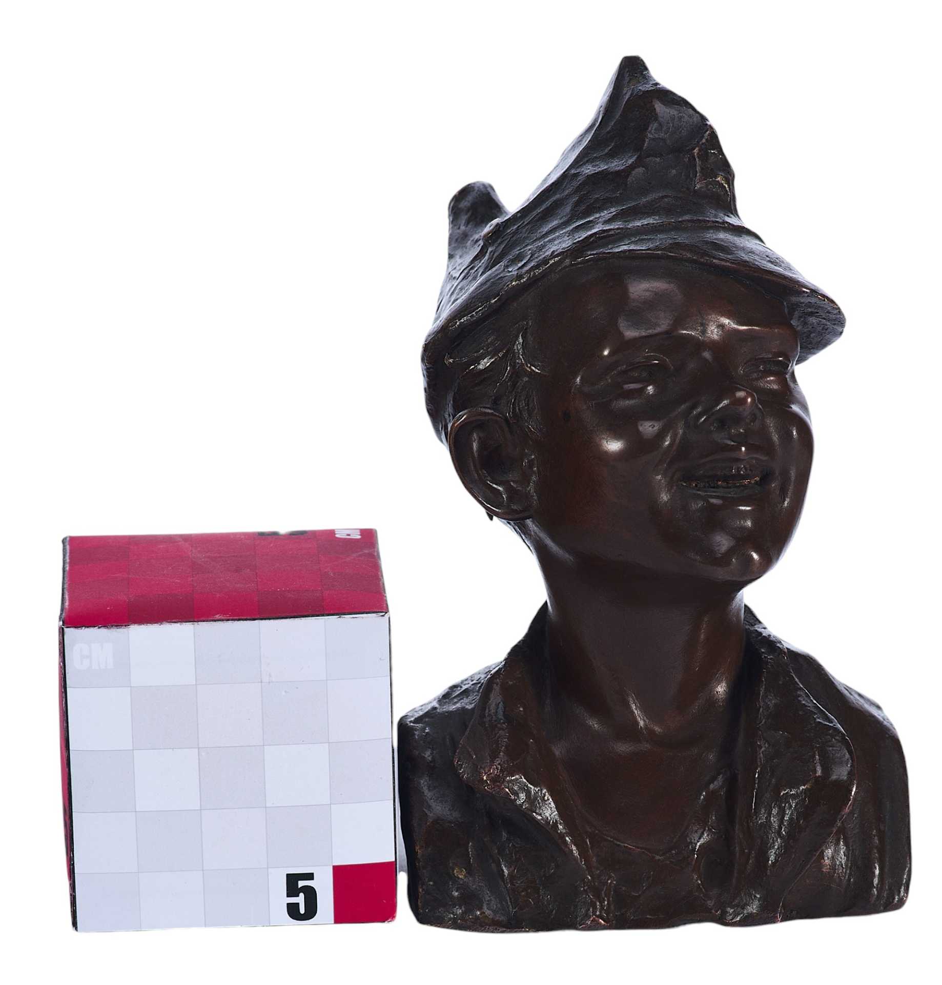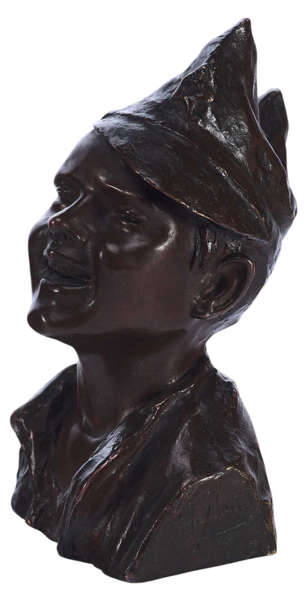 Скульптурный бюст представляющий собою портрет молодого добровольца в летней итальянской фуражке, например, такие головные уборы входили в состав формы одежды танковых корпусов. Фуражка была распространена в i итальянских войсках с 1939-1945 гг. На основании скульптурного бюста имеется подпись автора: «Molta...».