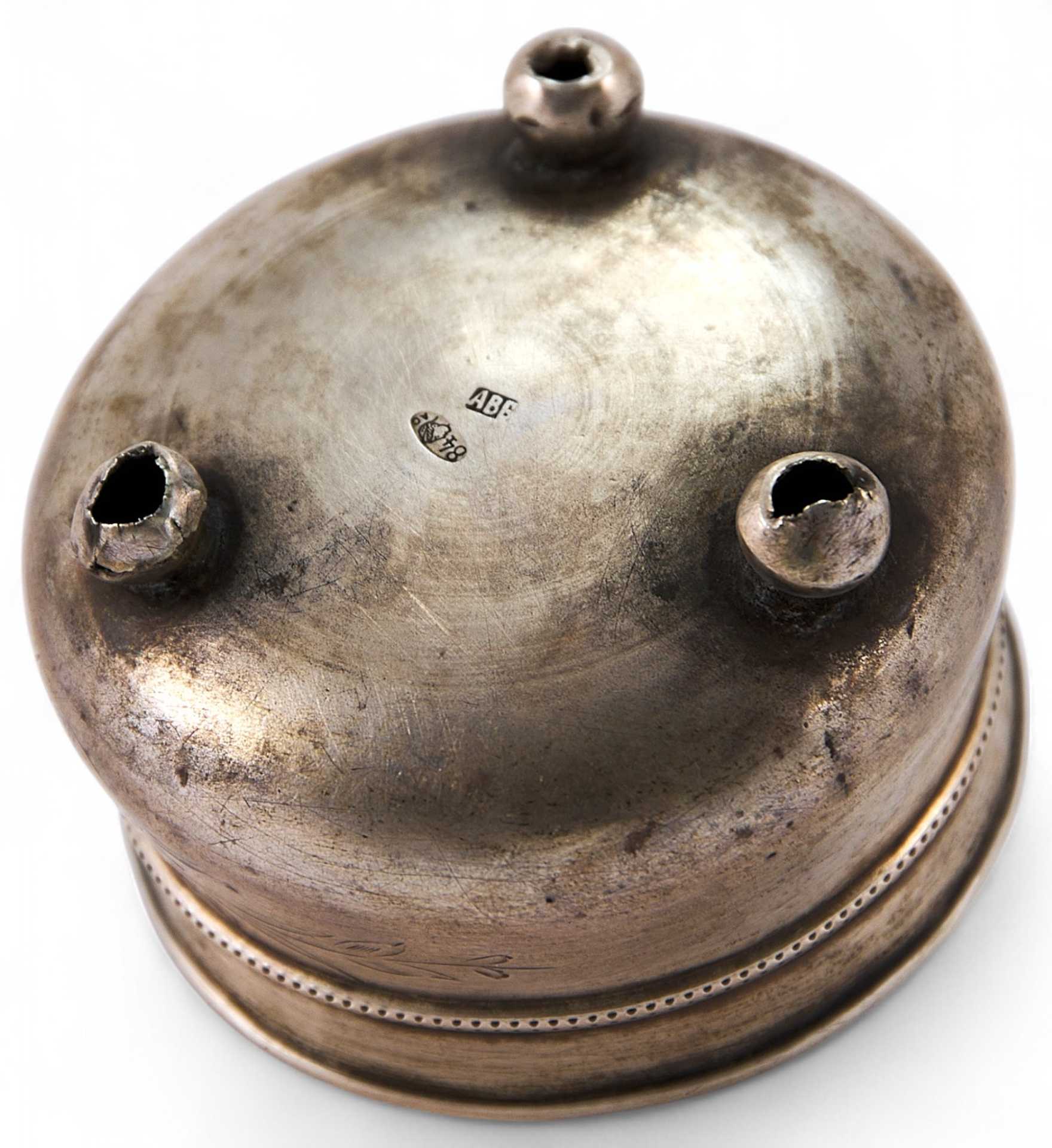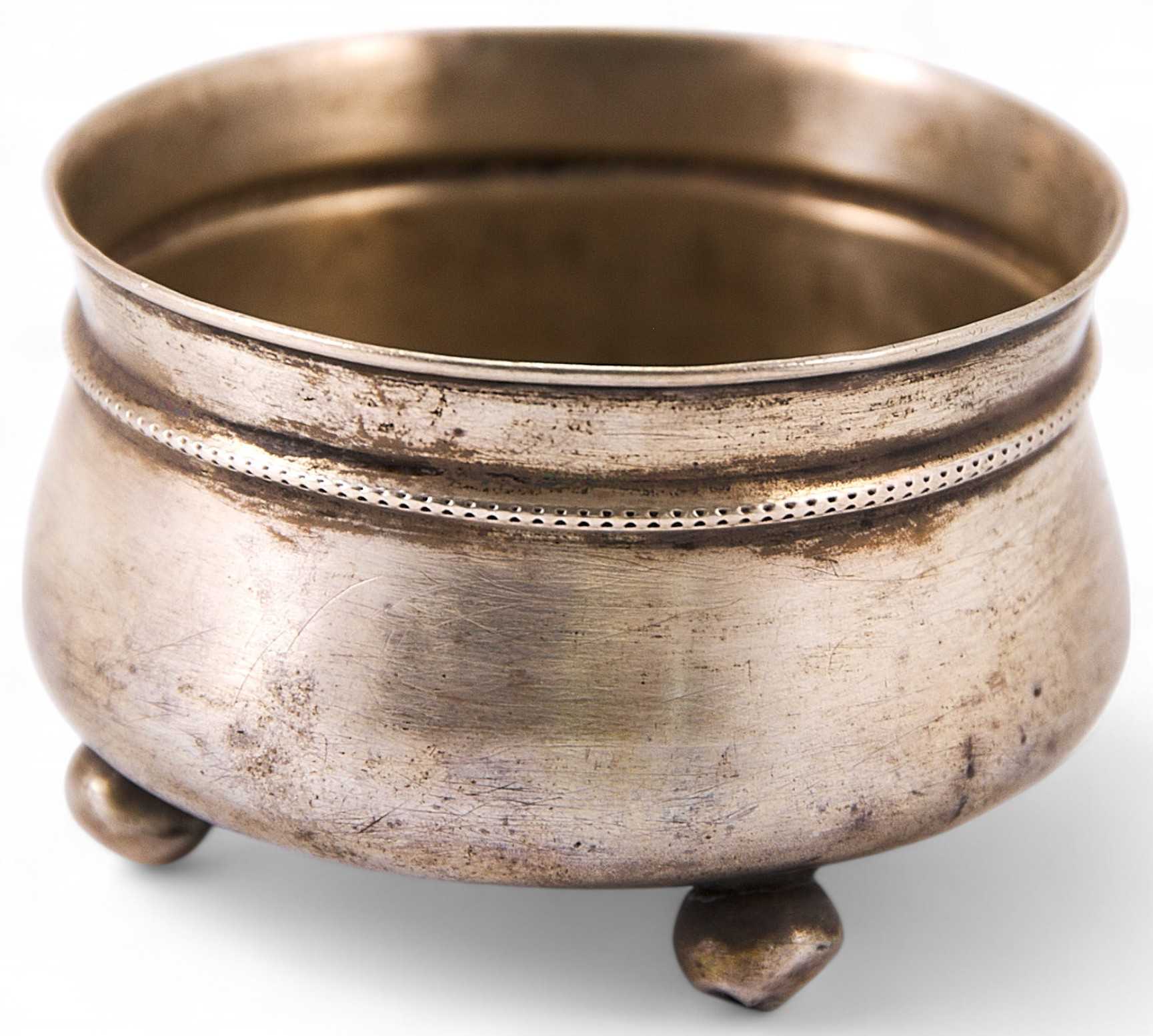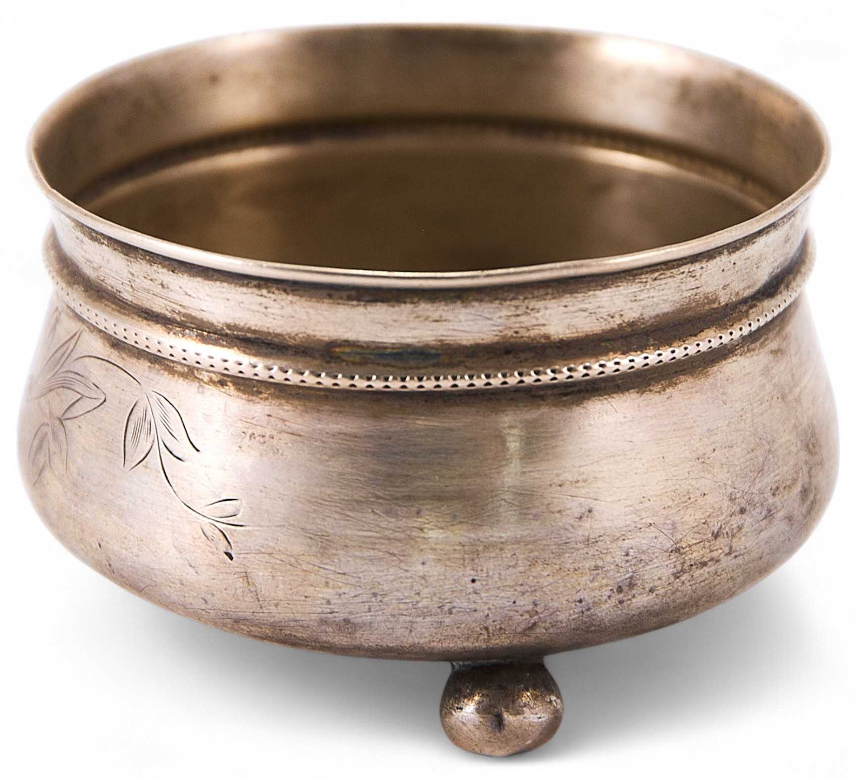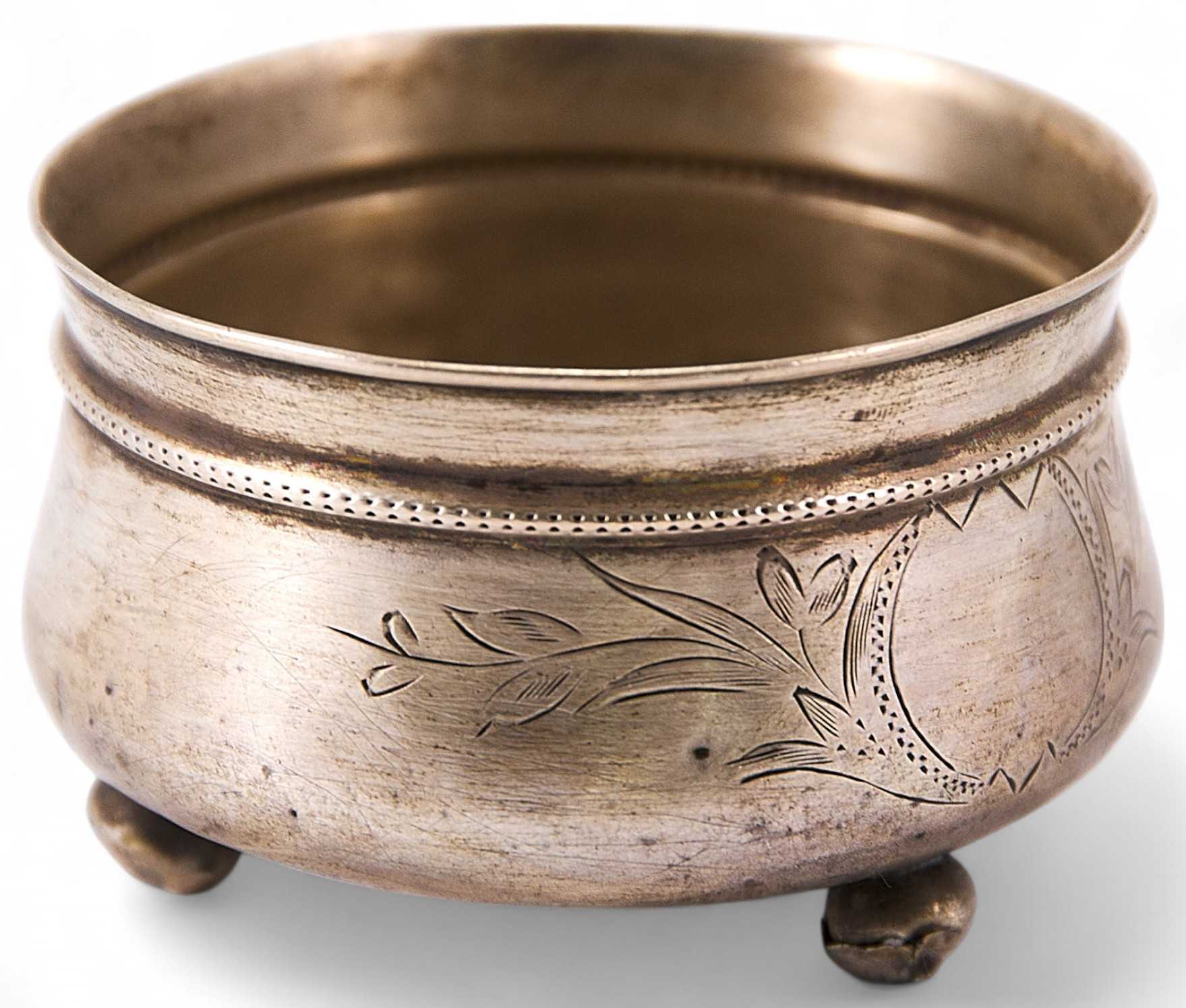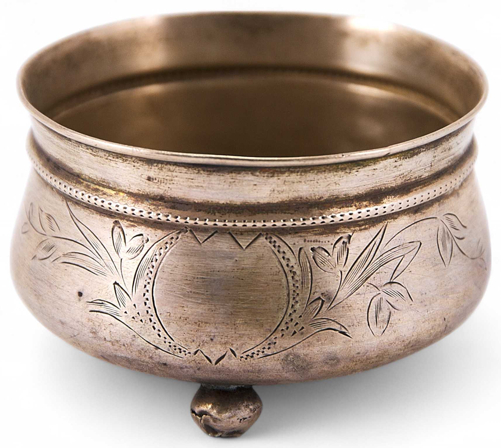 Солонка круглой формы на трех ножках в виде шариков, с расширением книзу, «пережатая» в верхней части выпуклой рельефной полосой выполнена в стилистике модерна. Тулово украшено овальным медальоном, оформленным стилизованными растительными элементами. Предмет выполнен на хорошем техническом уровне.