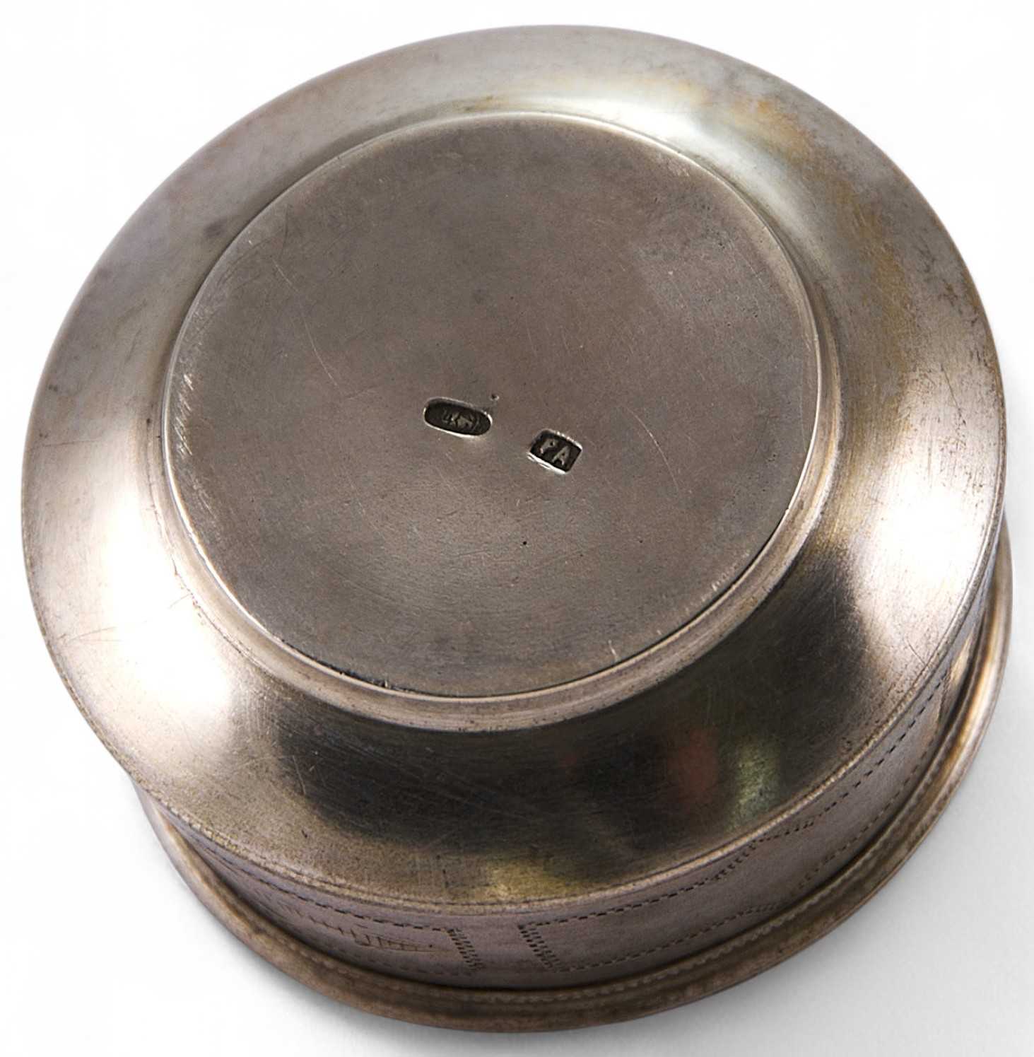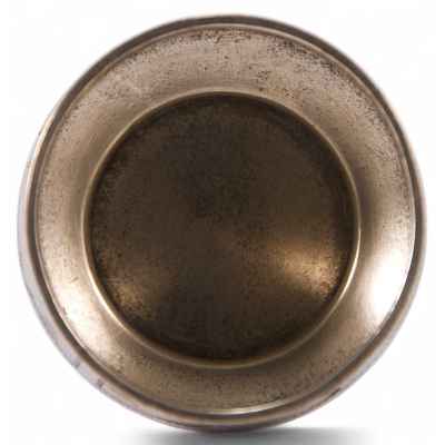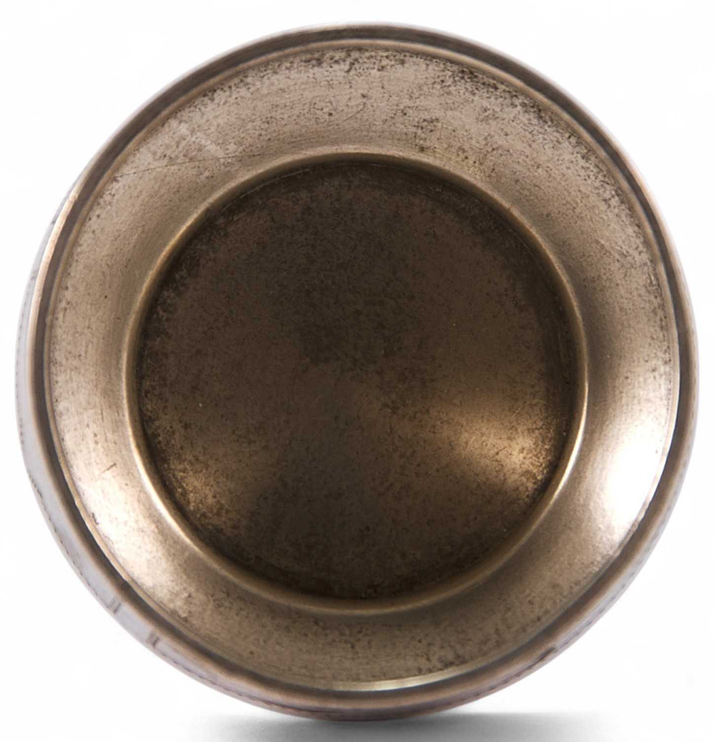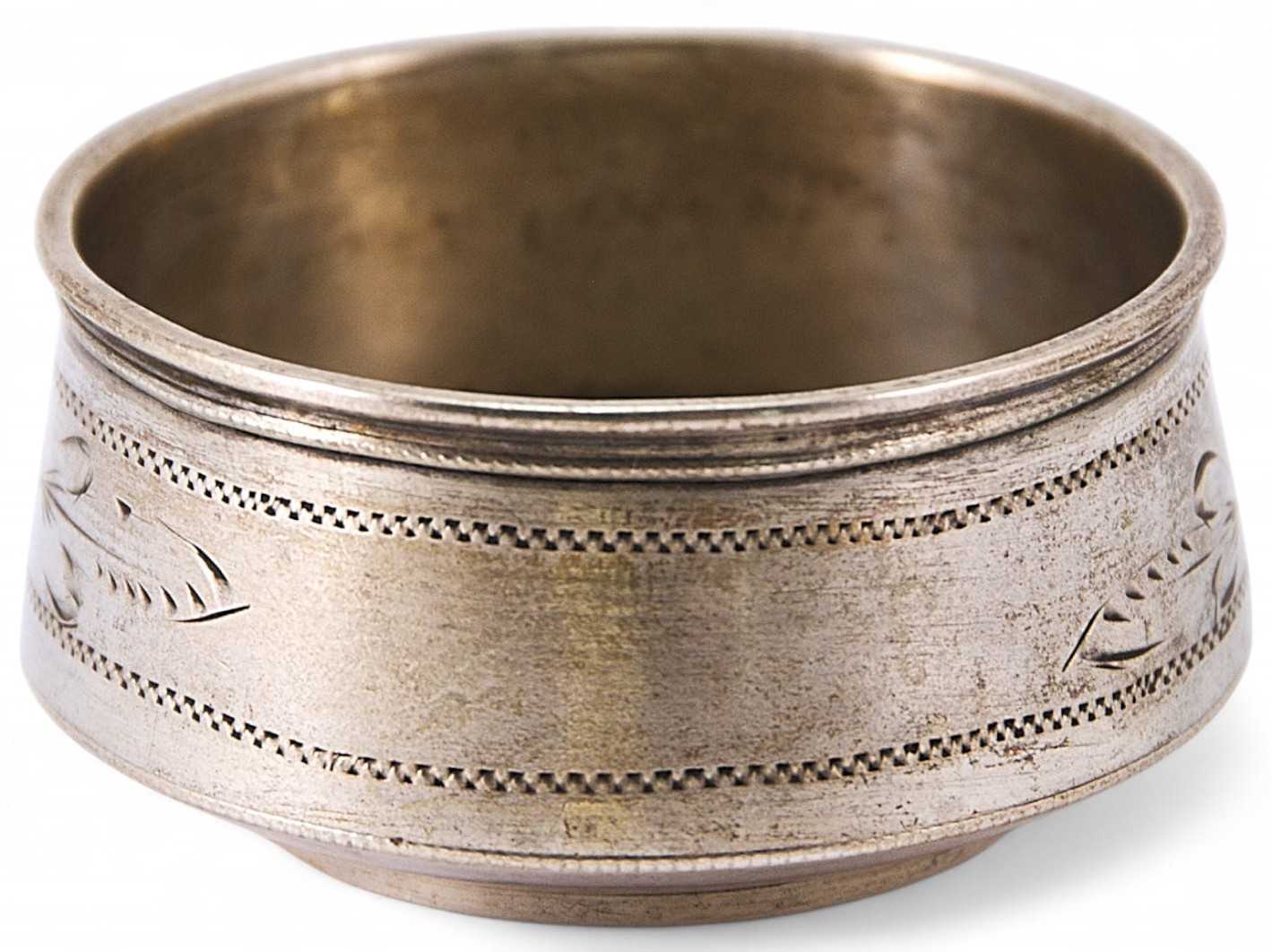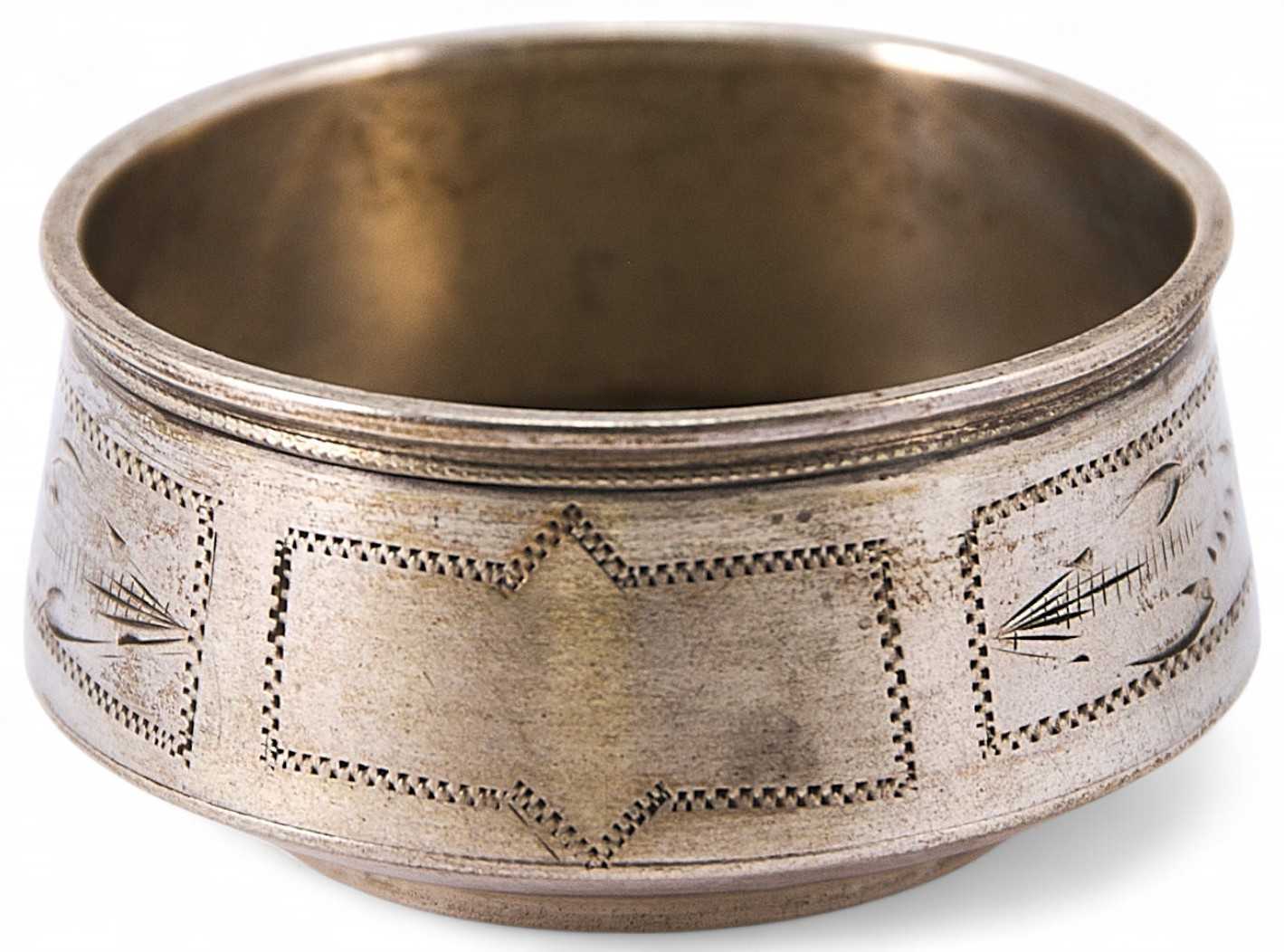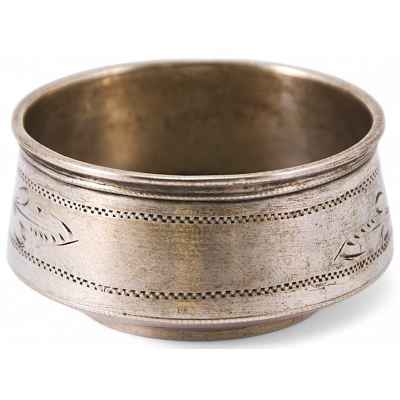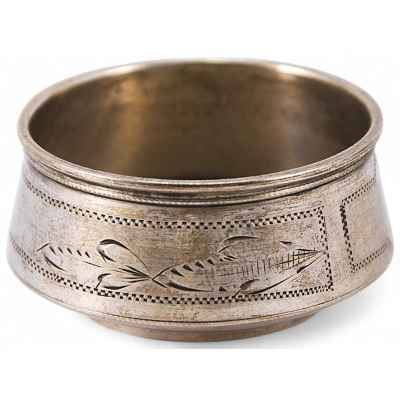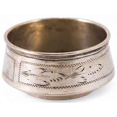 Солонка круглой формы, с расширением книзу, с небольшим бортиком в верхней части выполнена в стилистике модерна. Тулово украшено плоскостным стилизованным декором с использованием растительных элементов. Полоса декора нанесена методом гравировки и заключена в своеобразную прямоугольную раму по всему периметру. Предмет выполнен на хорошем техническом уровне.