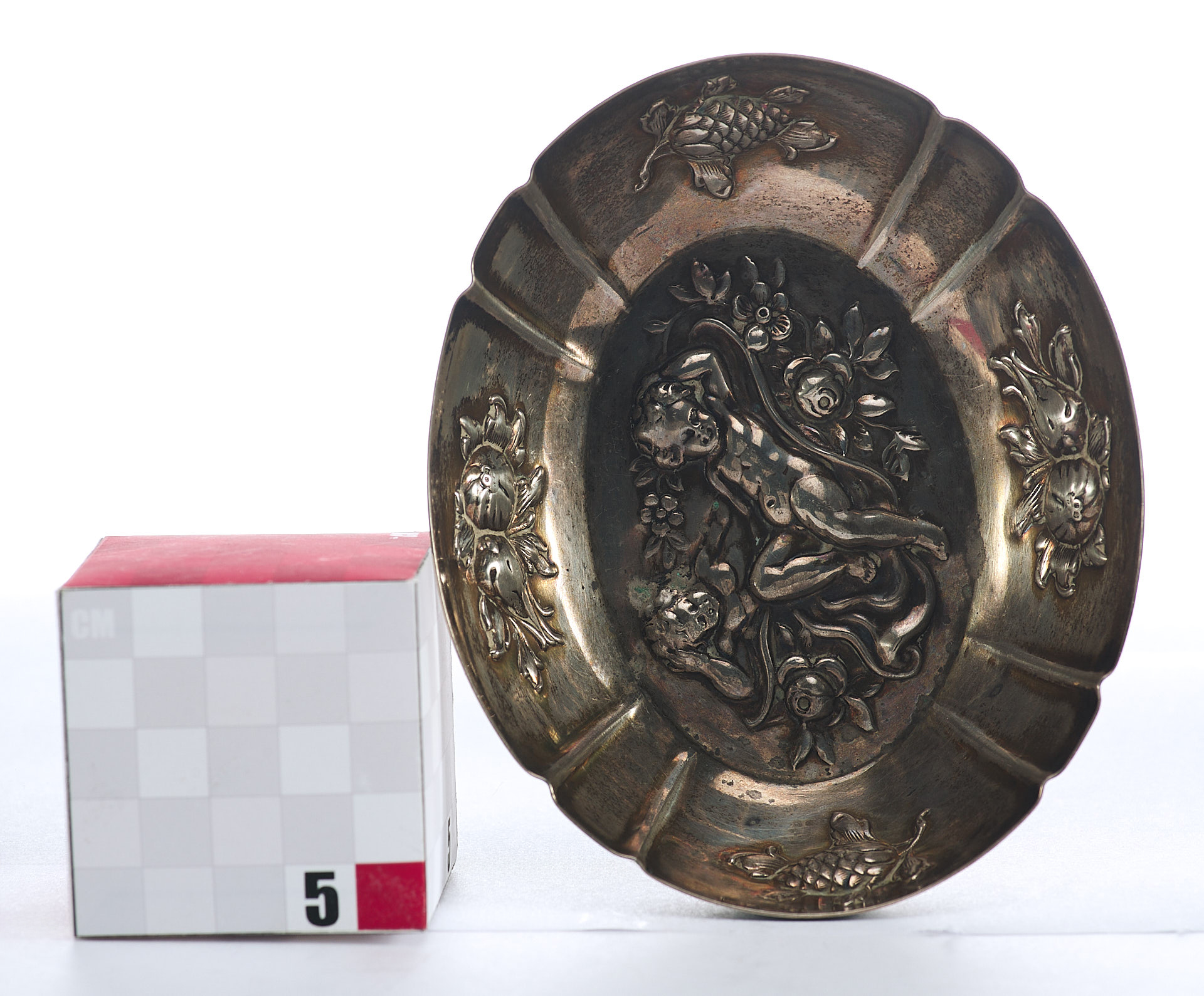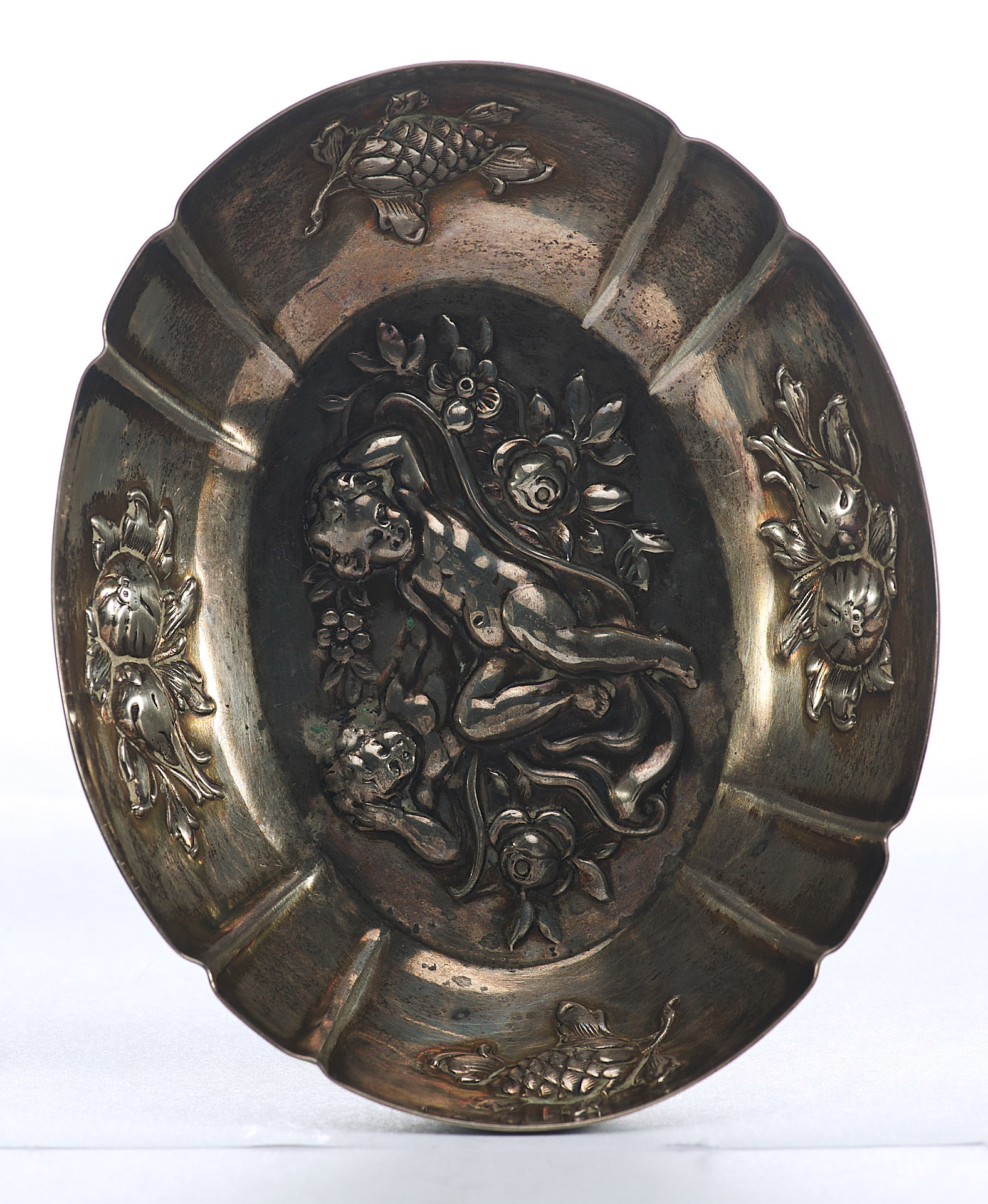 Представлена глубокая ваза овальной формы, «зеркало» которой украшено изображением спящих путти на покрывале, постеленном на цветах. По краям рельефные изображения завязи rраната и шишки.