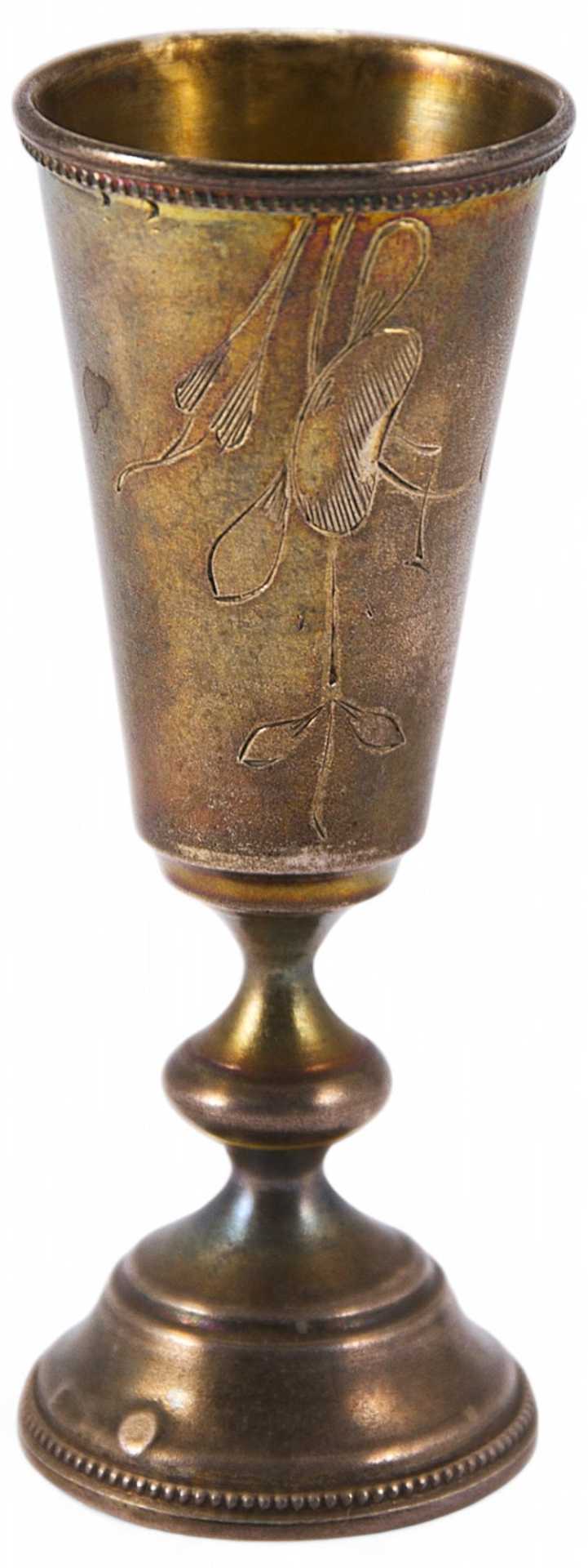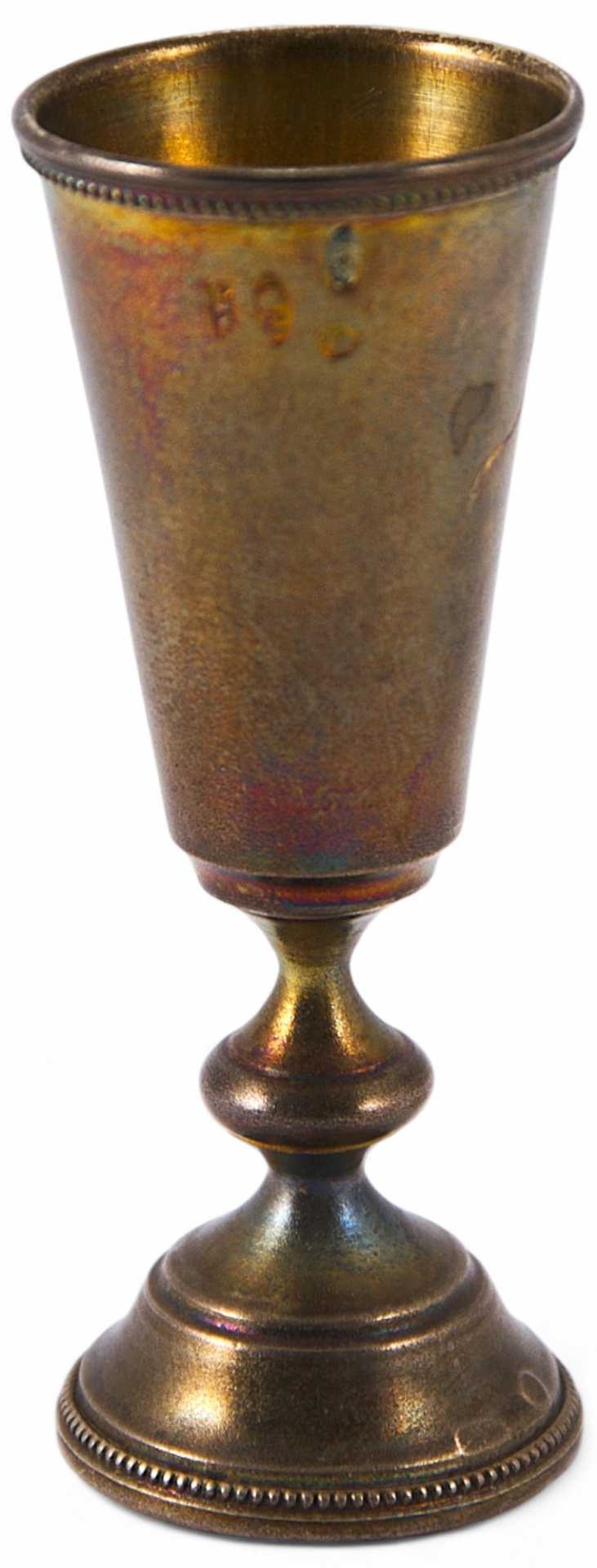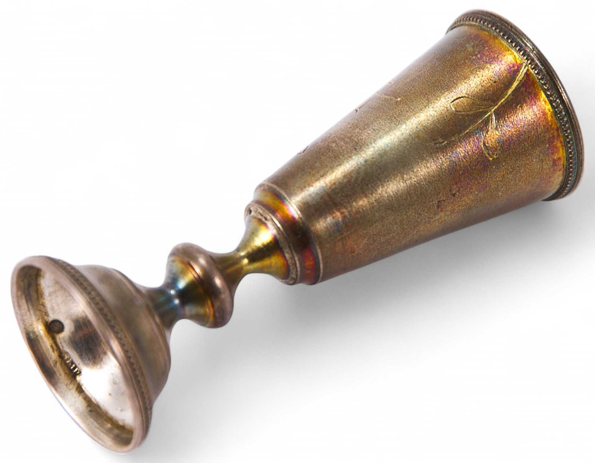Клейма подлинные. Их наличие, а также стилистические особенности позволяют установить, что рюмочка была изготовлена указанным мастером, в 1908-1917 гг.