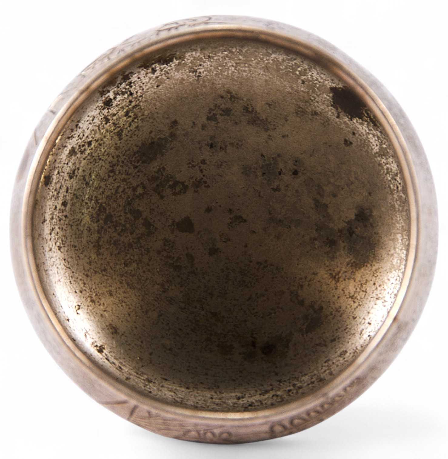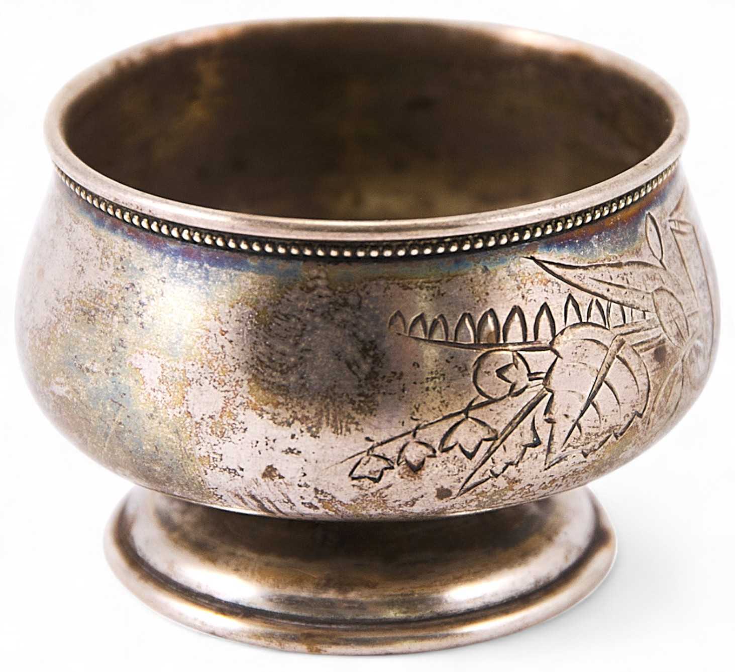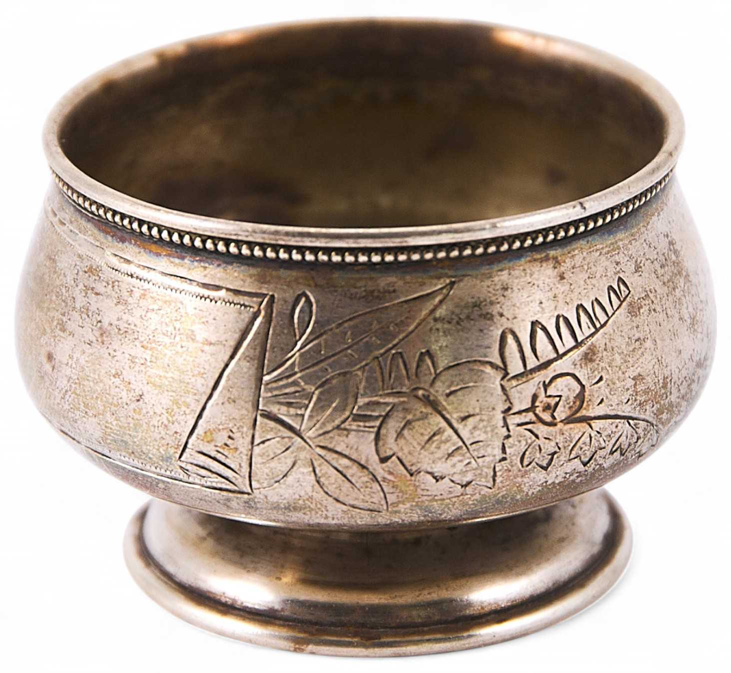 Солонка круглой формы, с расширением книзу, на невысокой ножке и круглом основании выполнена в стилистике модерна. Тулово украшено плоскостным растительным декором с медальоном в виде стилизованного свитка, предназначенным для дарственной надписи либо инициал владельца. Декор нанесен методом гравировки.