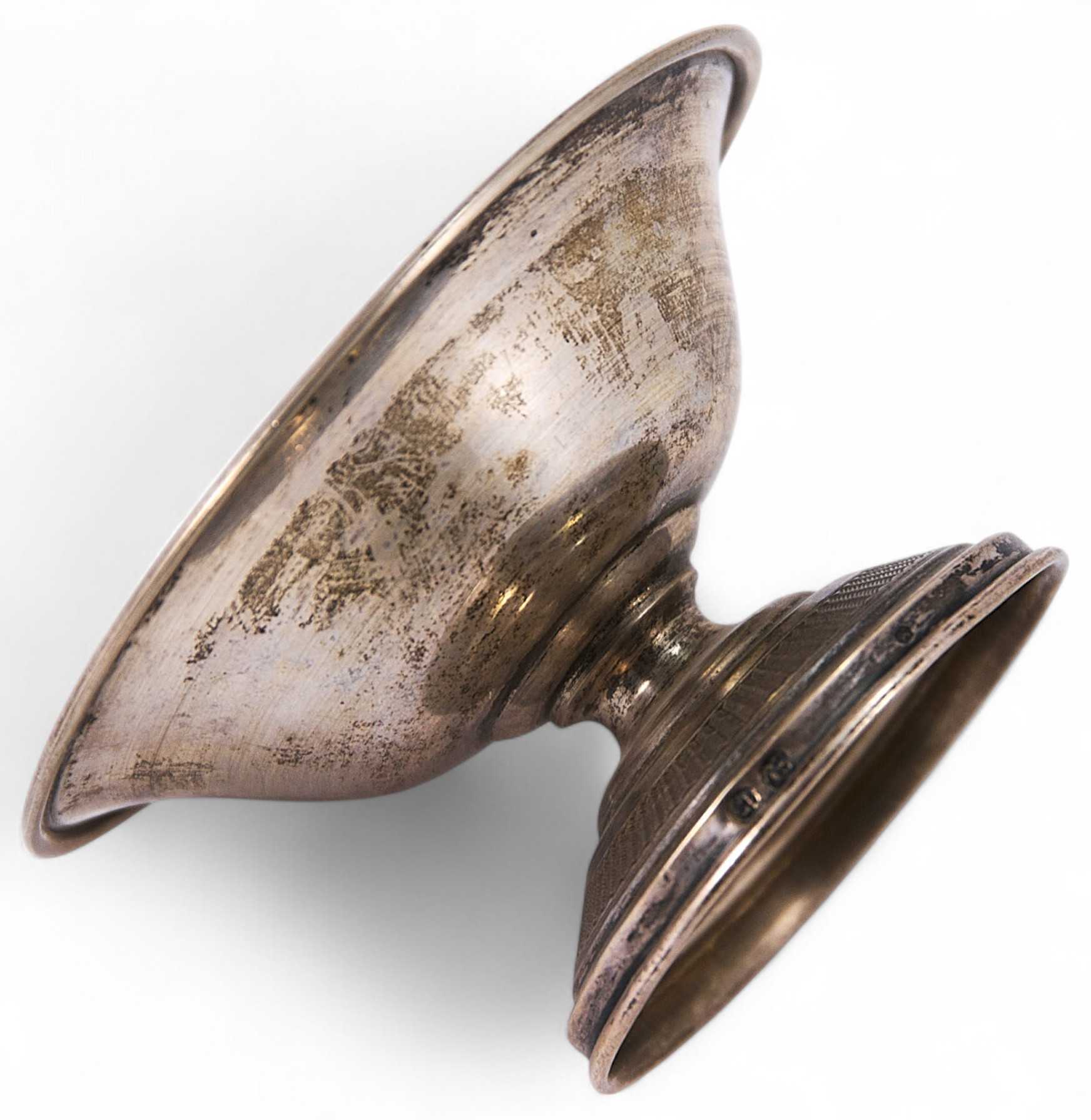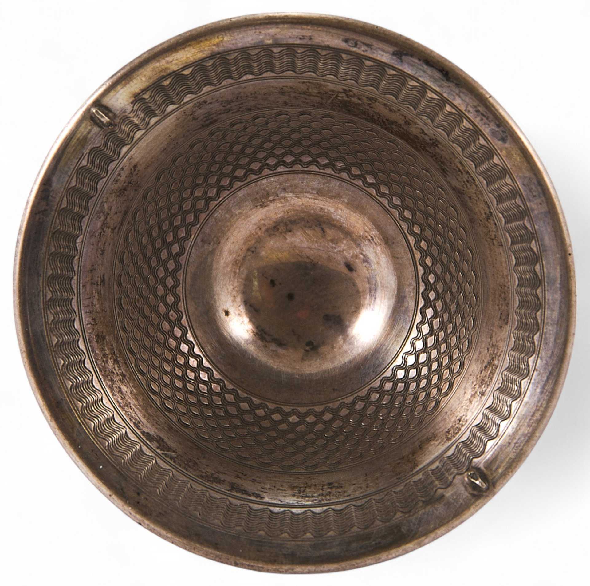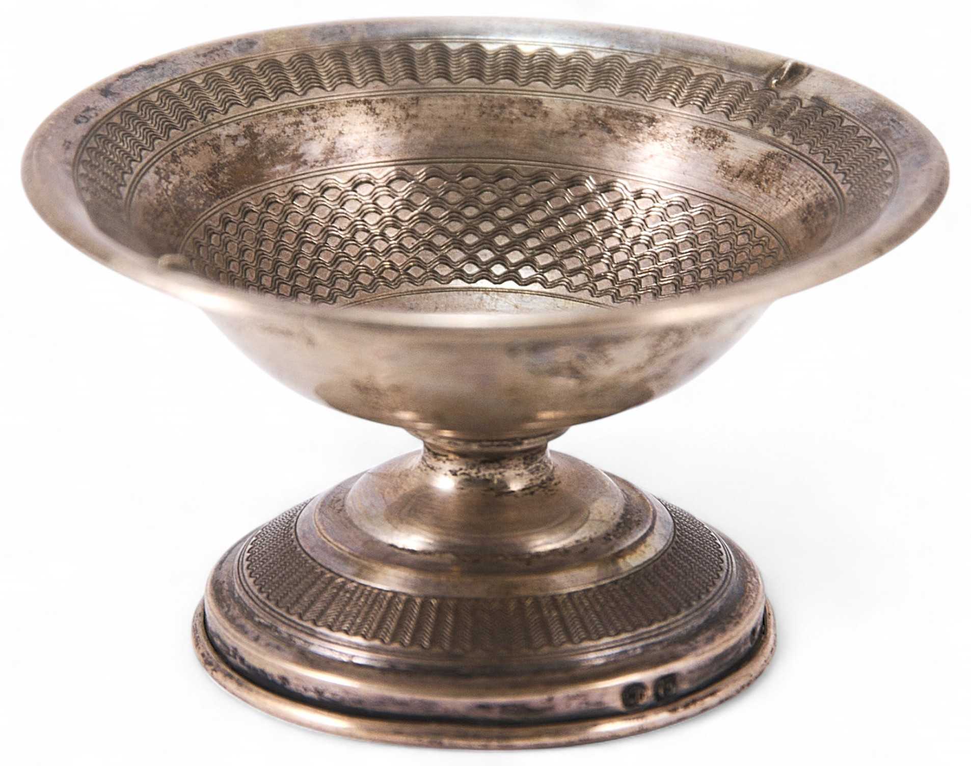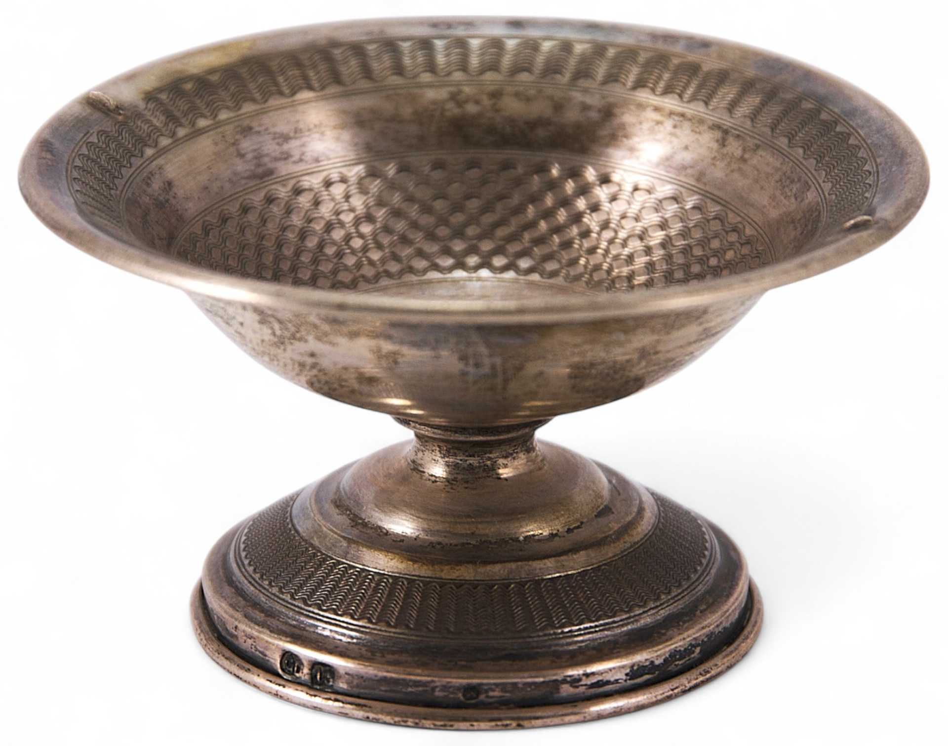 Представлена серебряная солонка. Поверхность солонки украшена гильошированием.