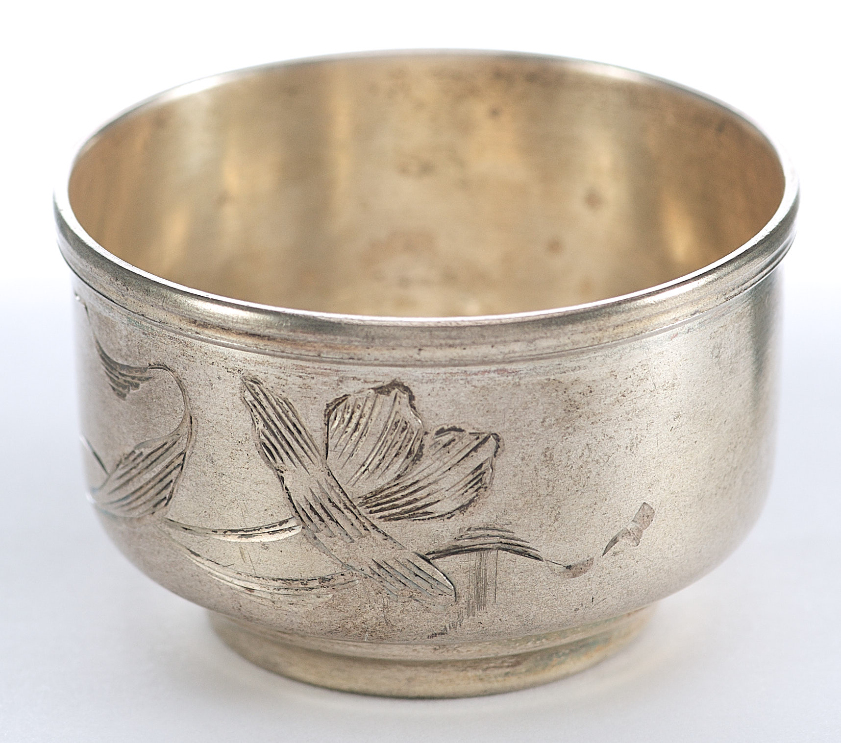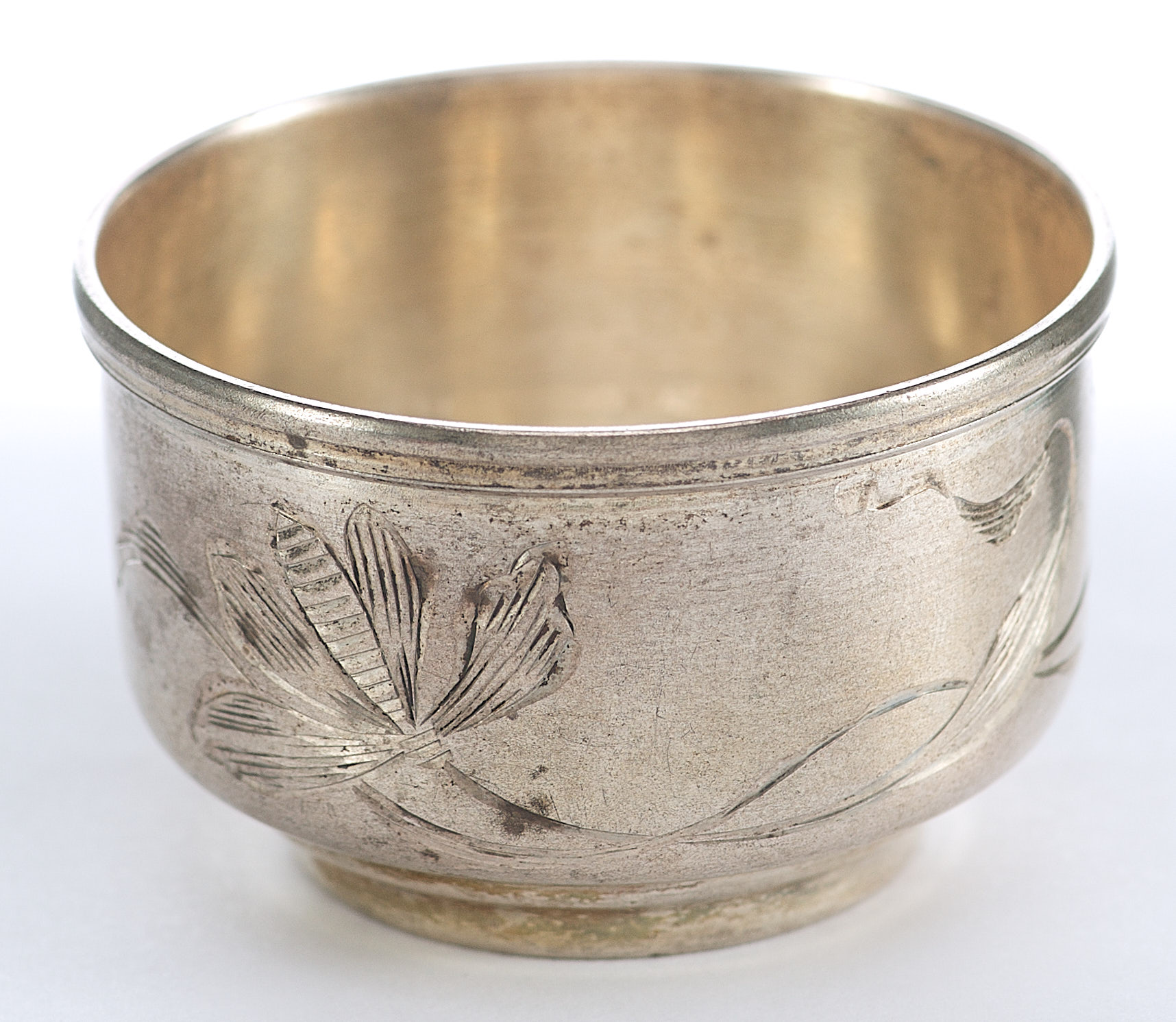 Представлена серебряная солонка украшенная декором в стиле модерн.