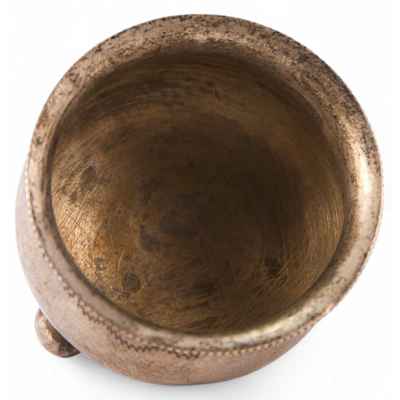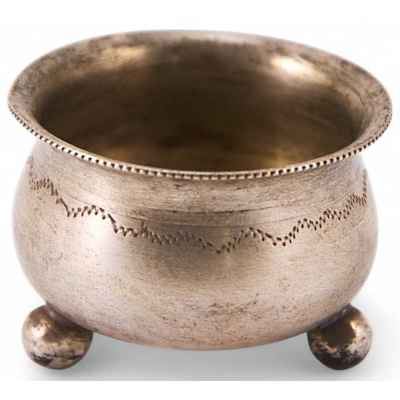 Солонка круглой формы, зауженная к верхней части, на трех шаровидных ножках, с небольшим бортиком практически лишена декора. Простая лаконичная форма тулова дополнена линией зигзагообразного пунктира в верхней трети. Предмет выполнен на хорошем техническом уровне.