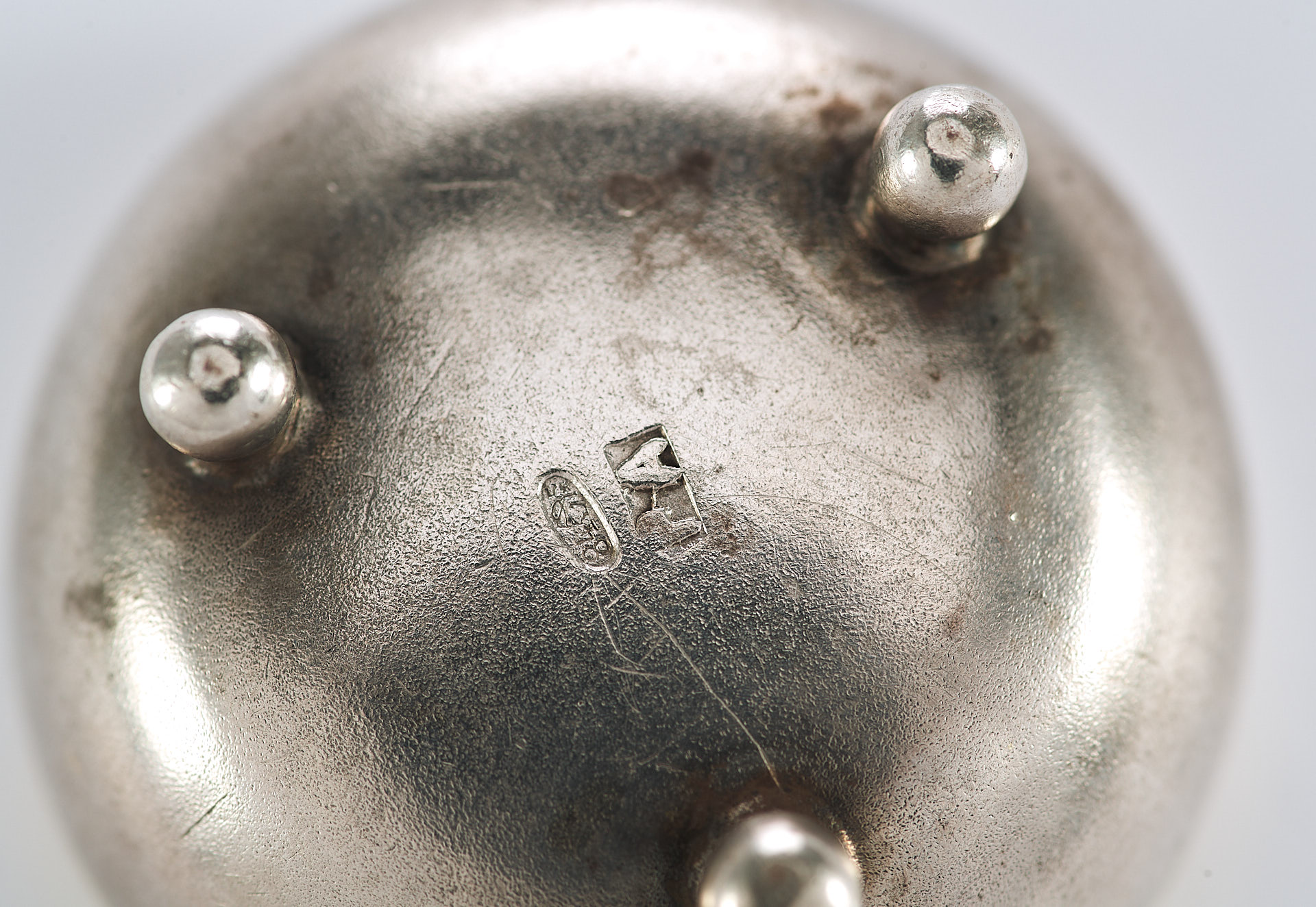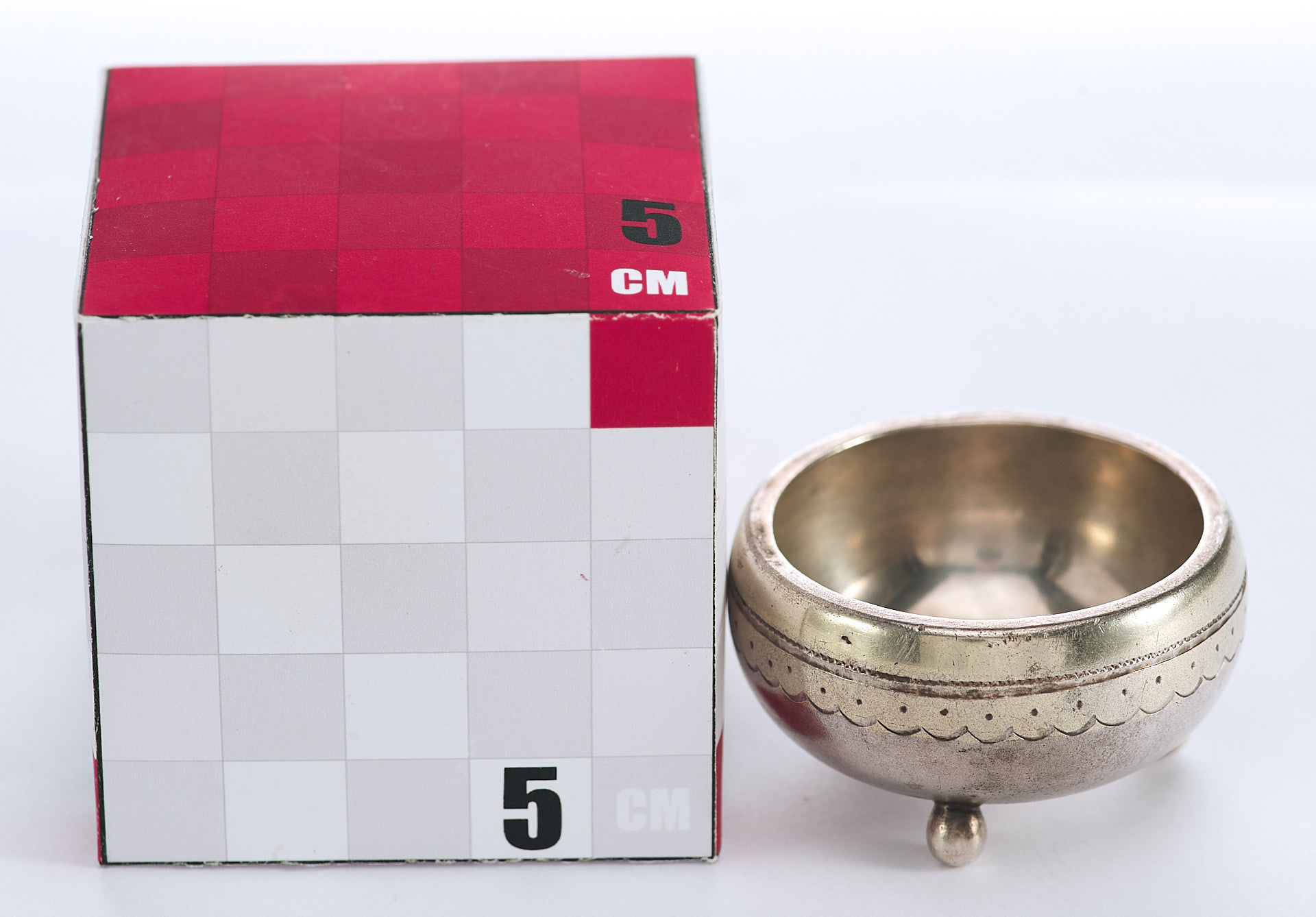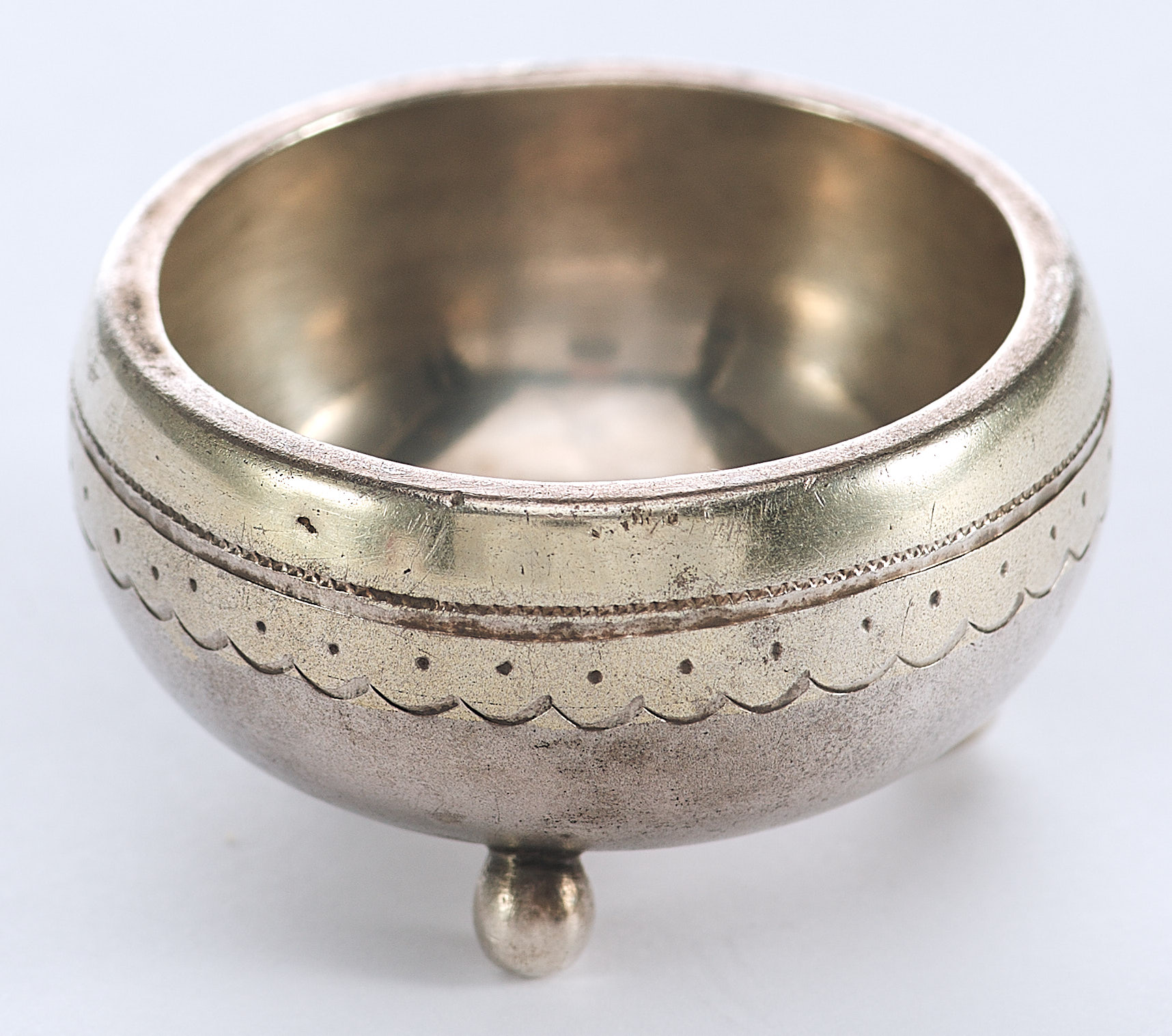 Представлена серебряная солонка на трех круглых ножках, украшенная декоративной каймой.