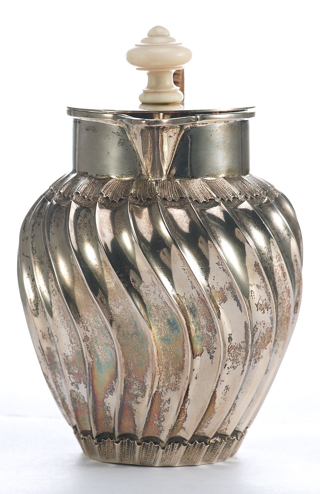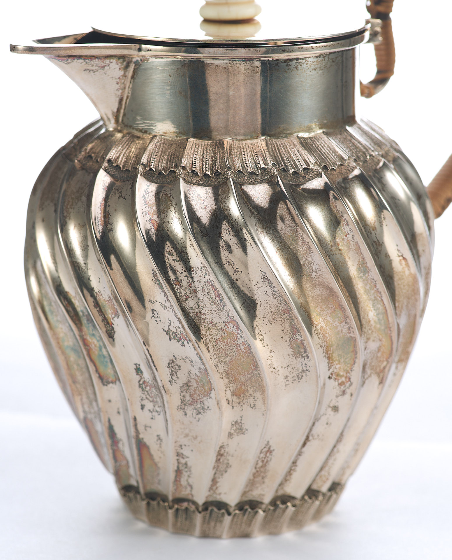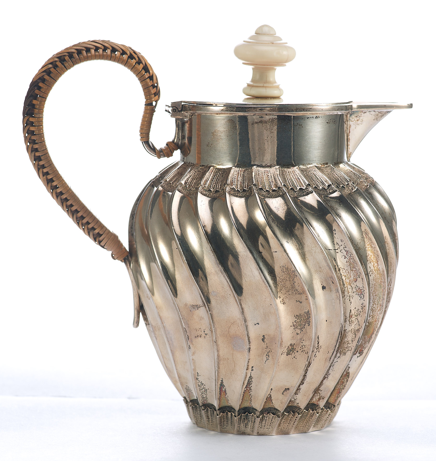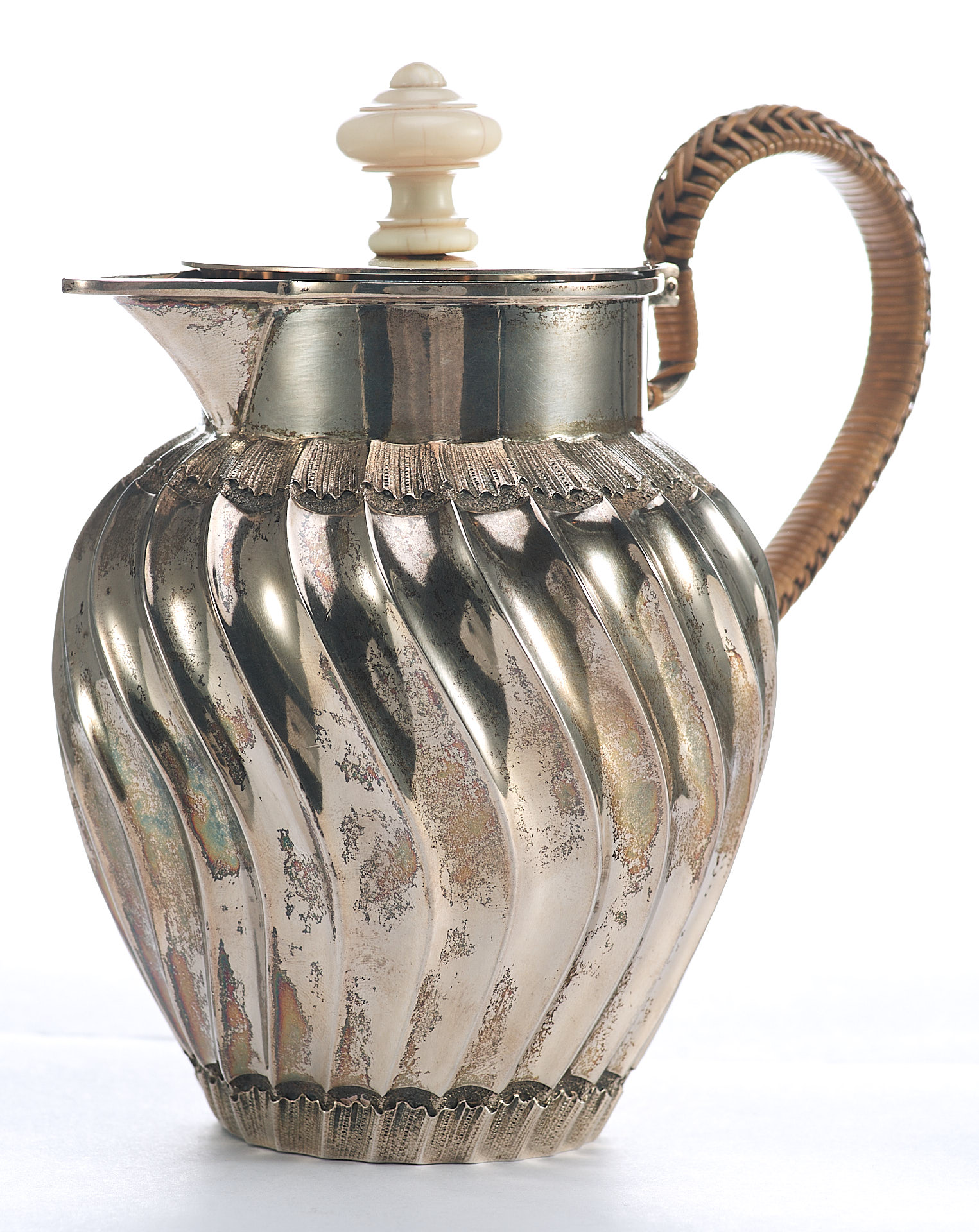 Представлен кувшин с откидной крышкой. Ручка крышки сделана из кости. Тулову кувшина придан вид волнистой