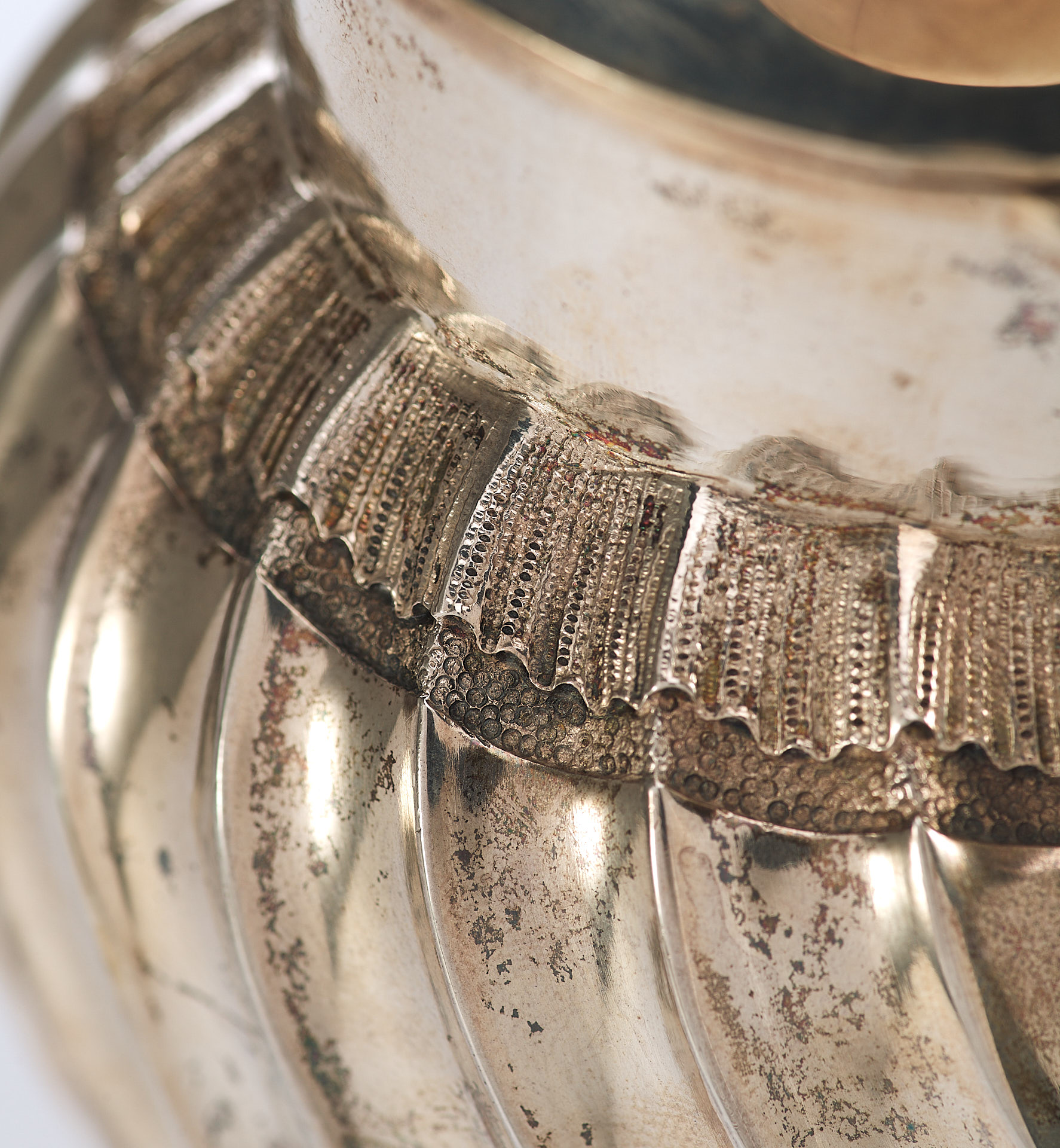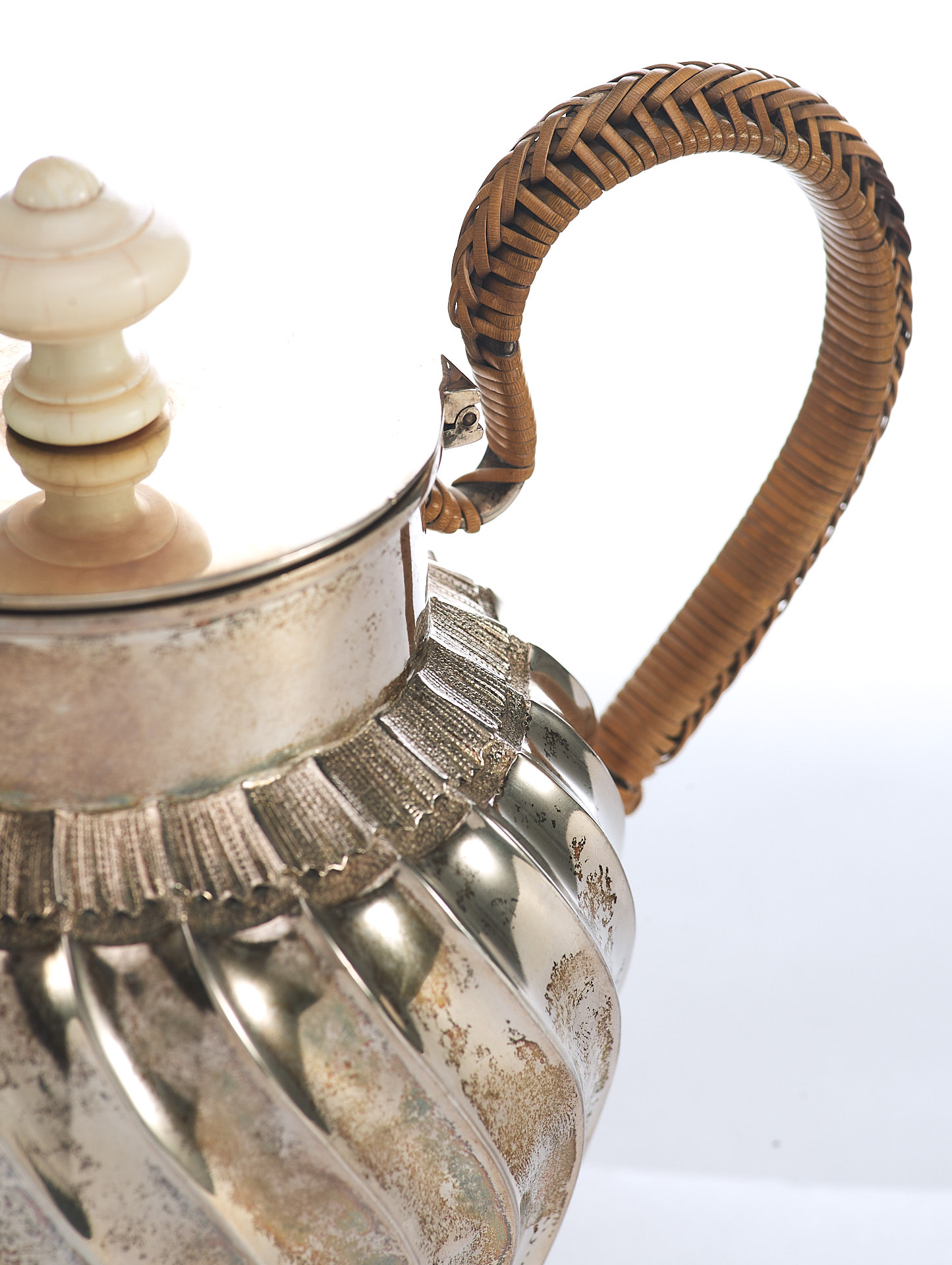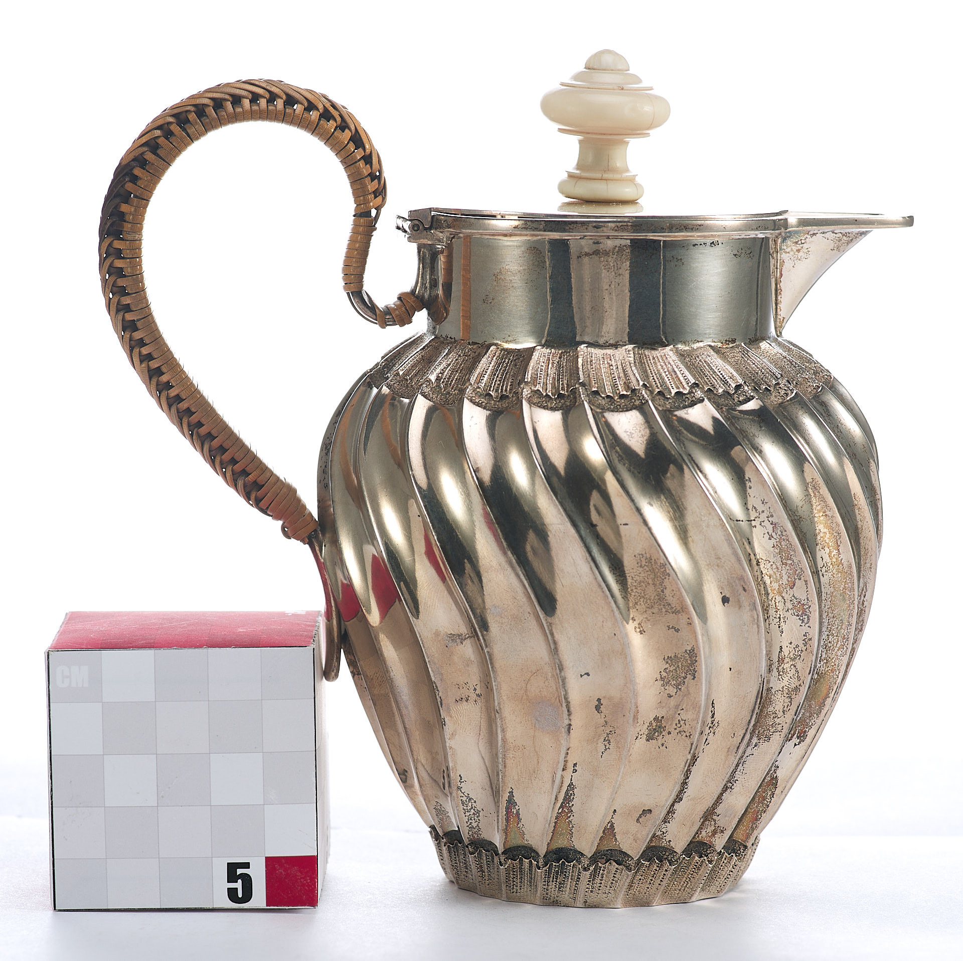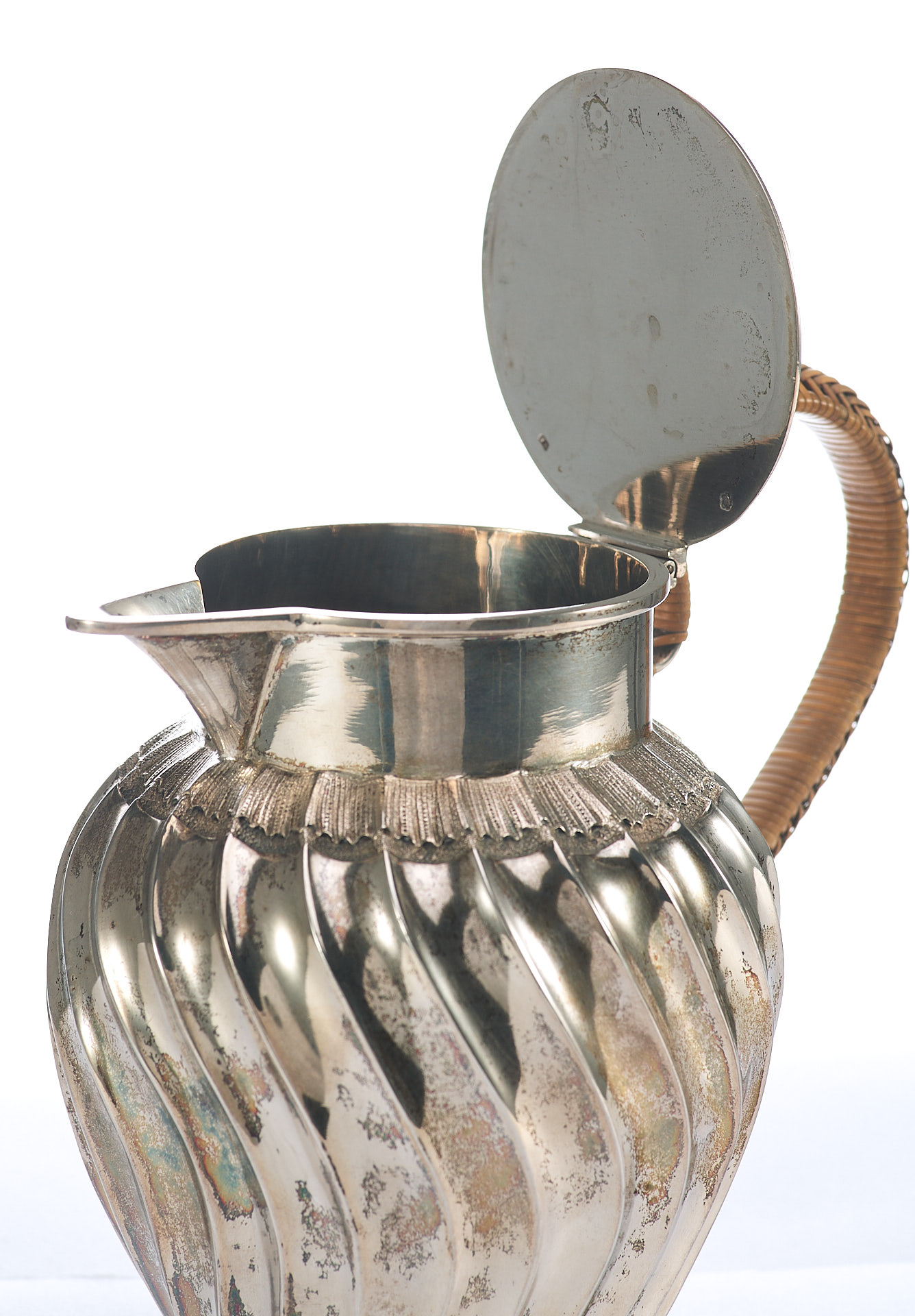 Представлен кувшин с откидной крышкой. Ручка крышки сделана из кости. Тулову кувшина придан вид волнистой