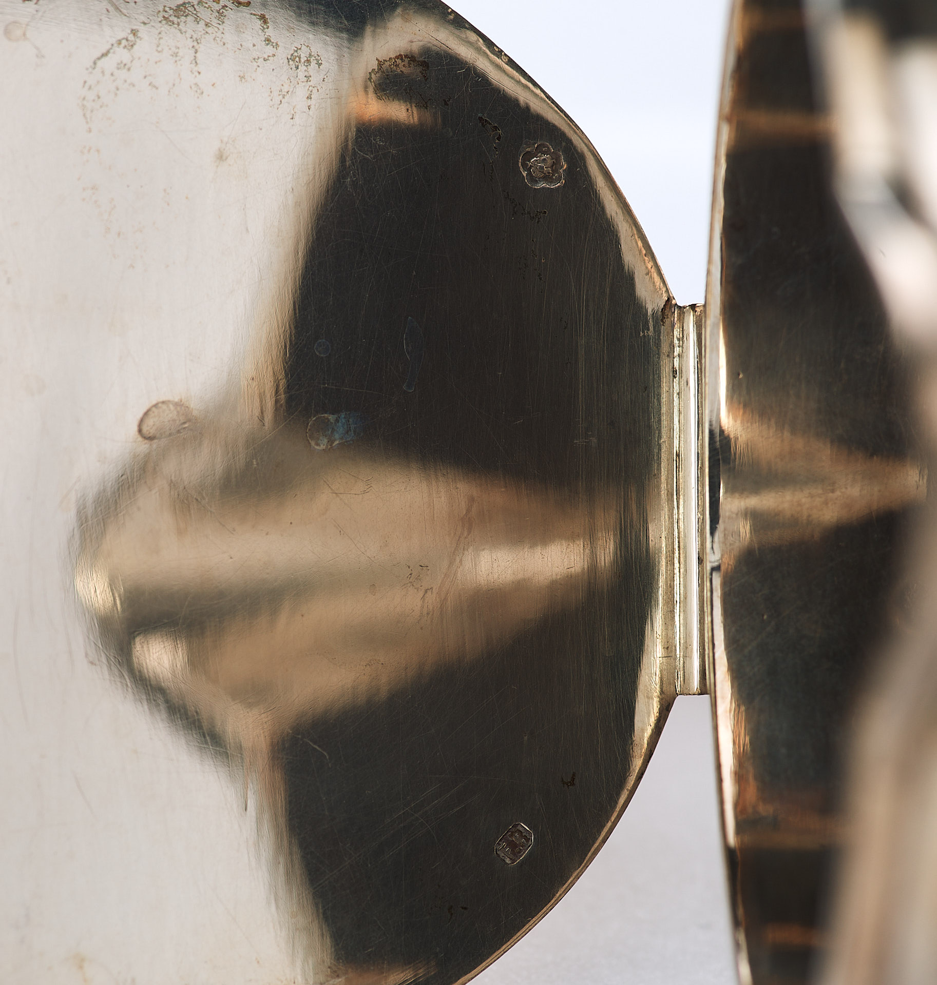 На предмете имеются клейма: 1. Голова Дианы, в пятилепестковом щитке, увенчанная диадемой обращена вправо, с пробирными обозначениями 3, А - клеймо для изделий из серебра 800 пробы, принятое в Австрии с 1872 по 1922 гг. Буква А указывает на то, что изделие изготовлено в Вене. 2. «F.B» — клеймо производителя.
