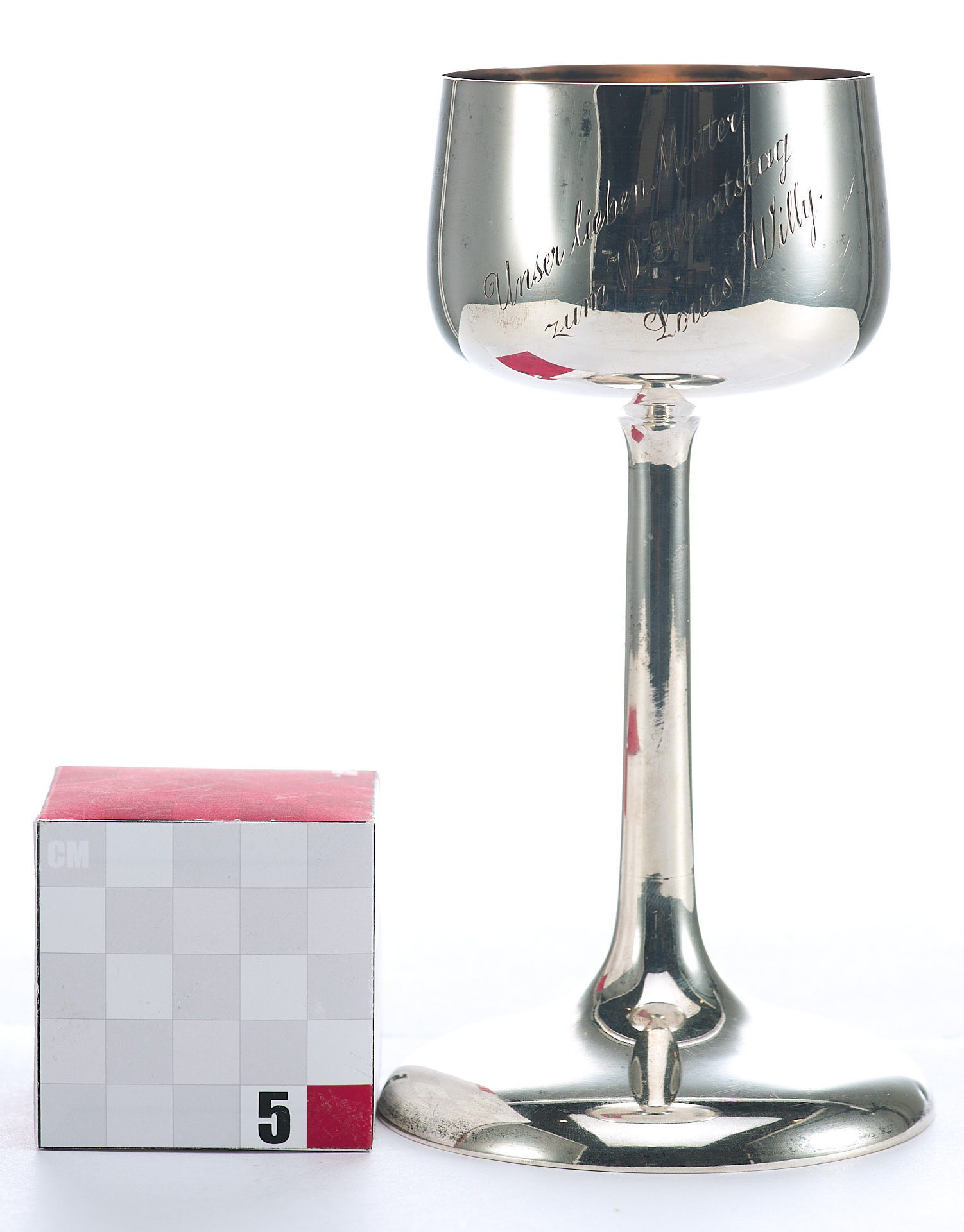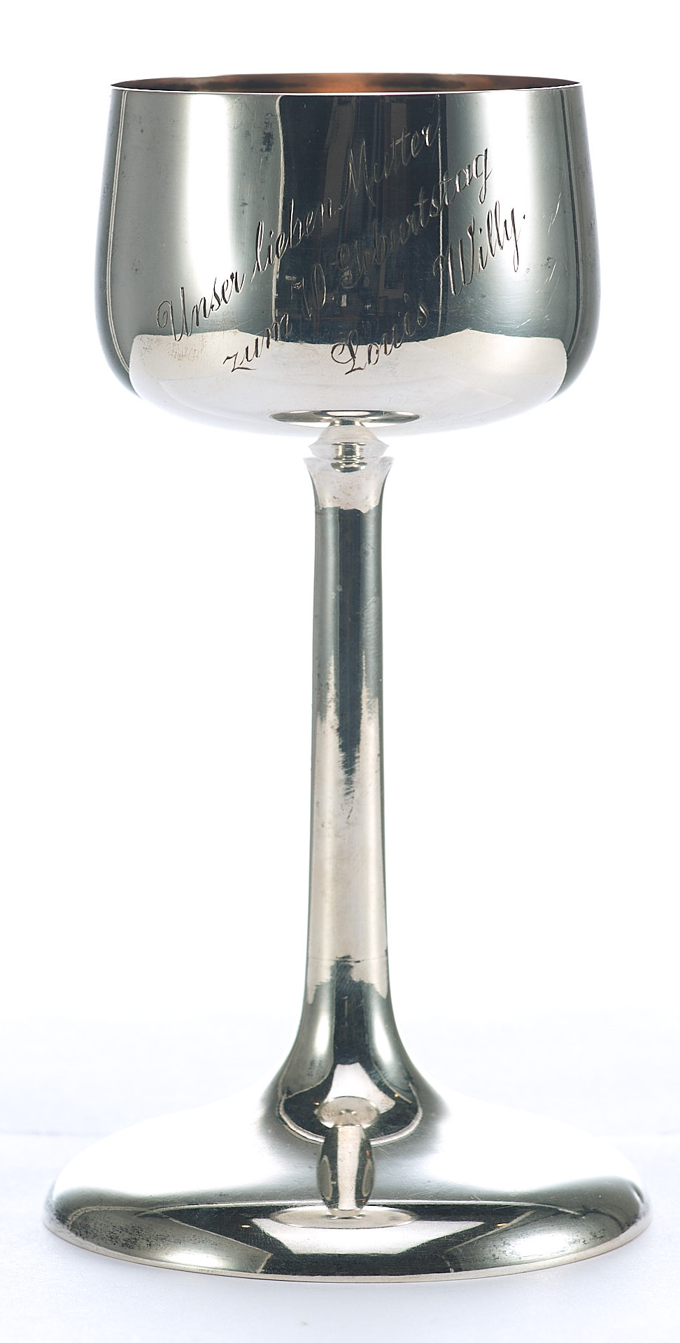 Представлен бокал для вина на высокой ножке. На нем надпись в технике гравировки: Unser lieben Mutter zum 70.Yebertstag Louis Willy", "Нашей дороеой матерu к 70-леmuю Луu Вилли"