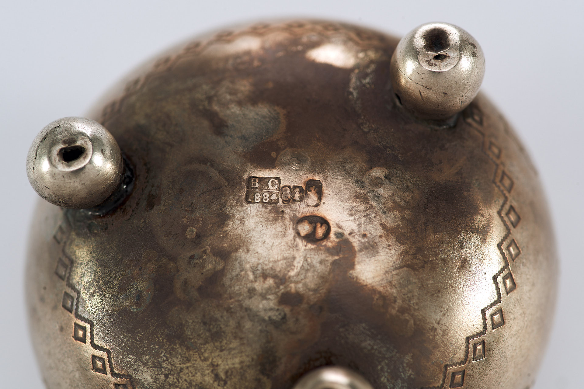 Солонка круглой формы, с расширением книзу и небольшим бортиком в верхней части, на трех шаровидных ножках, выполнена в псевдорусском стиле, возникшем во второй половине XIX века и ориентирующемся на национальное наследие. Тулово украшено плоскостным декором с использованием древнерусских мотивов и геометрических элементов. Декор нанесен методом гравировки.