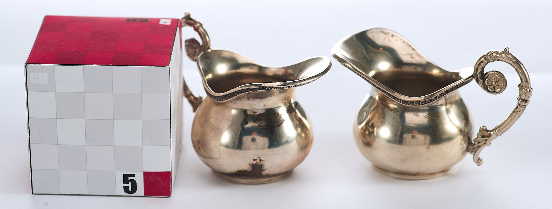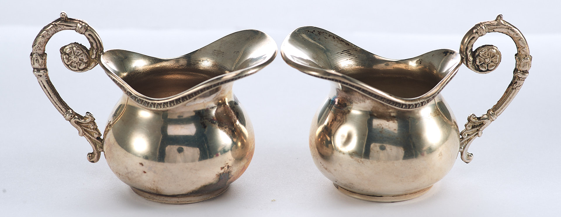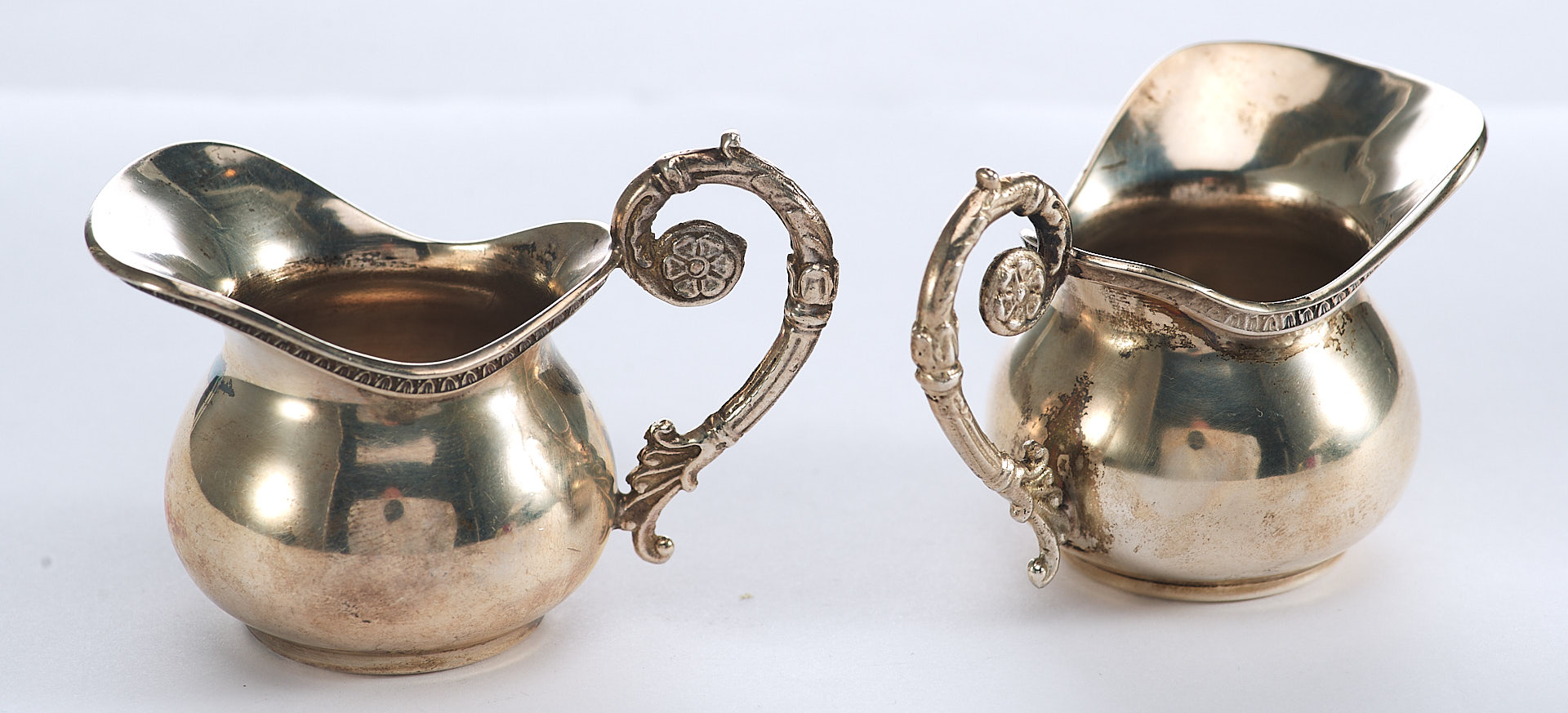 Представлены парные сливочники (либо сосуды для лимонного сока) с орнаментальными ручками, украшенными в стиле неоампир лепестками аканта).