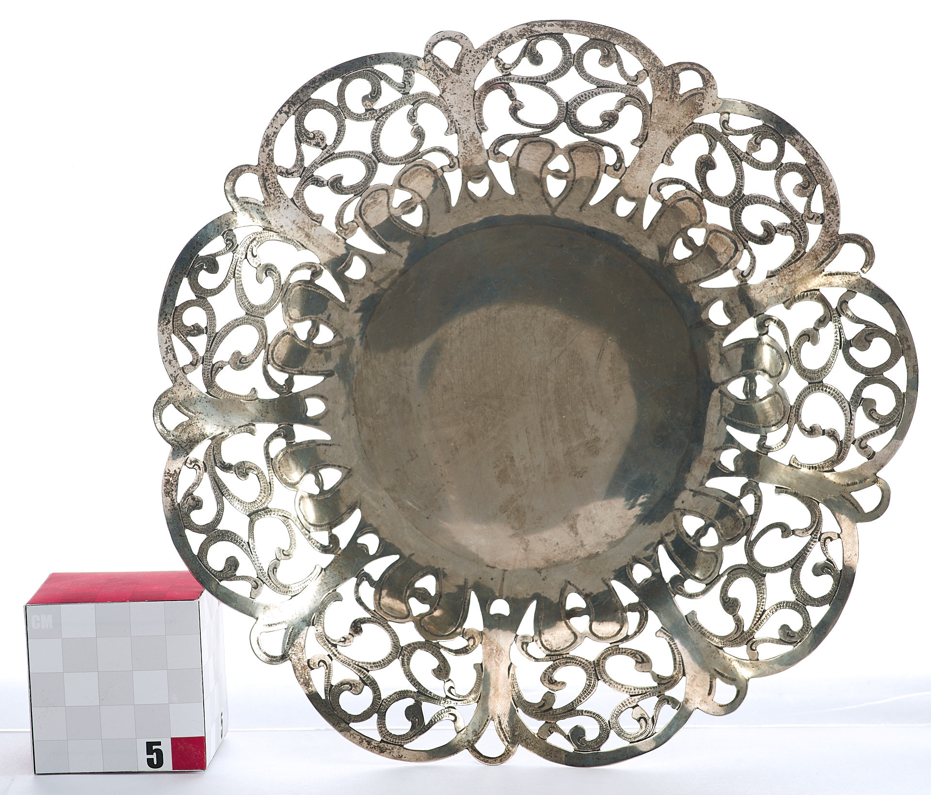 Представлена серебряная ваза с прорезными орнаментированными краями, стилевое оформление которых соответствует неостилю раннего барокко. Неостили были распространены в Европе 2й половины XIX в. И все же в целом неостили отличаются от первого подражательностью, тяжеловесностью деталей, отсутствием искренности, чувства новизны, подлинного вдохновения - словом всем тем, по чему всегда можно отличить подражание от первоисточника.