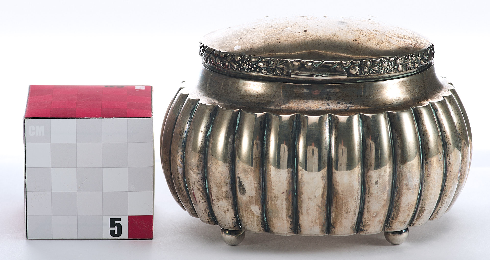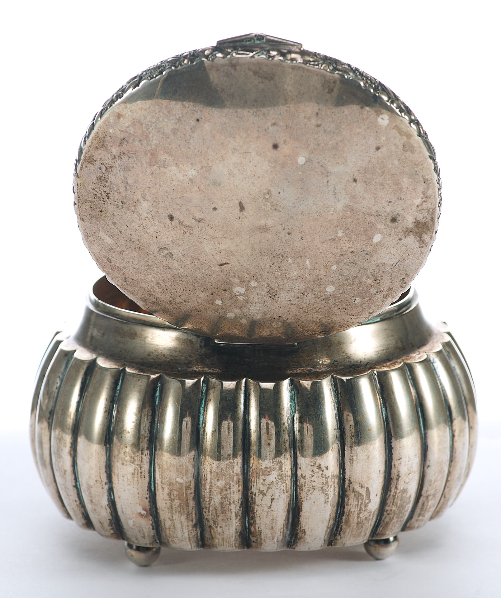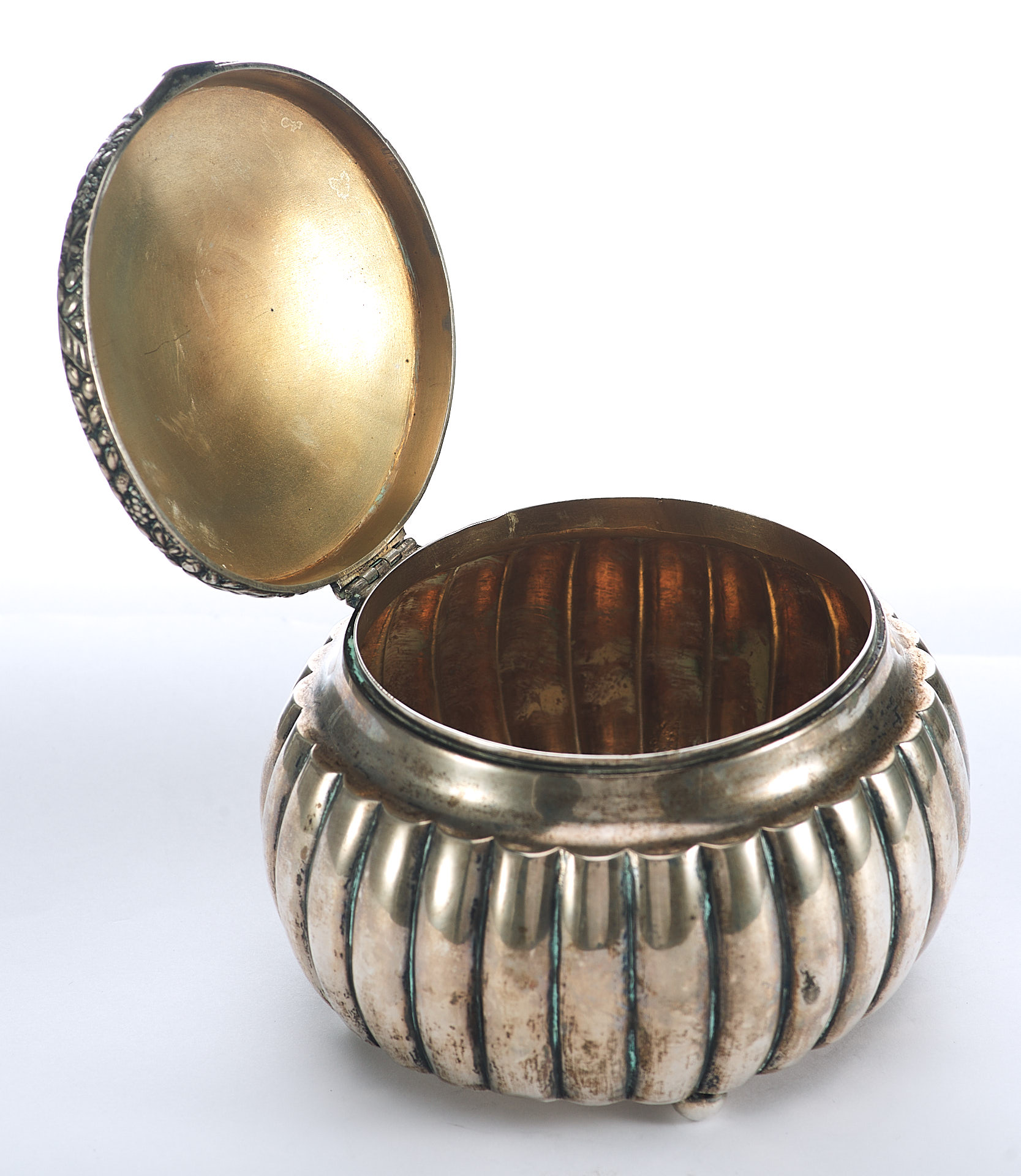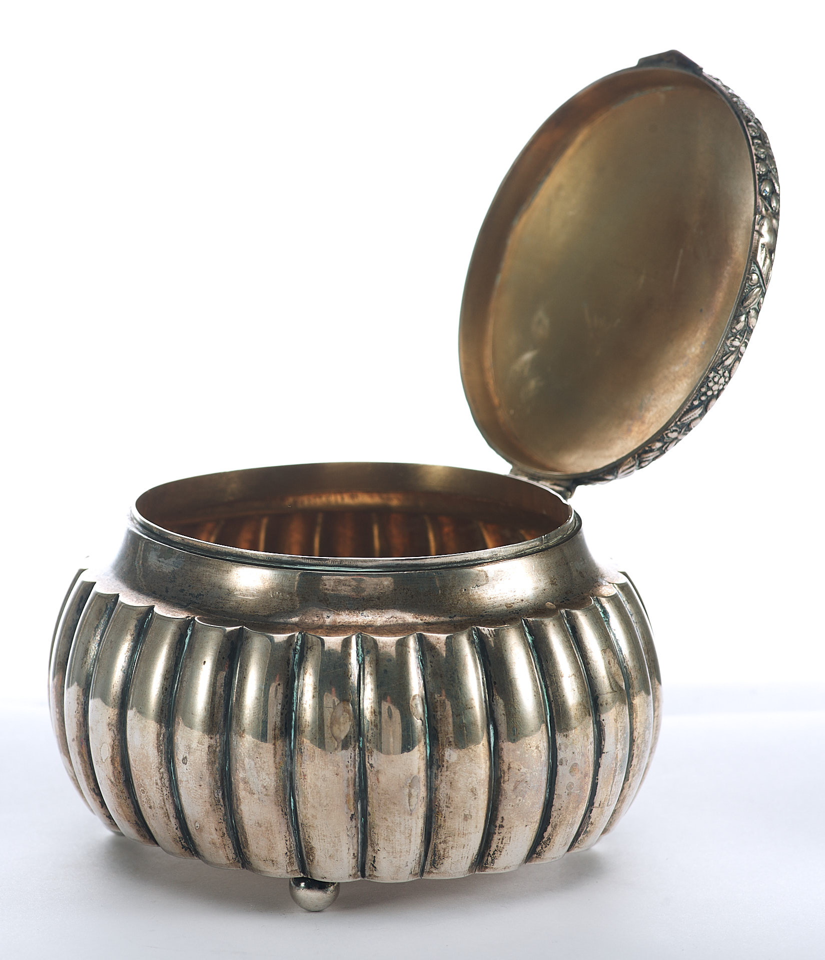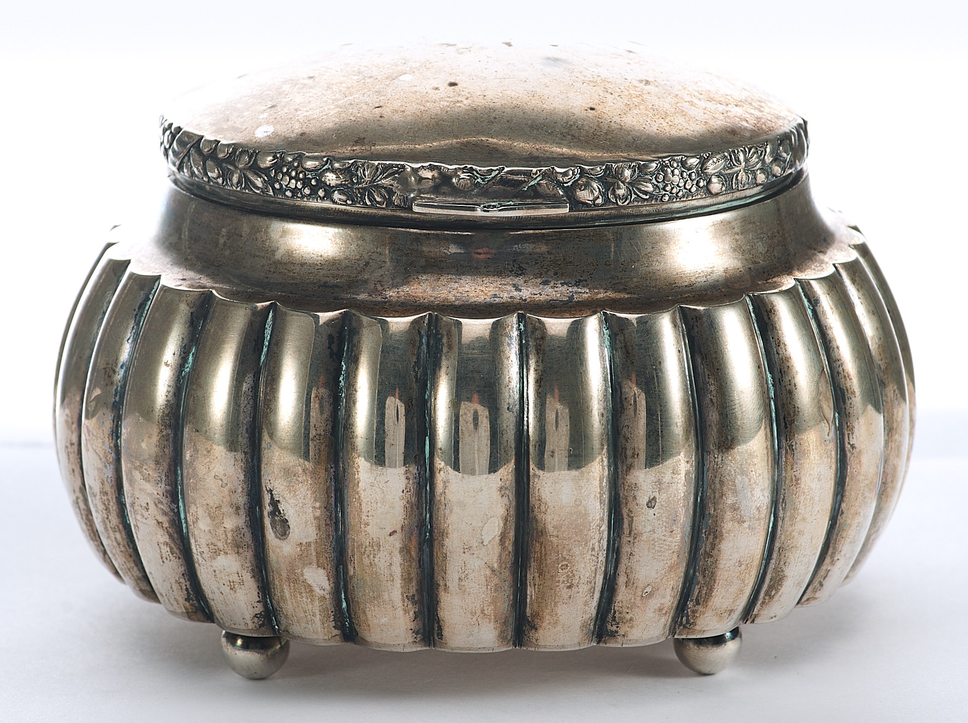 Представлена серебряная шкатулка округлой формы с крышкой. Вертикально рифленые стенки шкатулки завершаются изогнутой выемкой по краю. Торцовая сторона крышки украшена рельефным изображением фруктов, символизирующих обильный урожай.