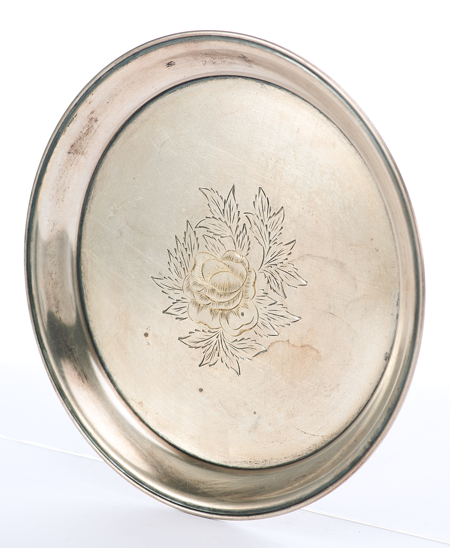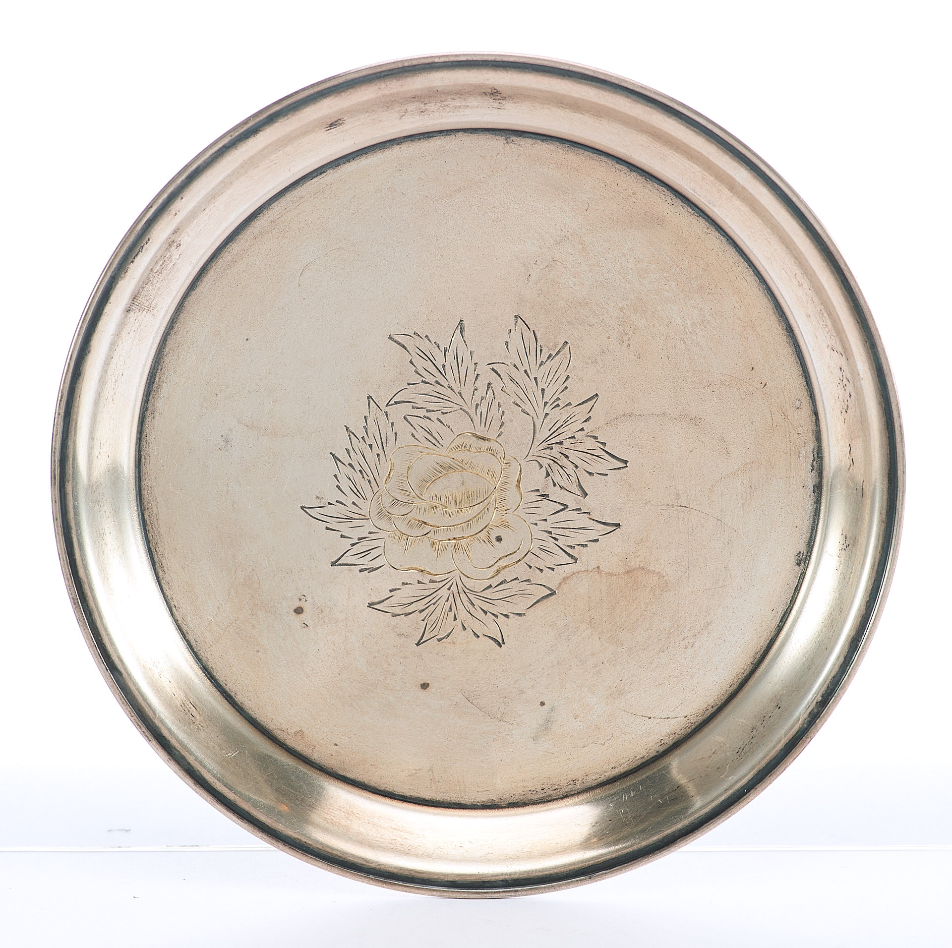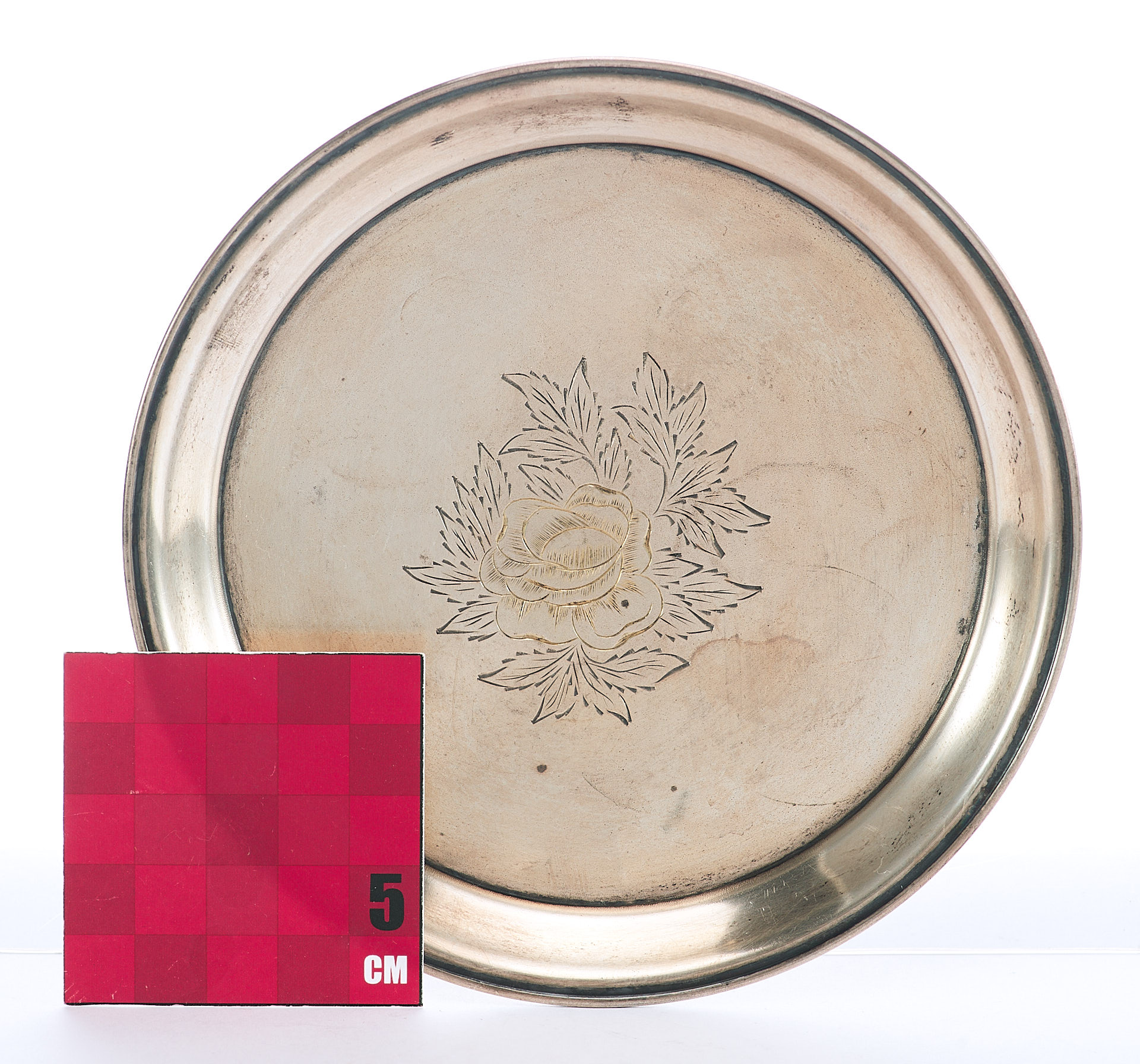 Представленный круглый поднос небольшого диаметра, с невысоким бортиком выполнен из серебра; в центре - цветочный декор, нанесенный методом гравировки и украшенный позолотой. Предмет отличается высоким уровнем исполнения.