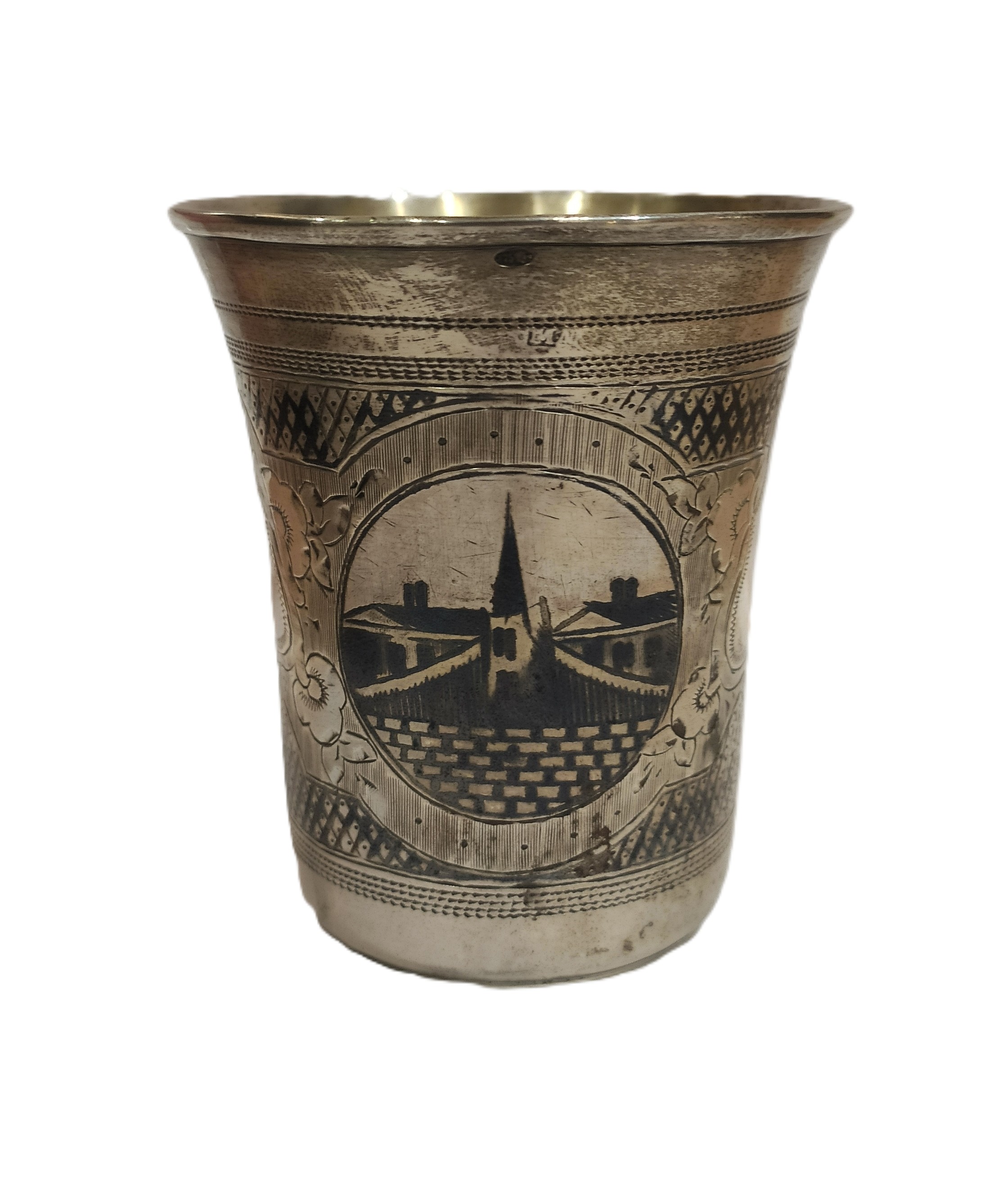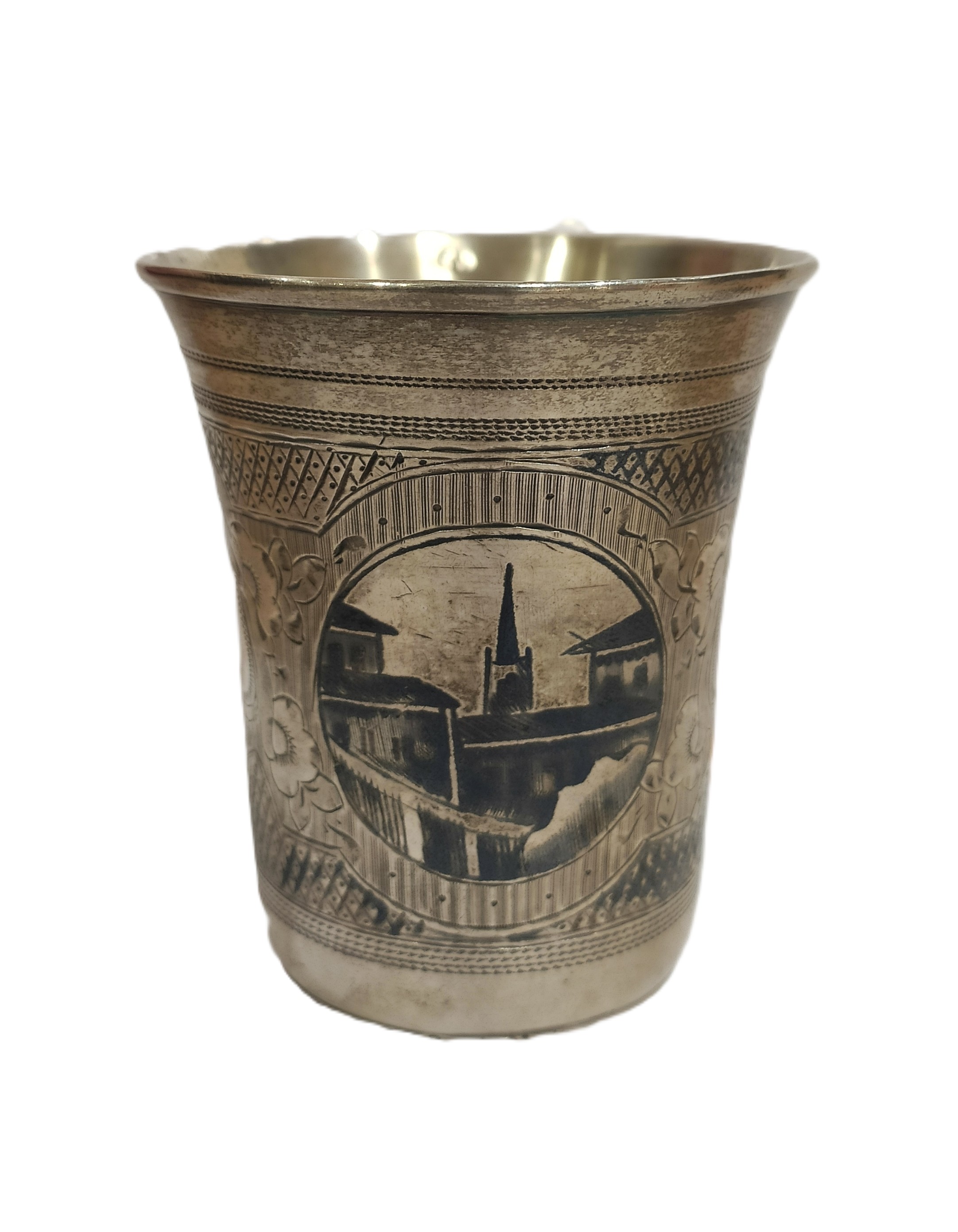 Стопка конической формы. Наружная поверхность декорирована двумя овалами с изображением городского пейзажа. Внутренняя поверхность гладкая с золочением. Дно плоское. По краю слива выпуклый ободок. Овалы украшены гравированным цветочным орнаментом.