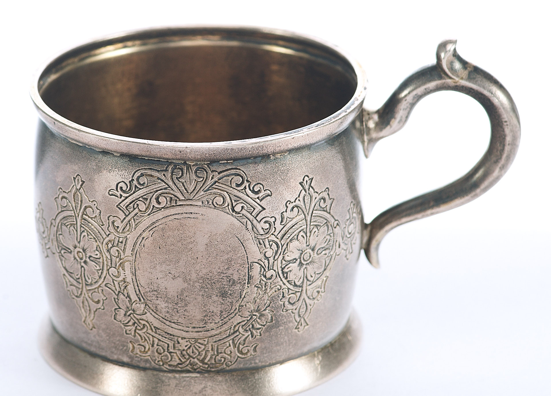 Представлен подстаканник с покатыми стенками, украшенный гравировкой в нео-русском стиле.