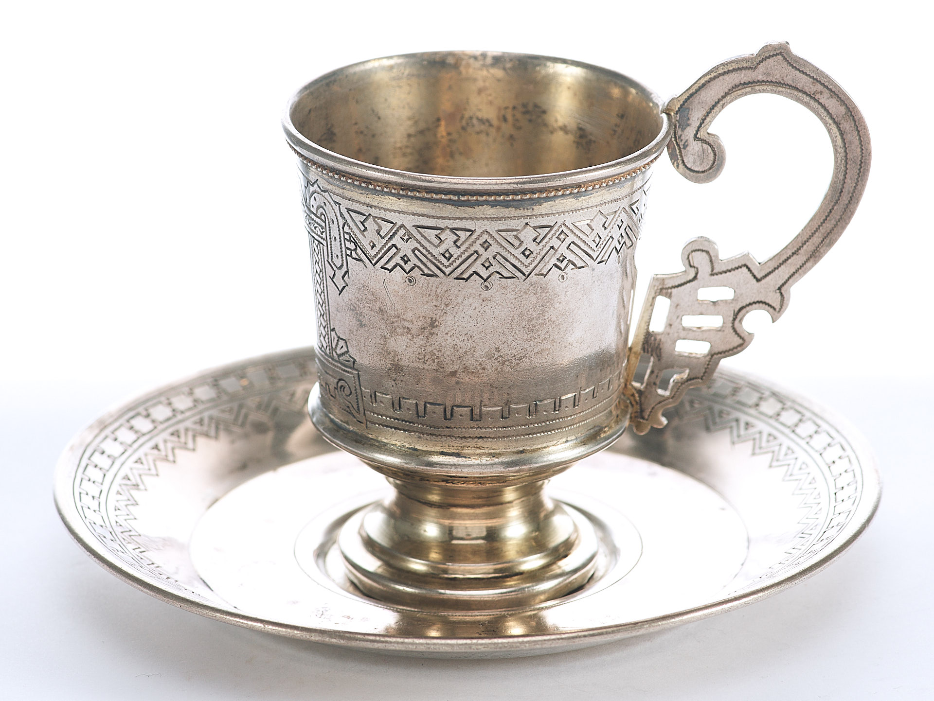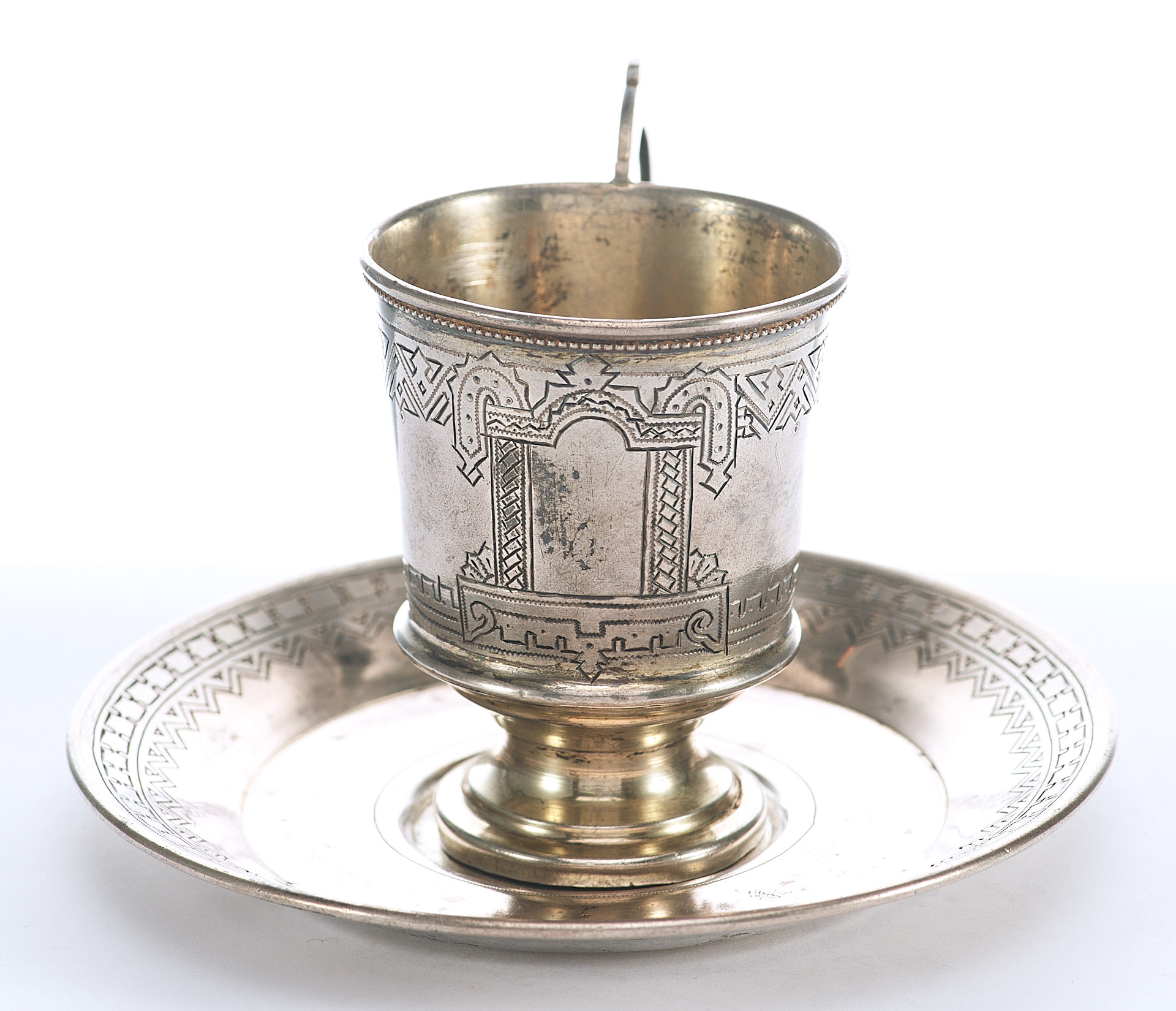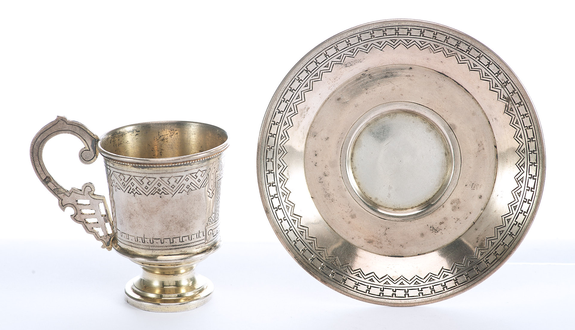 Представлена чайная пара в неорусском стиле», украшенная традиционным геометризированным славянским орнаментом, характерным для столовых изделий из серебра периода последней четверти ХІХв.
