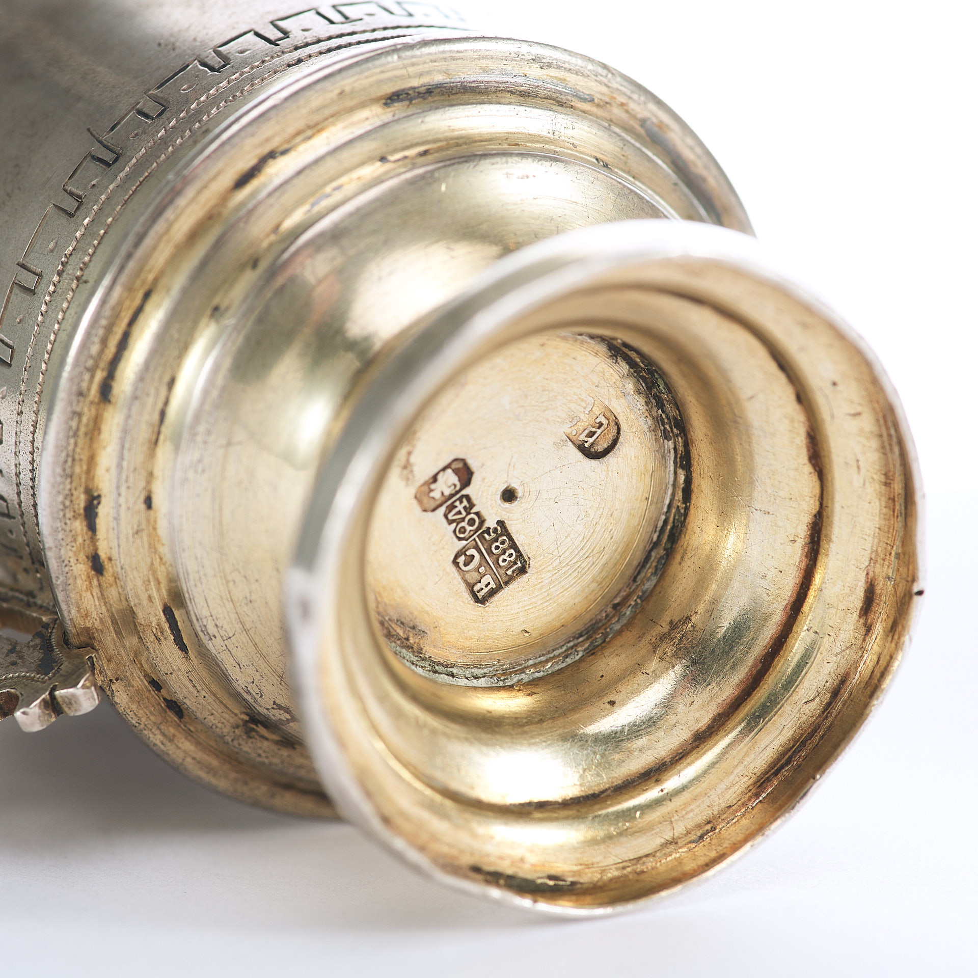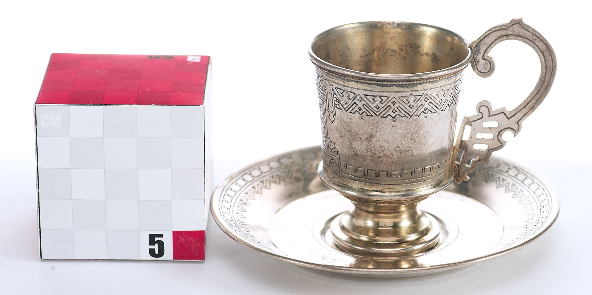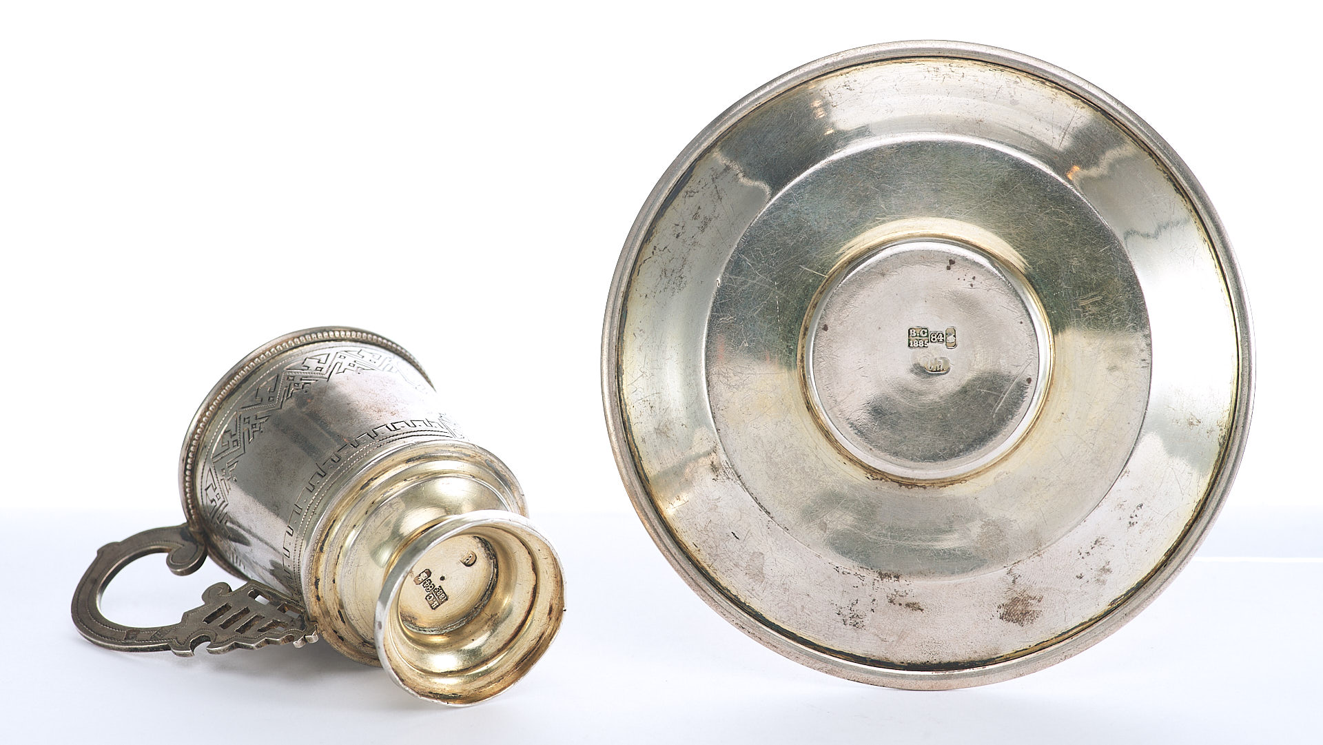Представлена чайная пара в неорусском стиле», украшенная традиционным геометризированным славянским орнаментом, характерным для столовых изделий из серебра периода последней четверти ХІХв.