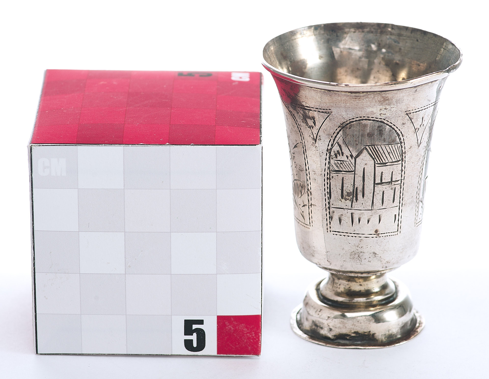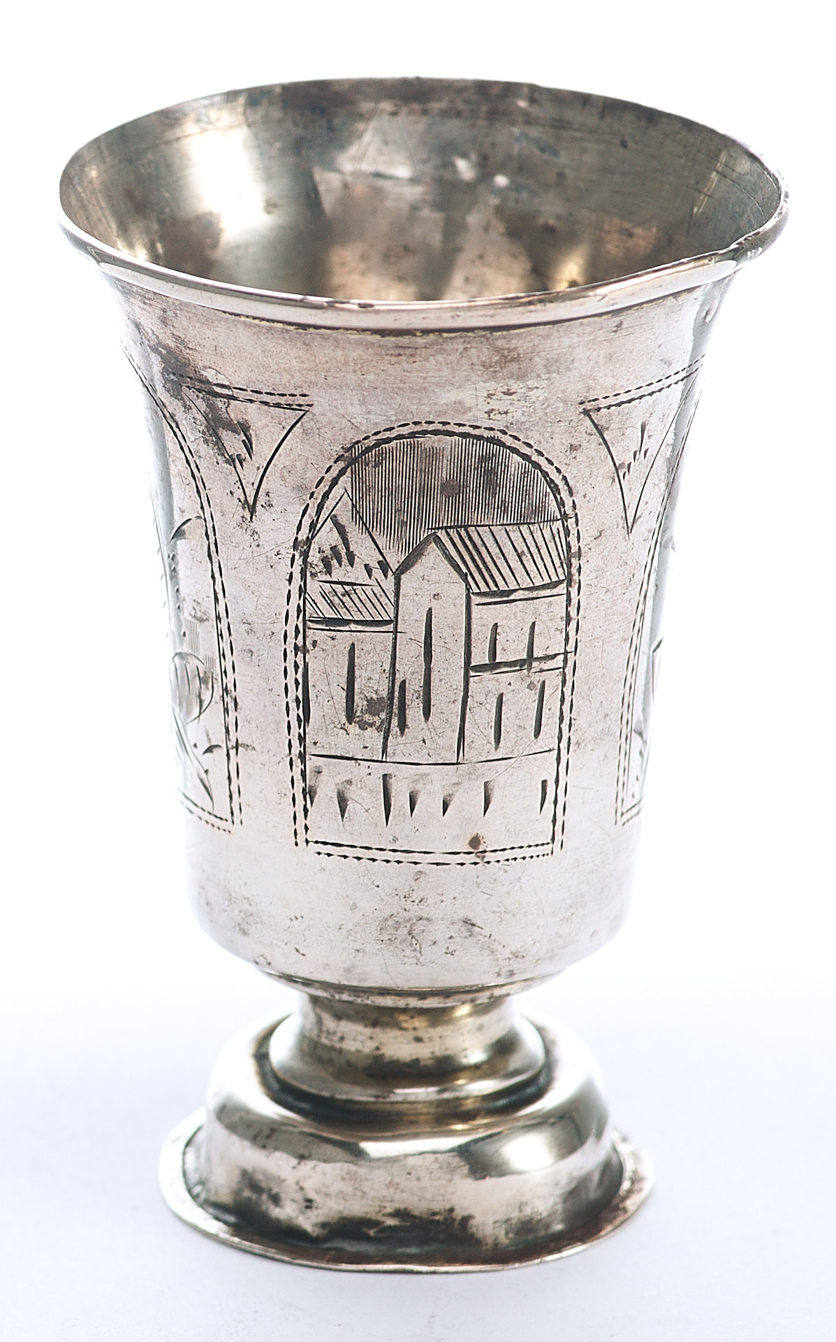 Рюмка классической формы с расширением кверху, на невысокой ножке выполнена в неорусском стиле. Тулово украшено полуовальными картушами со стилизованными архитектурными пейзажами и вставками растительного декора, оформление выполнено в технике гравировки. Узор нанесен аккуратно, что характеризует рюмку как изготовленный и оформленный на хорошем техническом уровне предмет.