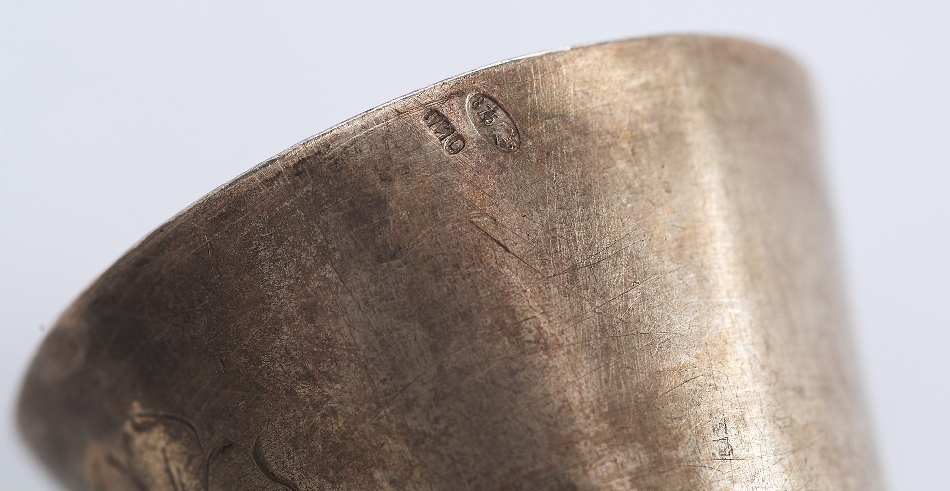 1. Женская головка в кокошнике, повернутая вправо и «ß» - клеймо Красносельской инспекции пробирного надзора