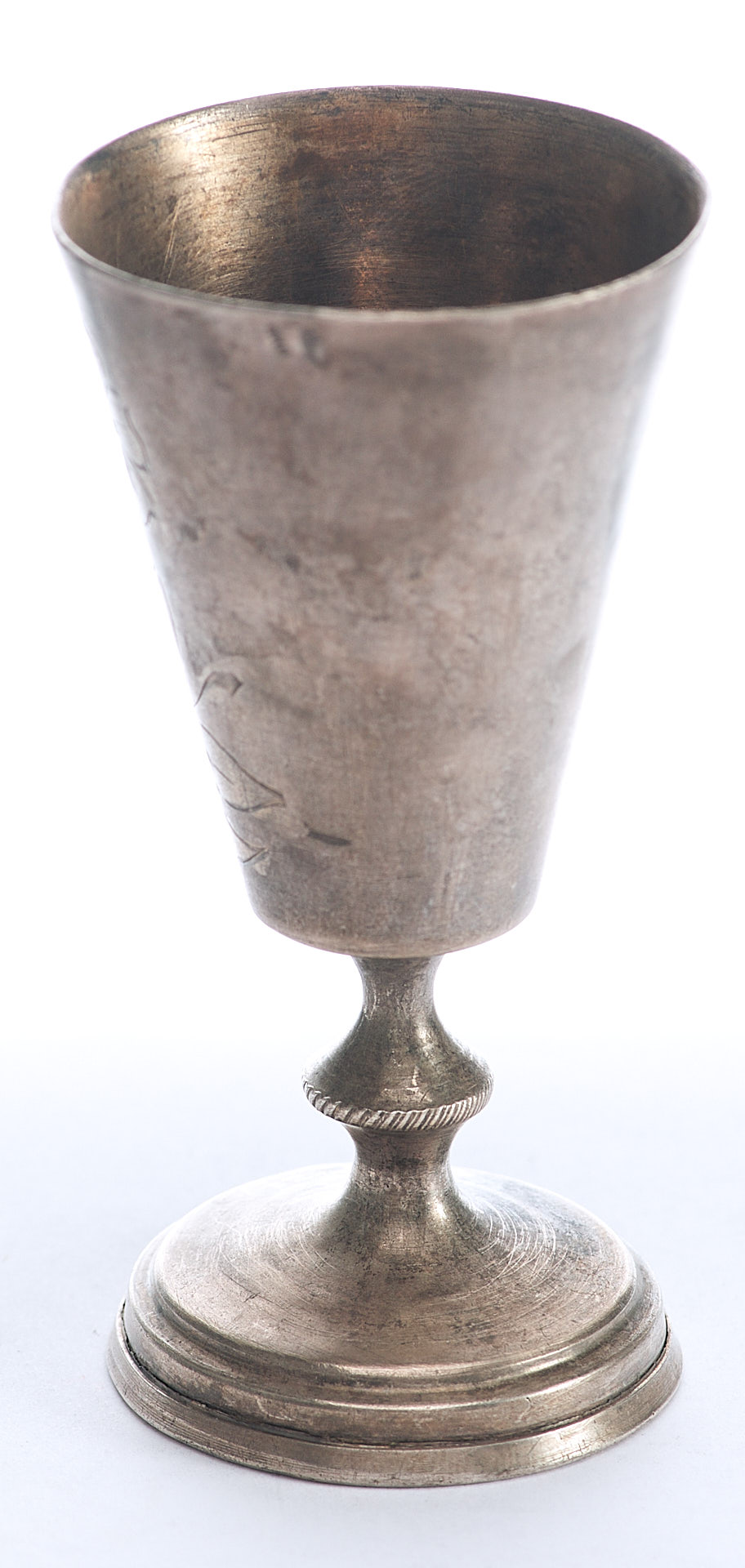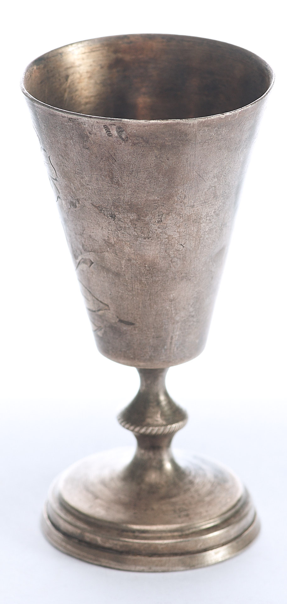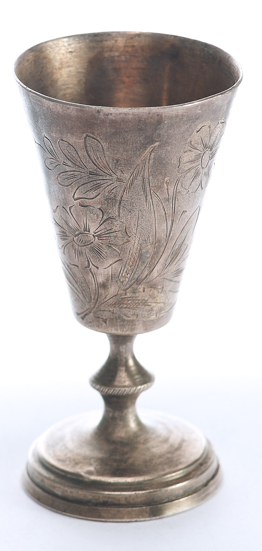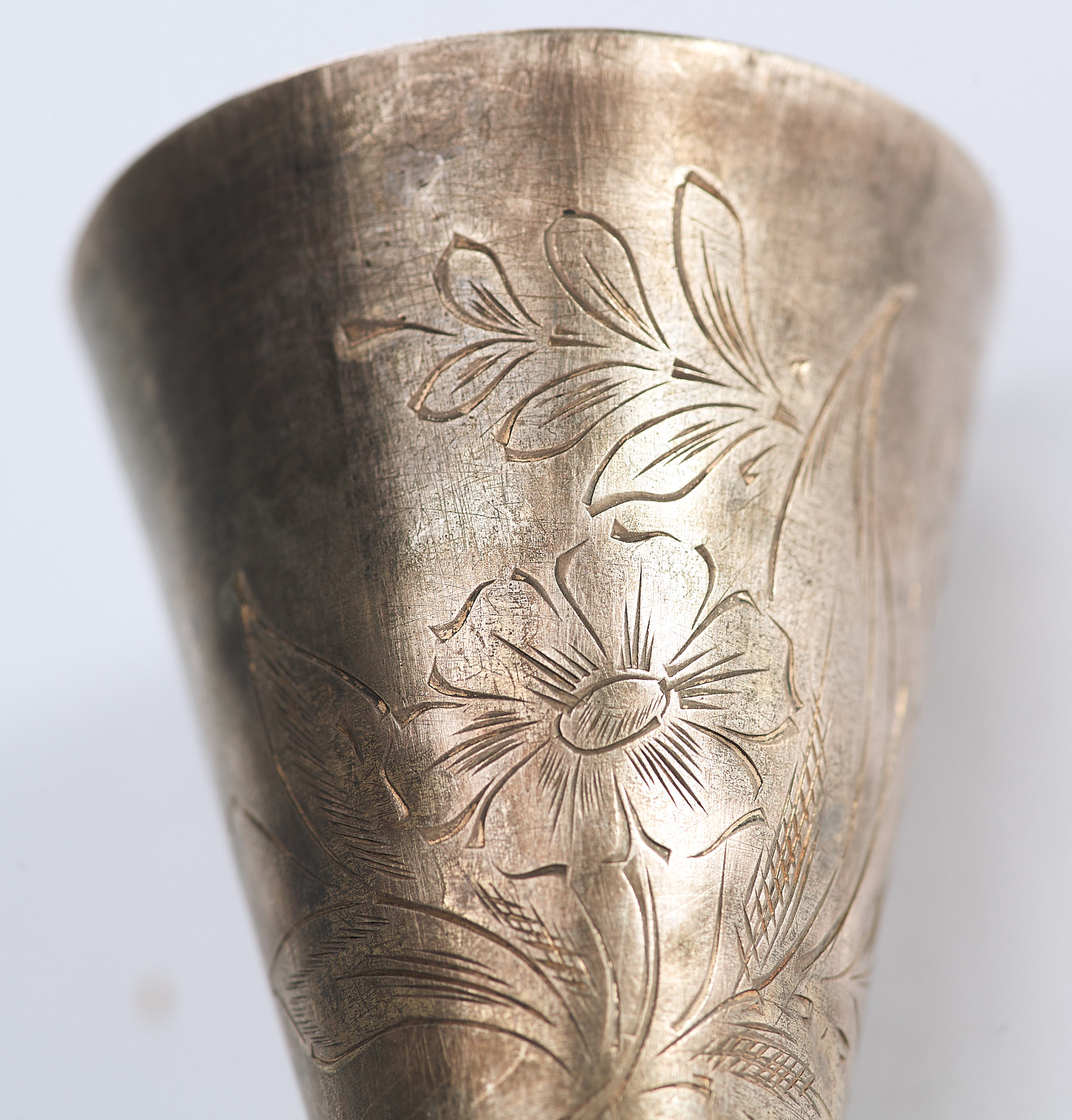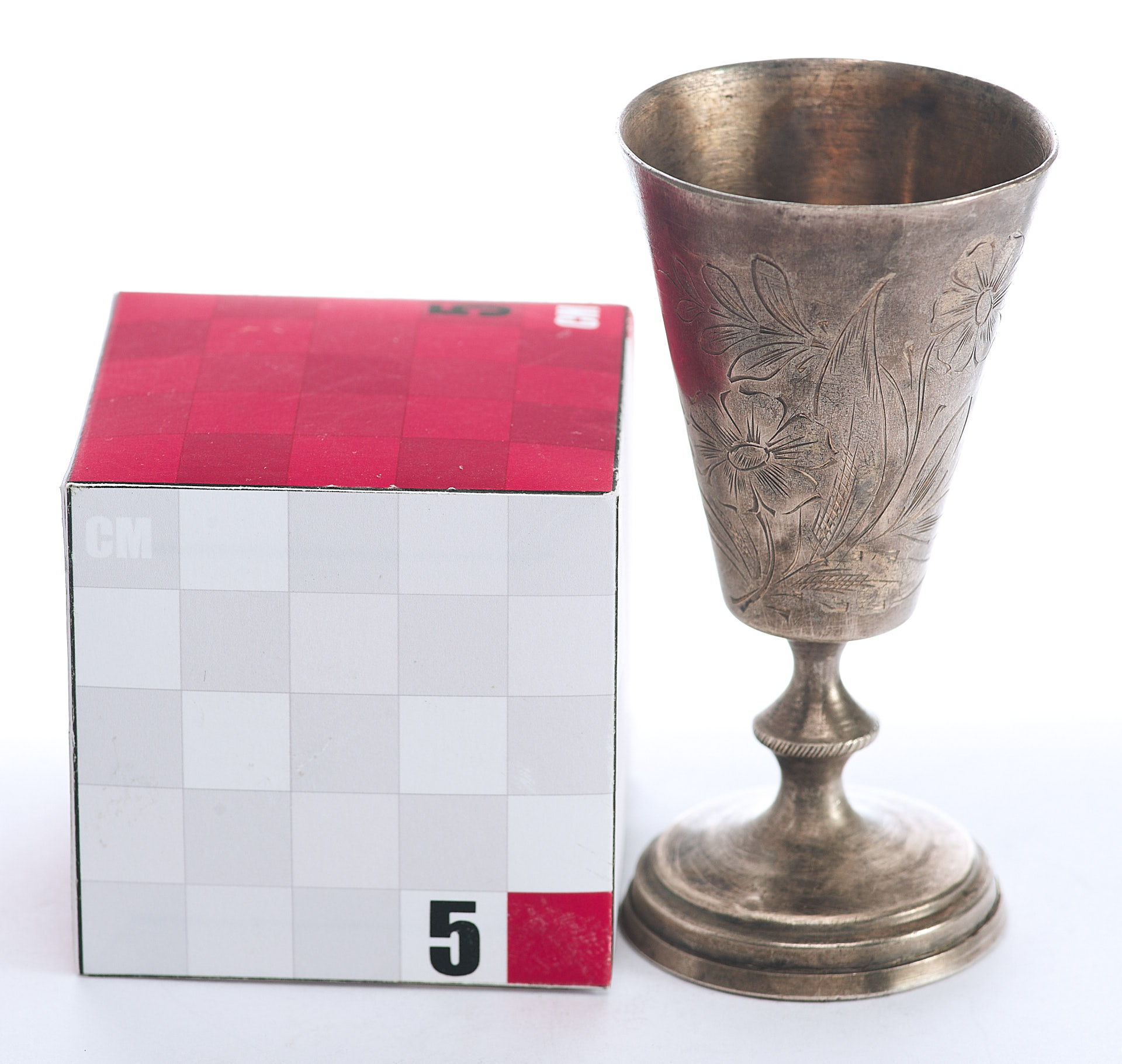 Представлена серебряная рюмка на ножке. Украшена растительным орнаментом в технике гравировки.