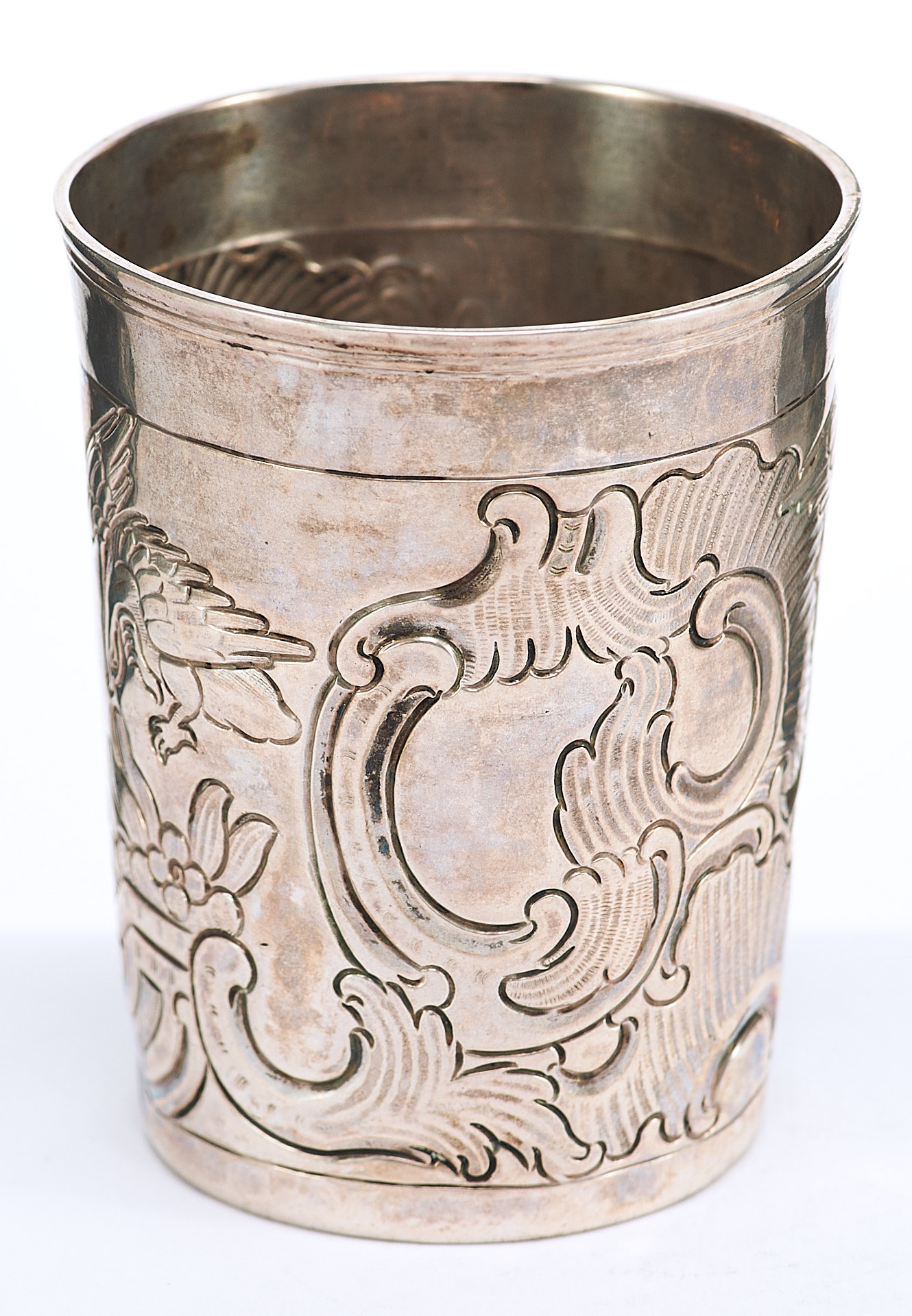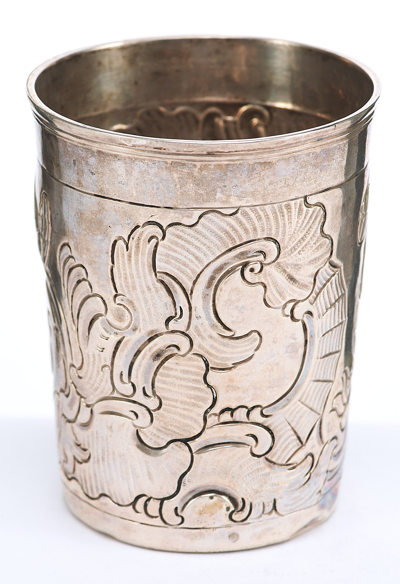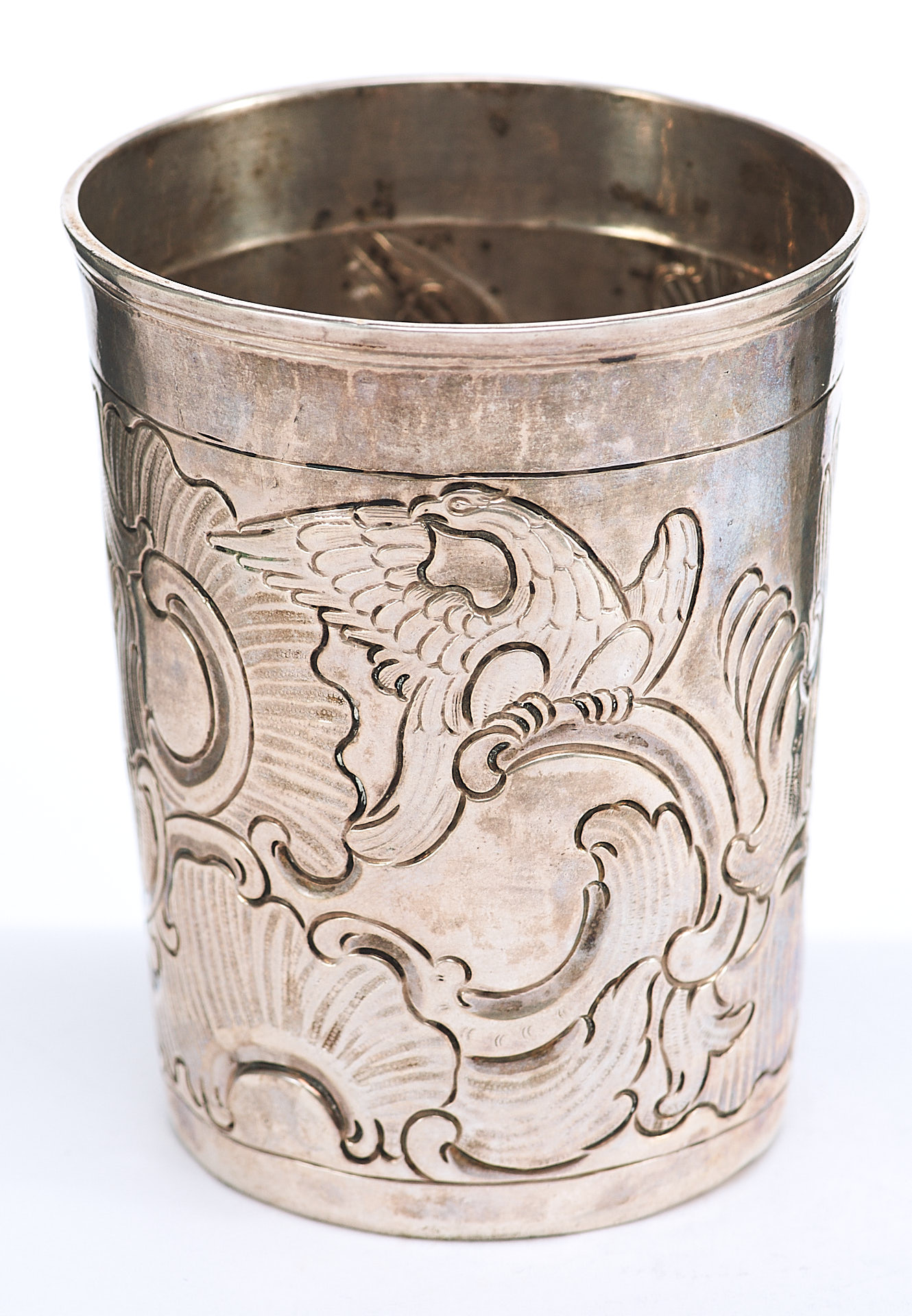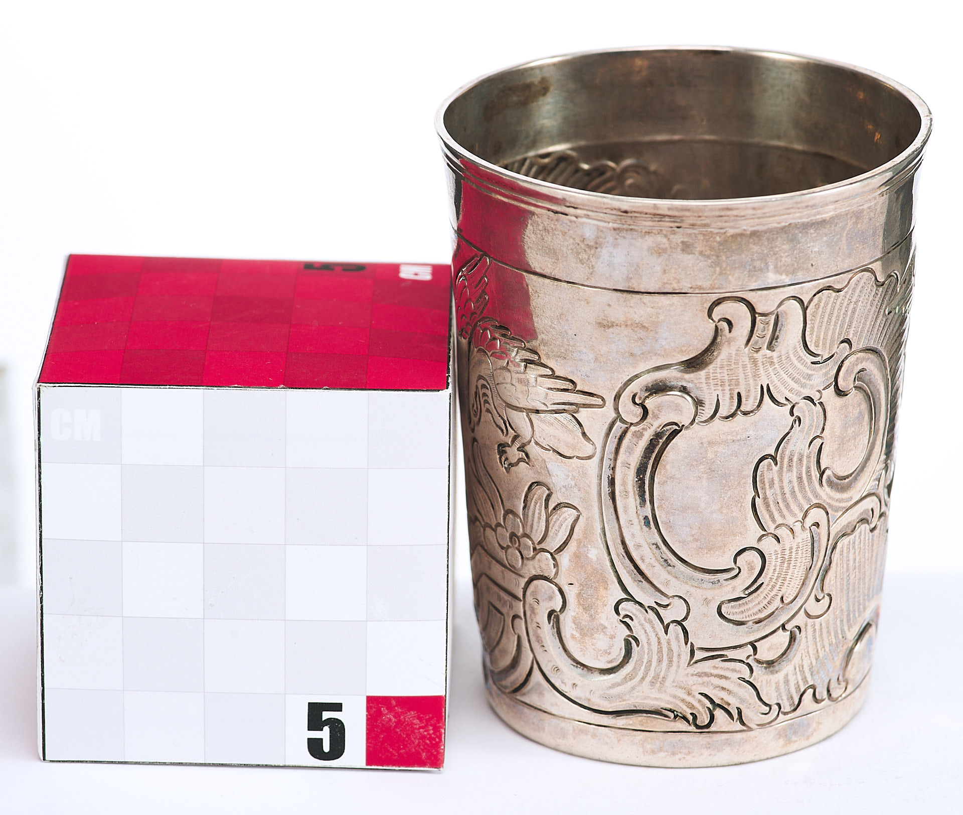 Клейма подлинные. Изделия московских мастеров-серебряников второй половины ХVIII века изящны, орнамент их очень легкий, он не покрывает всей поверхности предмета, а оставляет много свободной глади. Птицы и травы - неотъемлемая составляющая декора на стаканах второй половины ХVIII века.