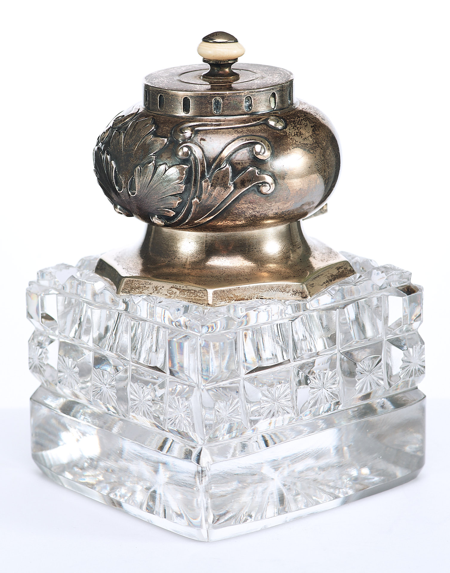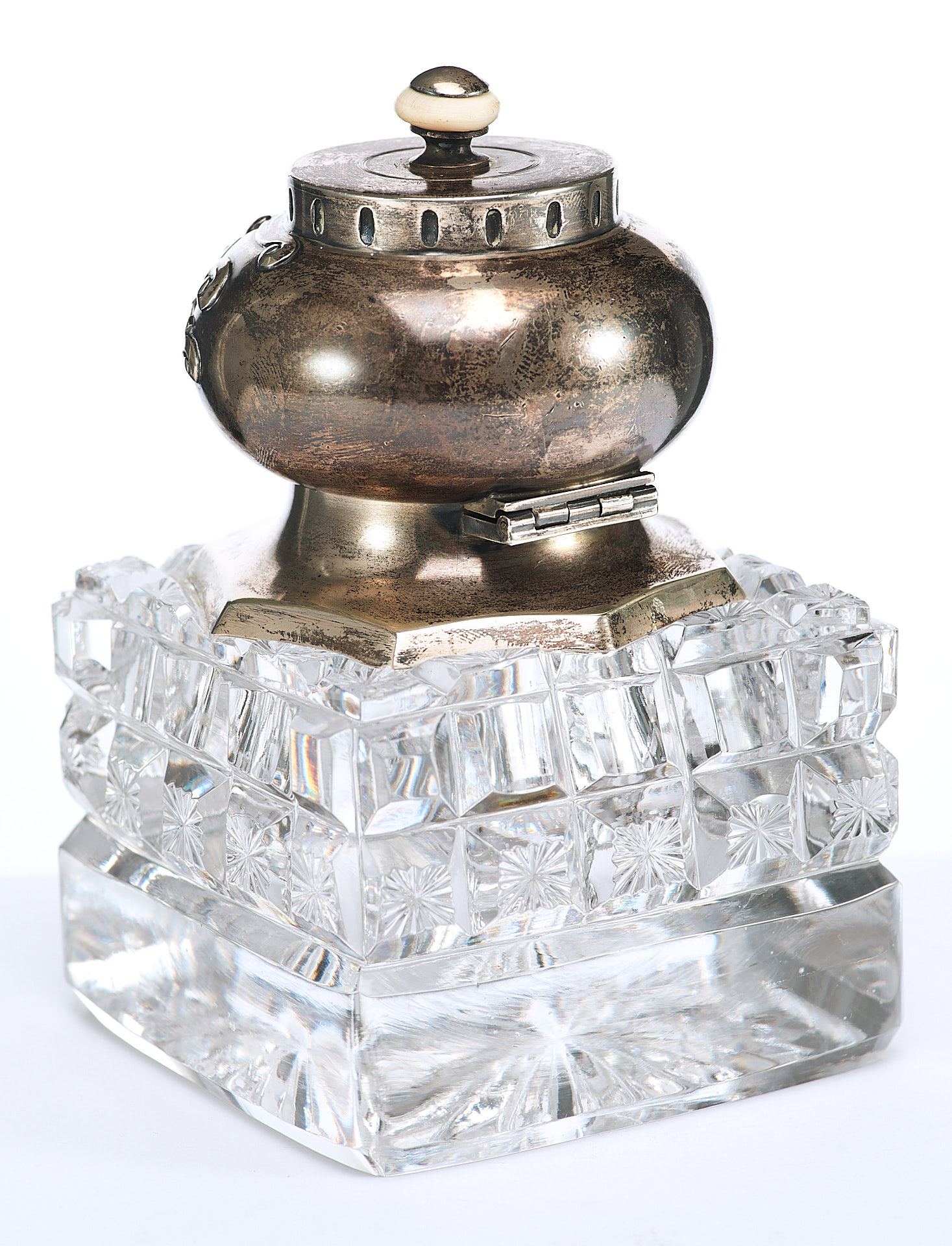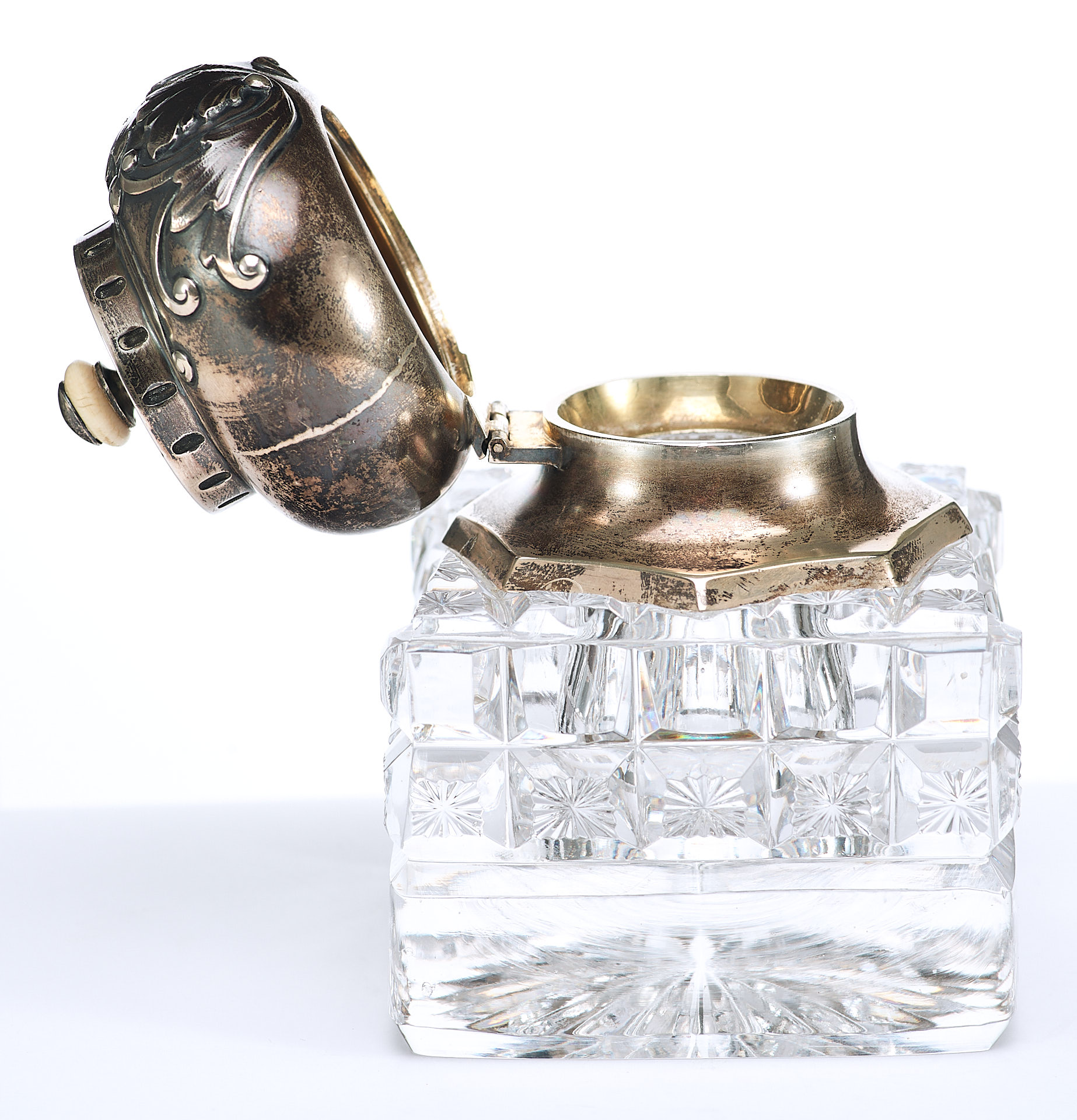 На прямоугольной из стекла подставке серебряная откидная крышка с костяной ручкой.