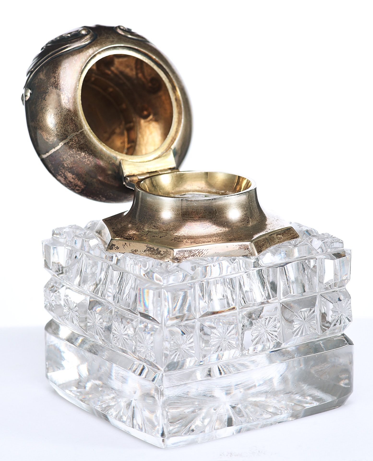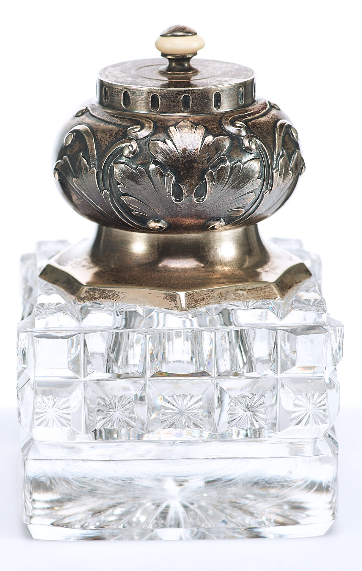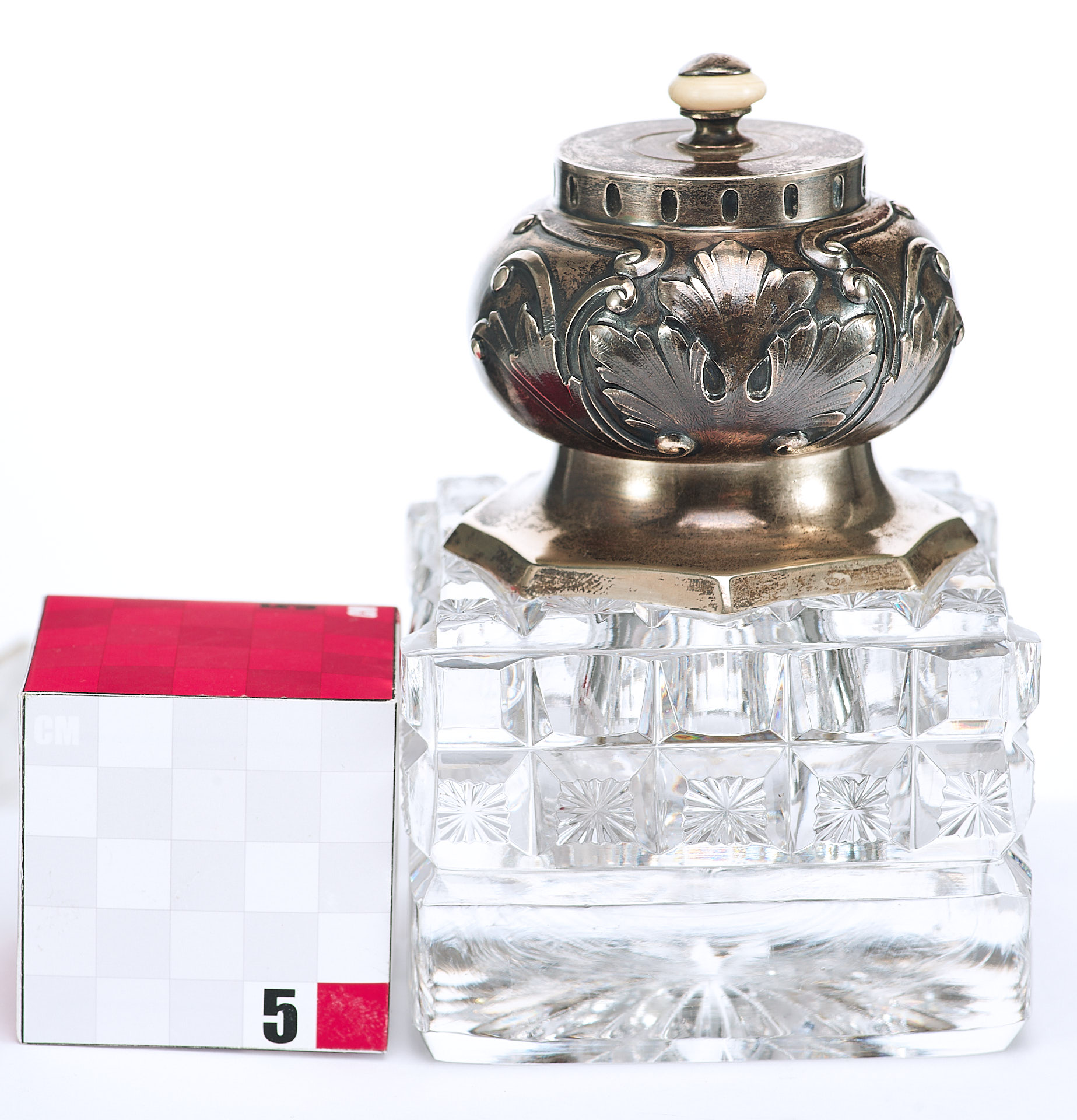 На прямоугольной из стекла подставке серебряная откидная крышка с костяной ручкой.