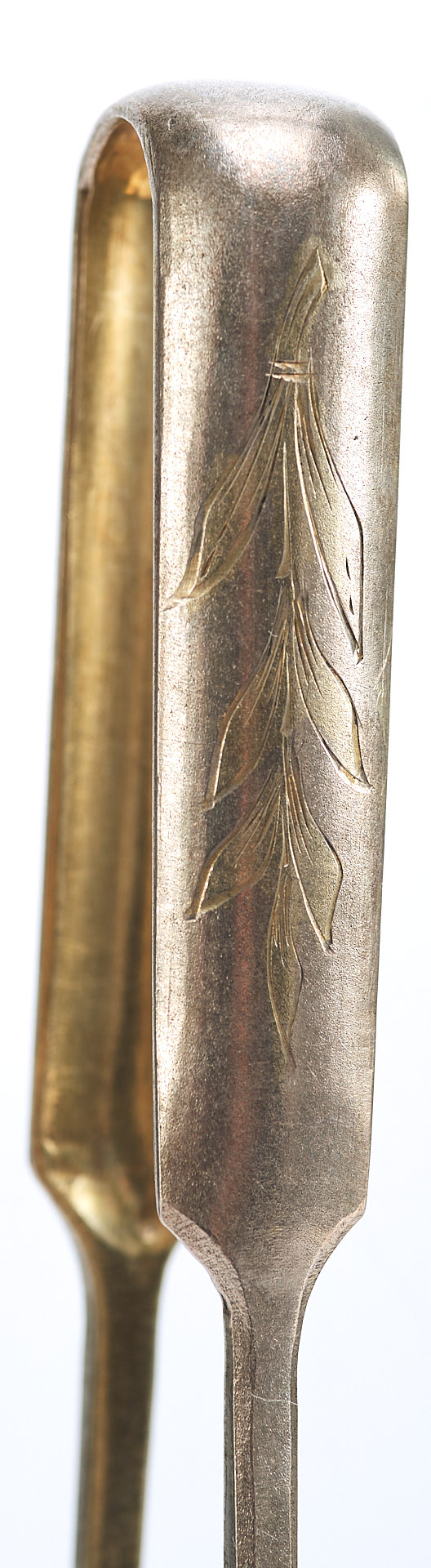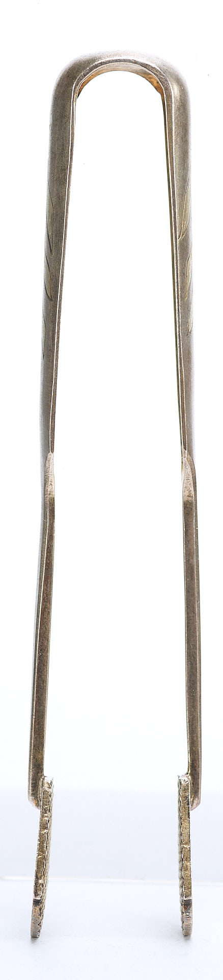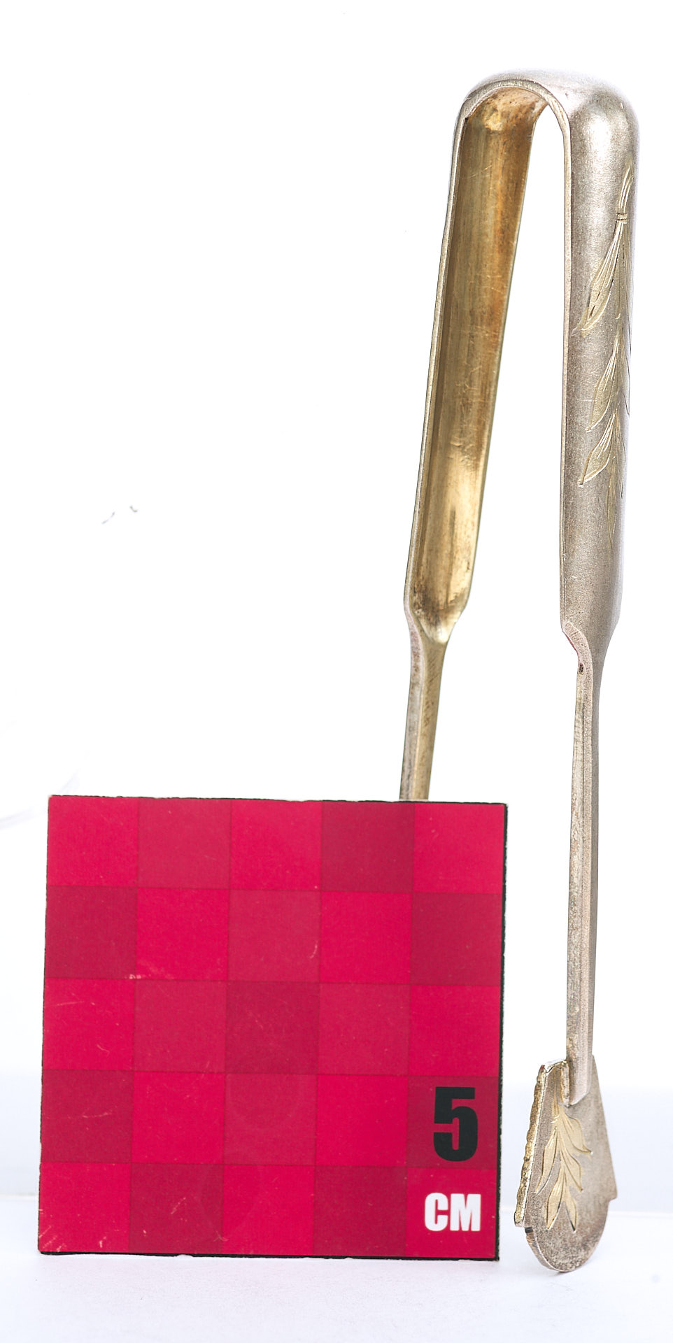 Щипцы для сахара выполнены в стилистике ар-деко, популярного в середине XX века, украшены декоративным растительным