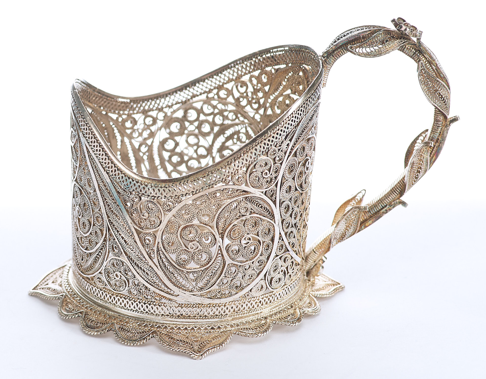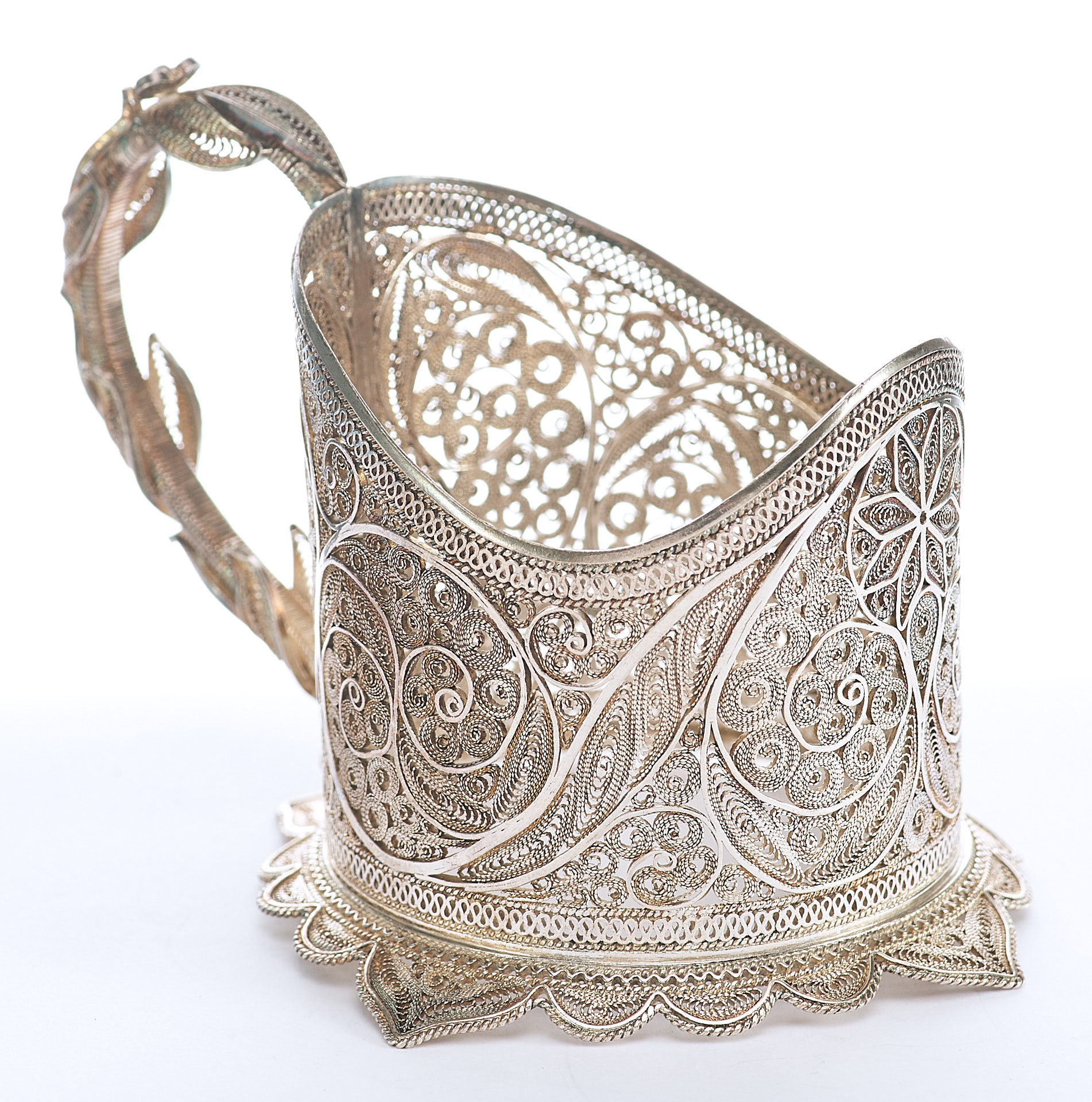 Представлены два парных серебряных подстаканника, которые выполнены в технике кружевного сканного орнамента.