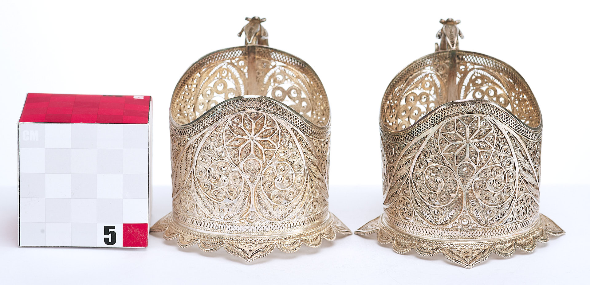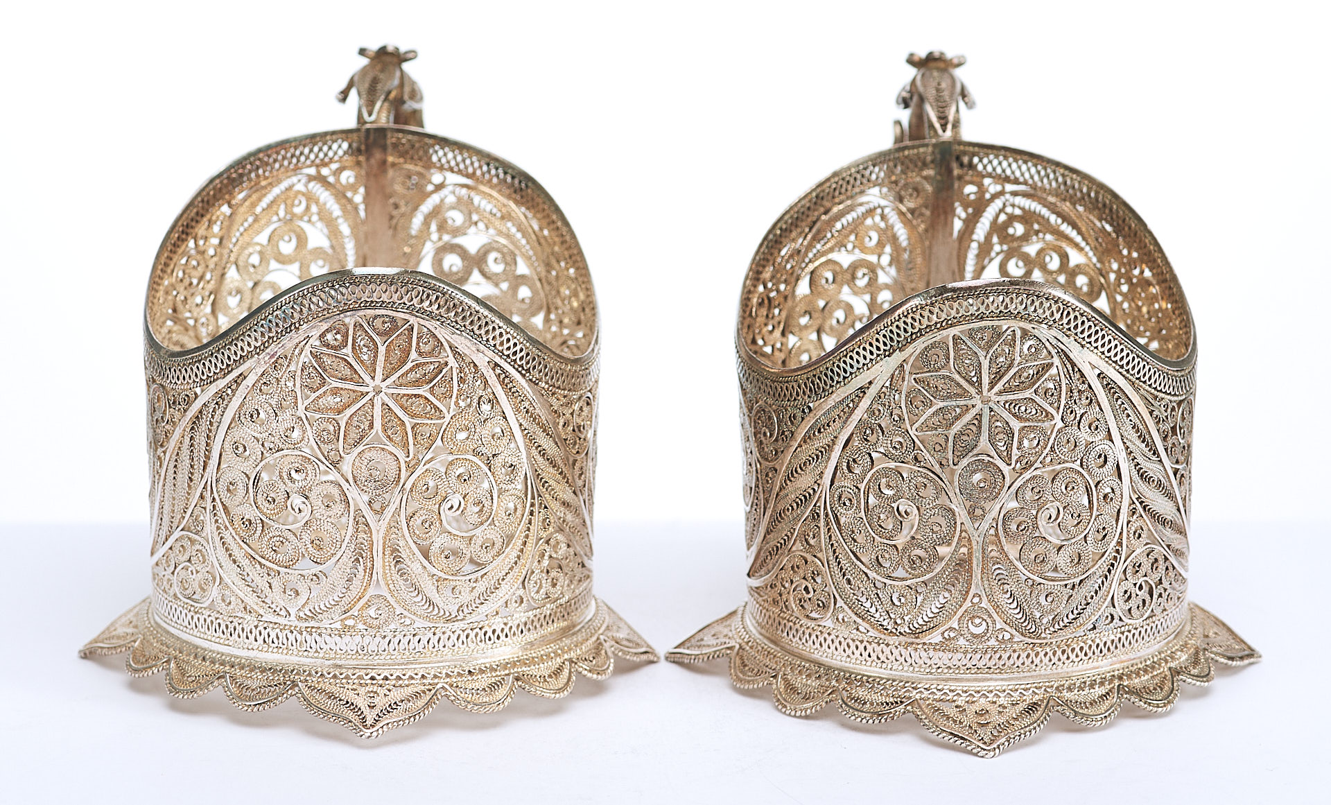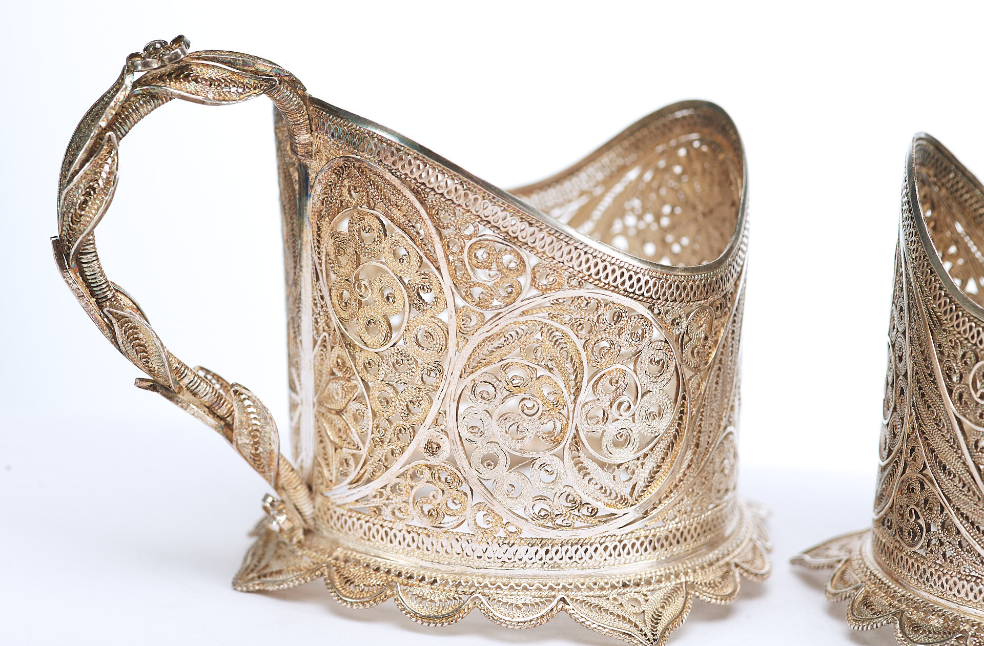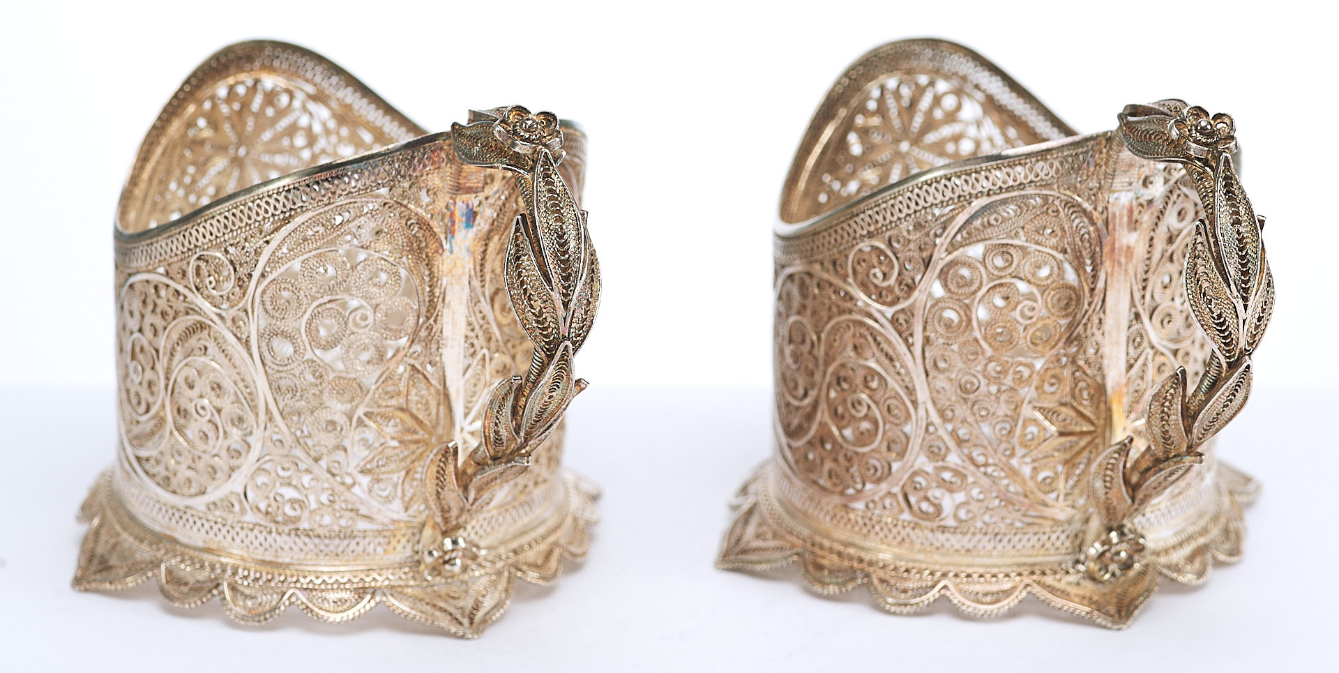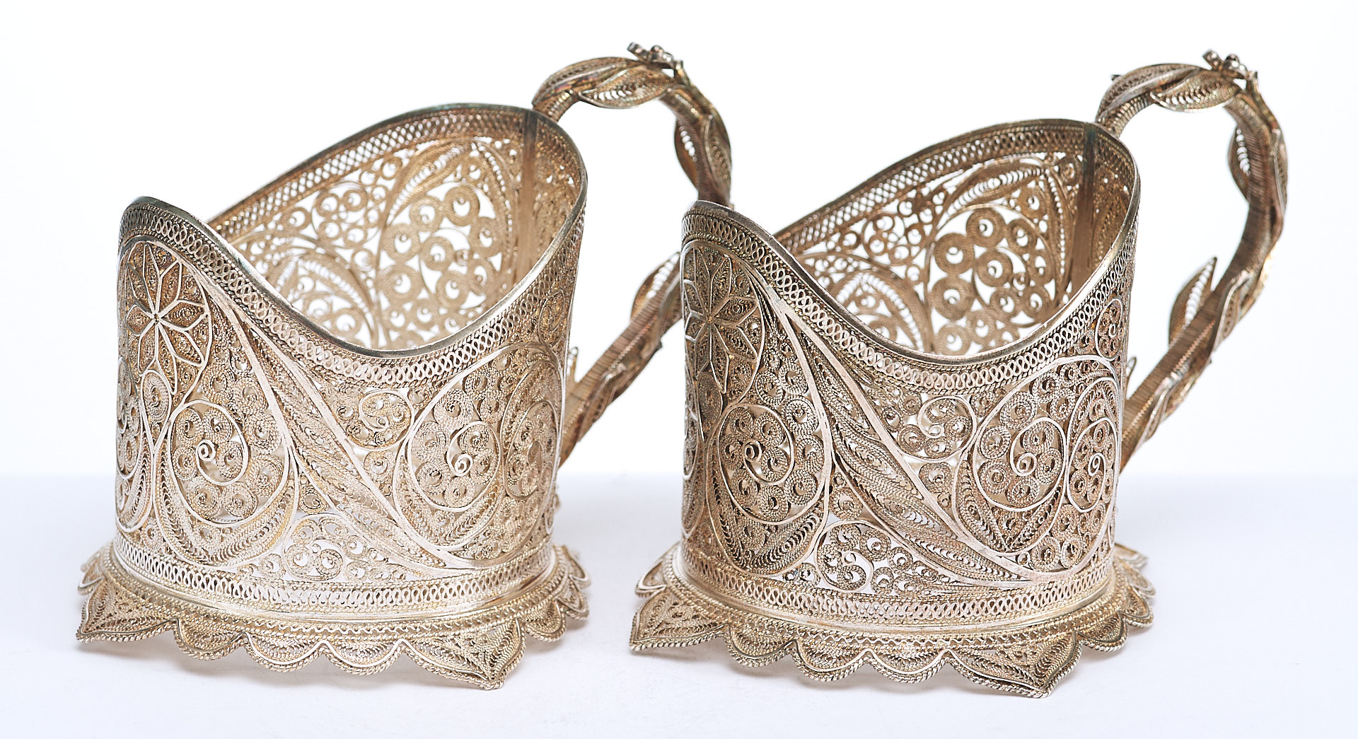 Представлены два парных серебряных подстаканника, которые выполнены в технике кружевного сканного орнамента.