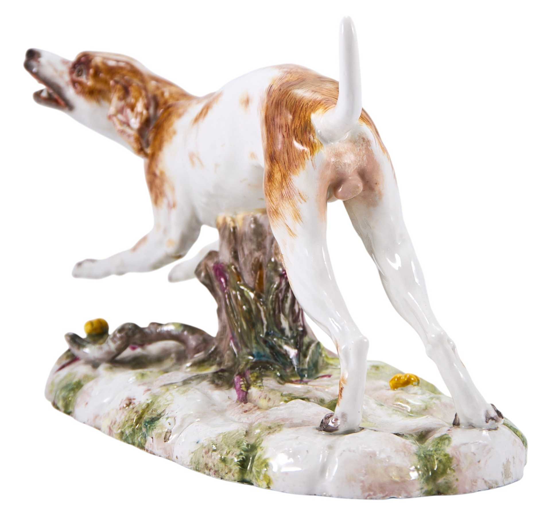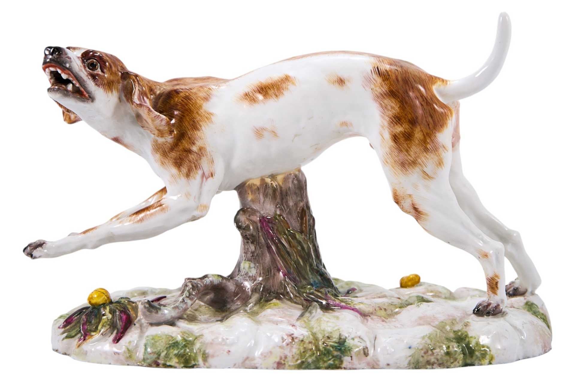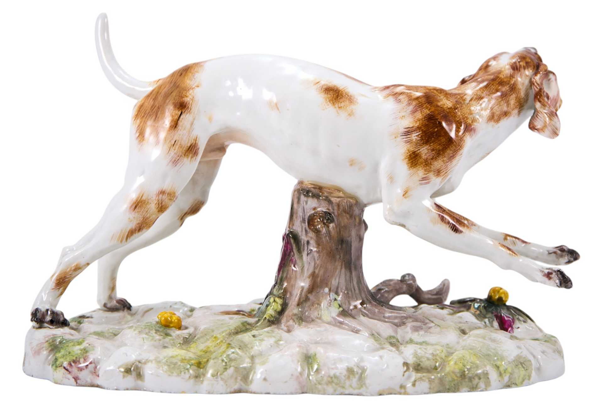 Представлена бегущая гончая. На основании клеймо изготовителя - фарфоровой фабрики в Höchst (Германия), периода 1750-1790-х годов, в виде колеса с шестью спицами. Хехстская фарфоровая мануфактура, Гессен ( Германия) Одна из наиболее известных немецких фарфоровых мануфактур была основана в 1746 году в городе Хёхсте (Гессен) коммерсантами И. К. Гельтцем и Ф. И. Кларусом с помощью бывшего мейсенского художника А. Ф. Лёвенфинка. Первым изделиям, изготавливавшимся из темной массы, Лёвенфинк придумал название „фаянсовый фарфор”. Лишь при. преемнике Лёвенфинка Иоганне Бснкграффе из Вены качество массы и художественный уровень изделий значуутельно повысились, так что к 1750 году выпускался уже полноценный фарфор. После отъезда Бенкграффа в Фюрстенберг (1753) начались финансовые трудности, поэтому в 1756 году фабрика стала собственностью государства под покровительством курфюрста Фридриха Карла, затем (1765-1776) являлась компанией, где главным пайщиком оставался курфюрст, с 1778 года окончательно перешла к курфюрсту, а в 1796 году закрылась вследствие разорения, обусловленного наполеоновскими войнами. Формы и модели Хёхста были закуплены предприятия?,!!! в Пассау, Боппе и Дз?,імс, часть из них сохранилась до наших диен.