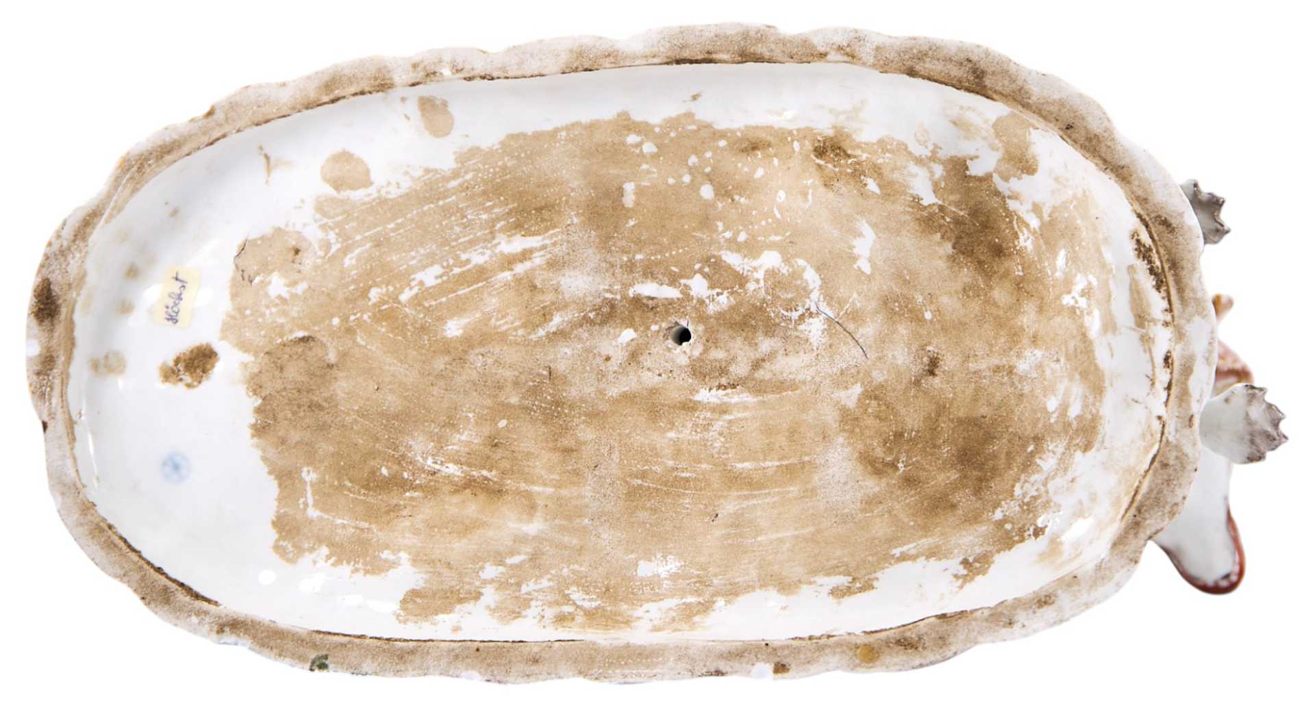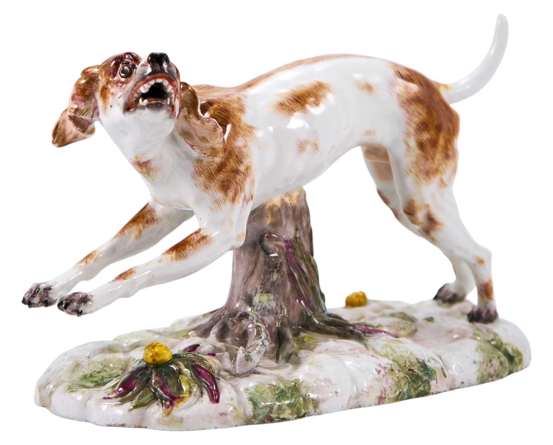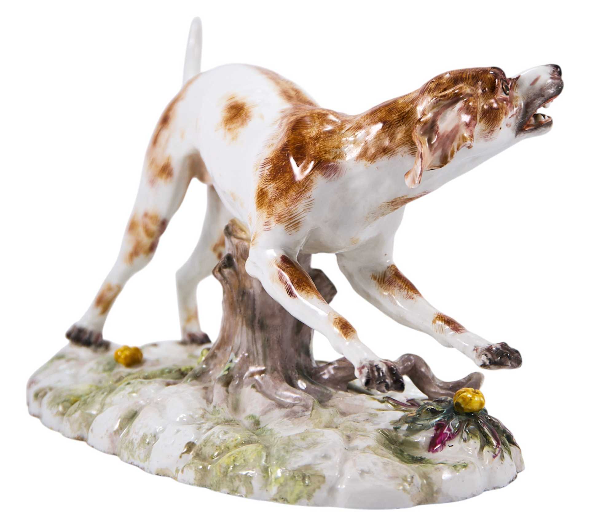 Представлена бегущая гончая. На основании клеймо изготовителя - фарфоровой фабрики в Höchst (Германия), периода 1750-1790-х годов, в виде колеса с шестью спицами. Хехстская фарфоровая мануфактура, Гессен ( Германия) Одна из наиболее известных немецких фарфоровых мануфактур была основана в 1746 году в городе Хёхсте (Гессен) коммерсантами И. К. Гельтцем и Ф. И. Кларусом с помощью бывшего мейсенского художника А. Ф. Лёвенфинка. Первым изделиям, изготавливавшимся из темной массы, Лёвенфинк придумал название „фаянсовый фарфор”. Лишь при. преемнике Лёвенфинка Иоганне Бснкграффе из Вены качество массы и художественный уровень изделий значуутельно повысились, так что к 1750 году выпускался уже полноценный фарфор. После отъезда Бенкграффа в Фюрстенберг (1753) начались финансовые трудности, поэтому в 1756 году фабрика стала собственностью государства под покровительством курфюрста Фридриха Карла, затем (1765-1776) являлась компанией, где главным пайщиком оставался курфюрст, с 1778 года окончательно перешла к курфюрсту, а в 1796 году закрылась вследствие разорения, обусловленного наполеоновскими войнами. Формы и модели Хёхста были закуплены предприятия?,!!! в Пассау, Боппе и Дз?,імс, часть из них сохранилась до наших диен.