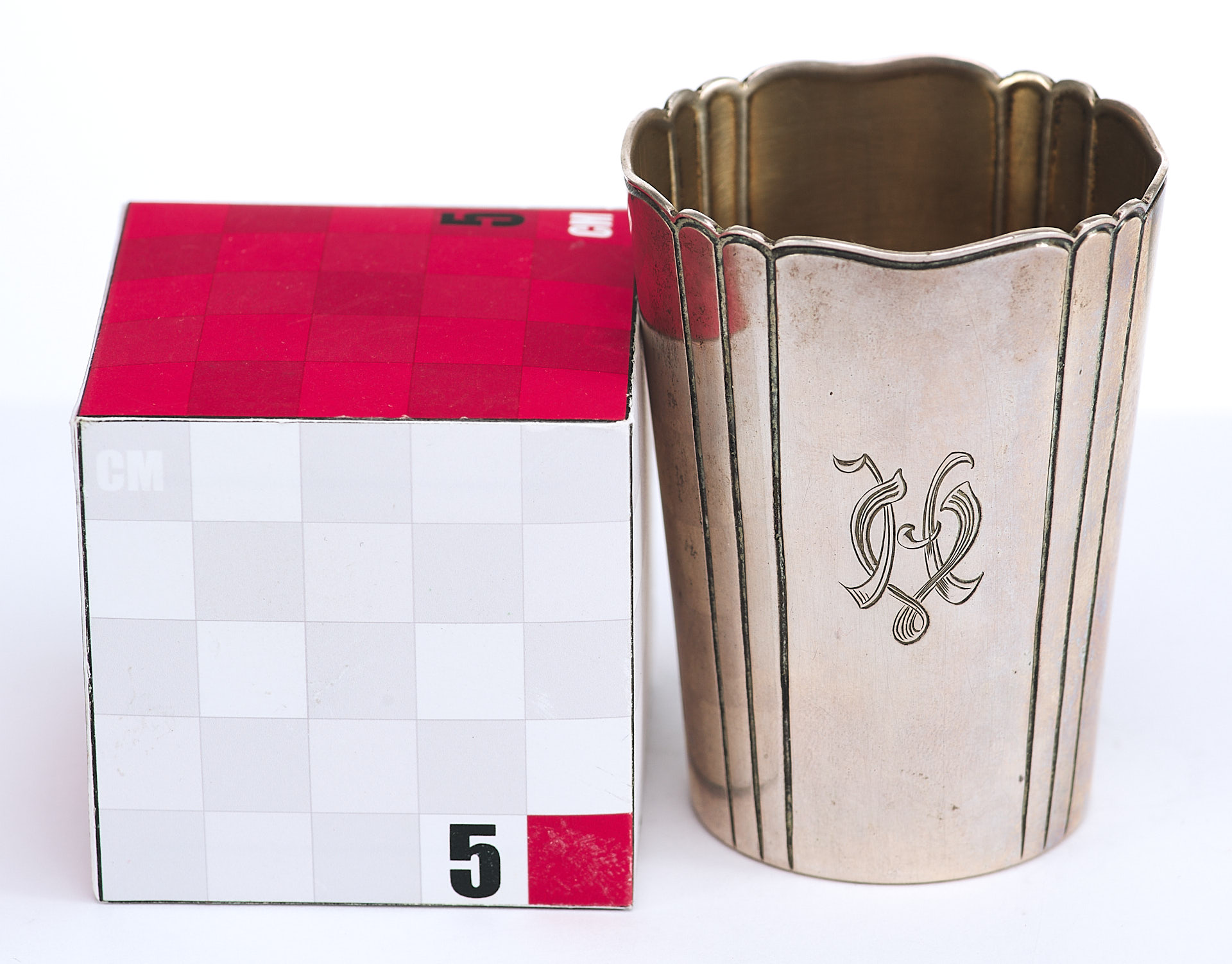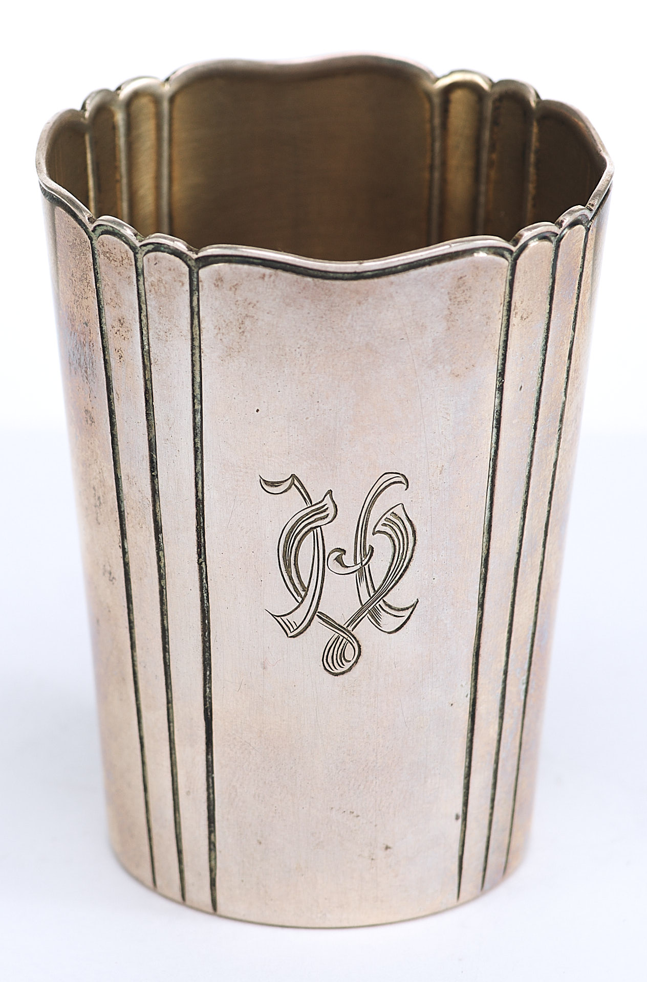 Представлена серебряная стопа с монограммой владельца: «НV».