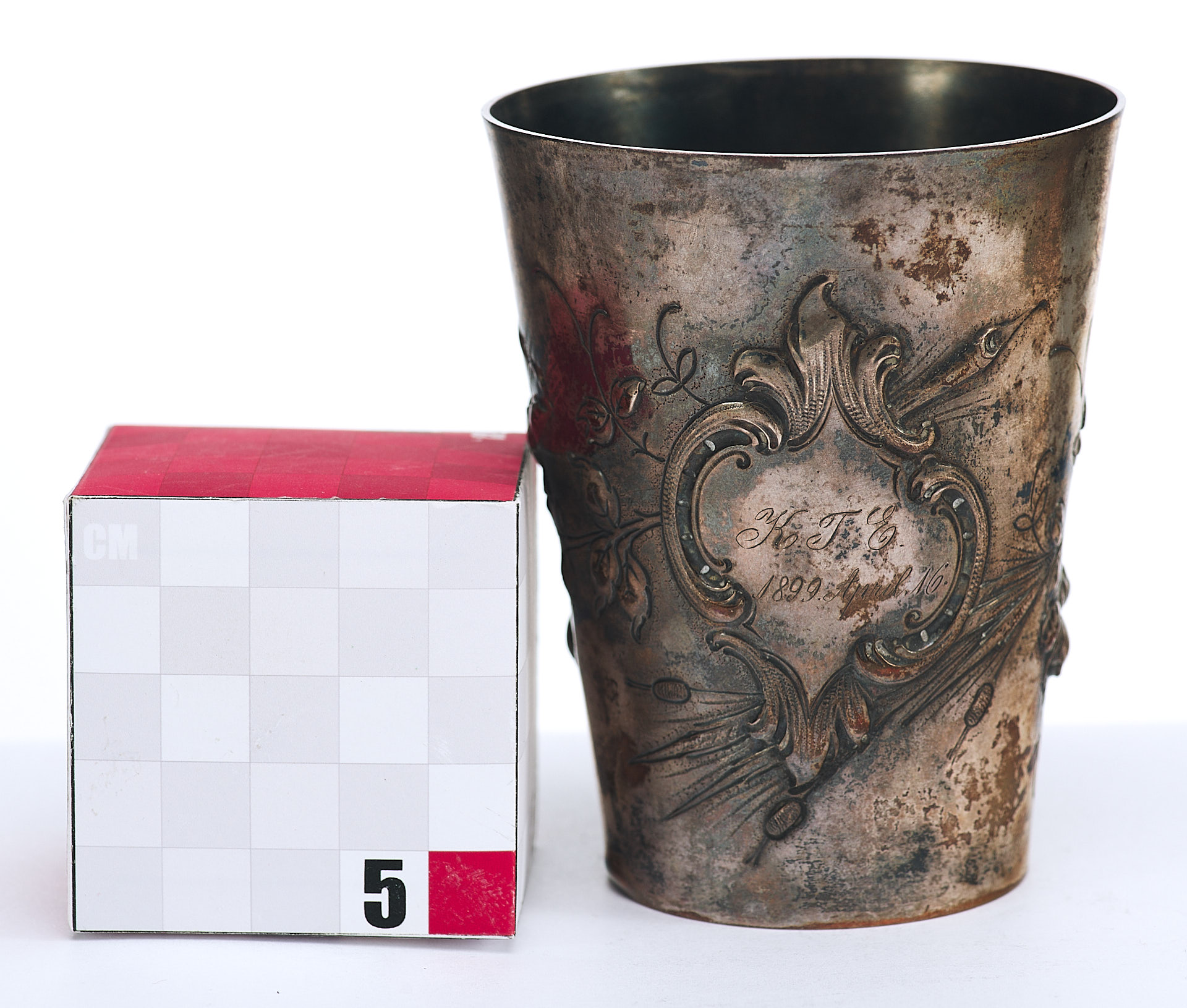 Представлен стакан украшенный нео-рокайльным орнаментальным украшением с картушем и изображением цветов. В картуше выгравирована надпись: «KFE / 1899 April 16».