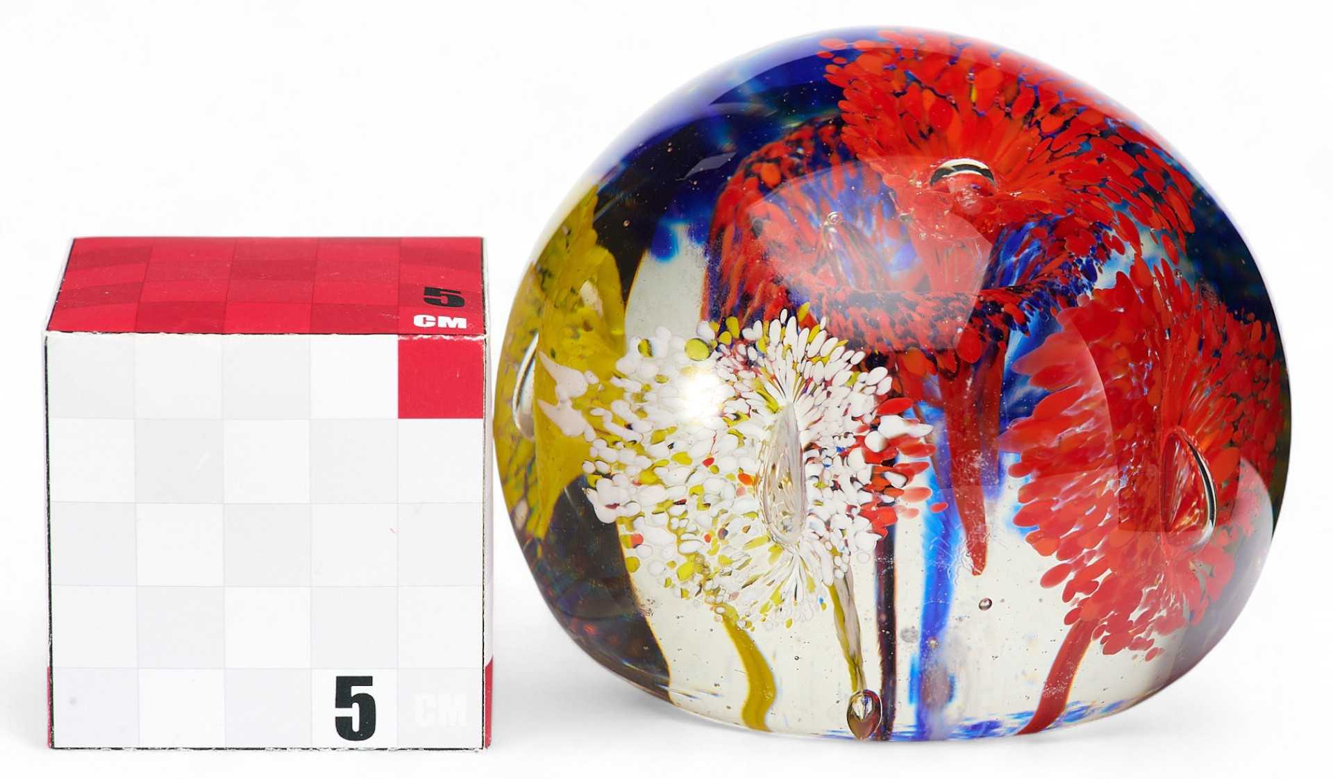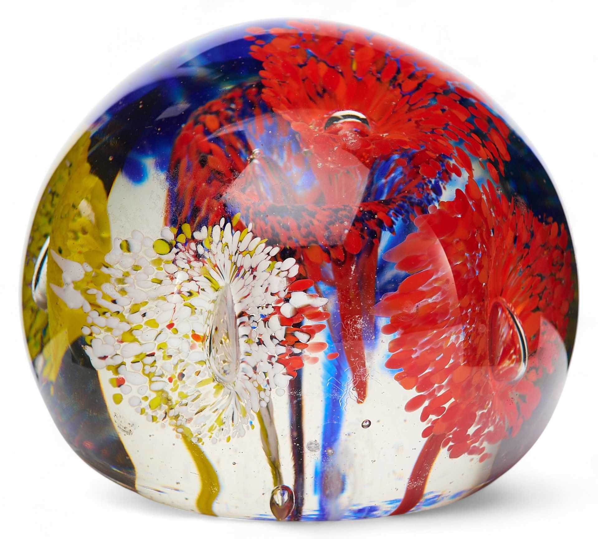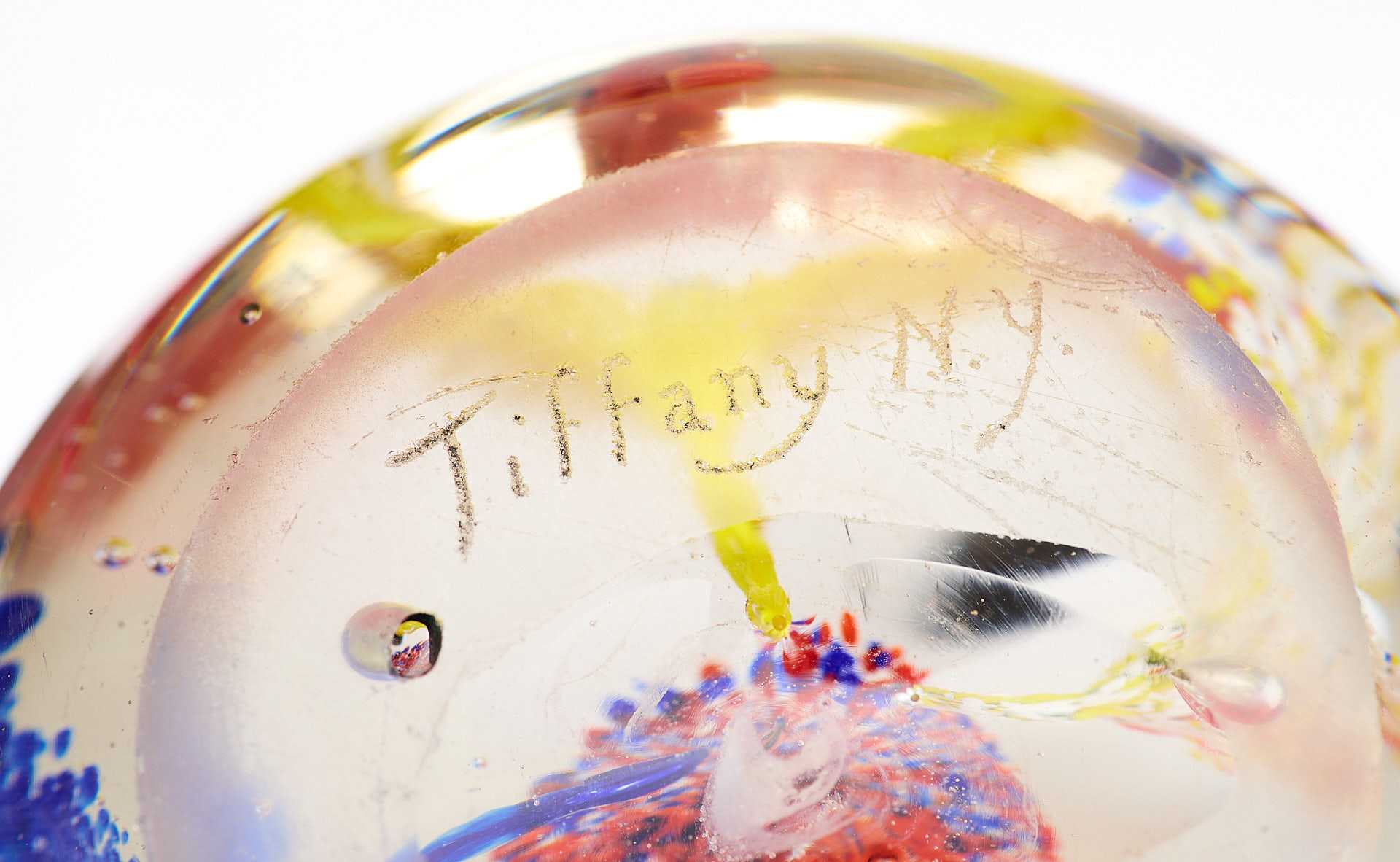 Представлено стеклянное пресс-папье в форме шара. Внутри в технике литья изображены красные и синие цветы. На внутренней (оборотной) стороне предмета гравированная надпись: “TiffanyN.Y.”