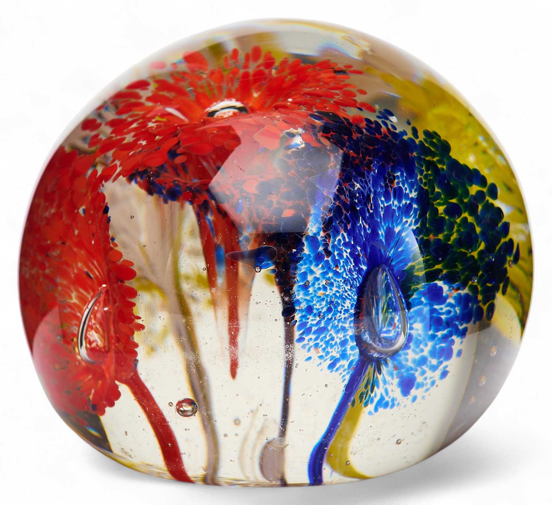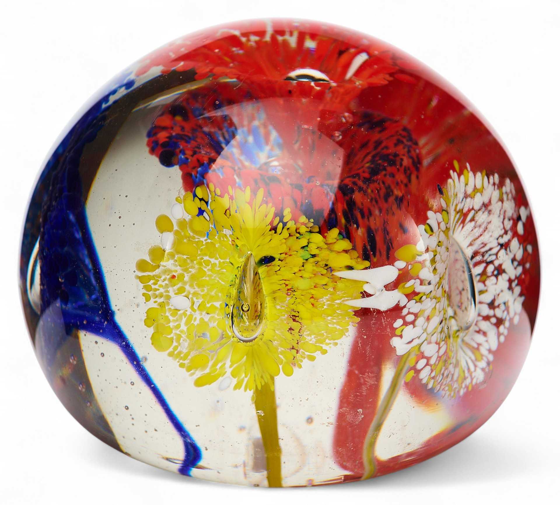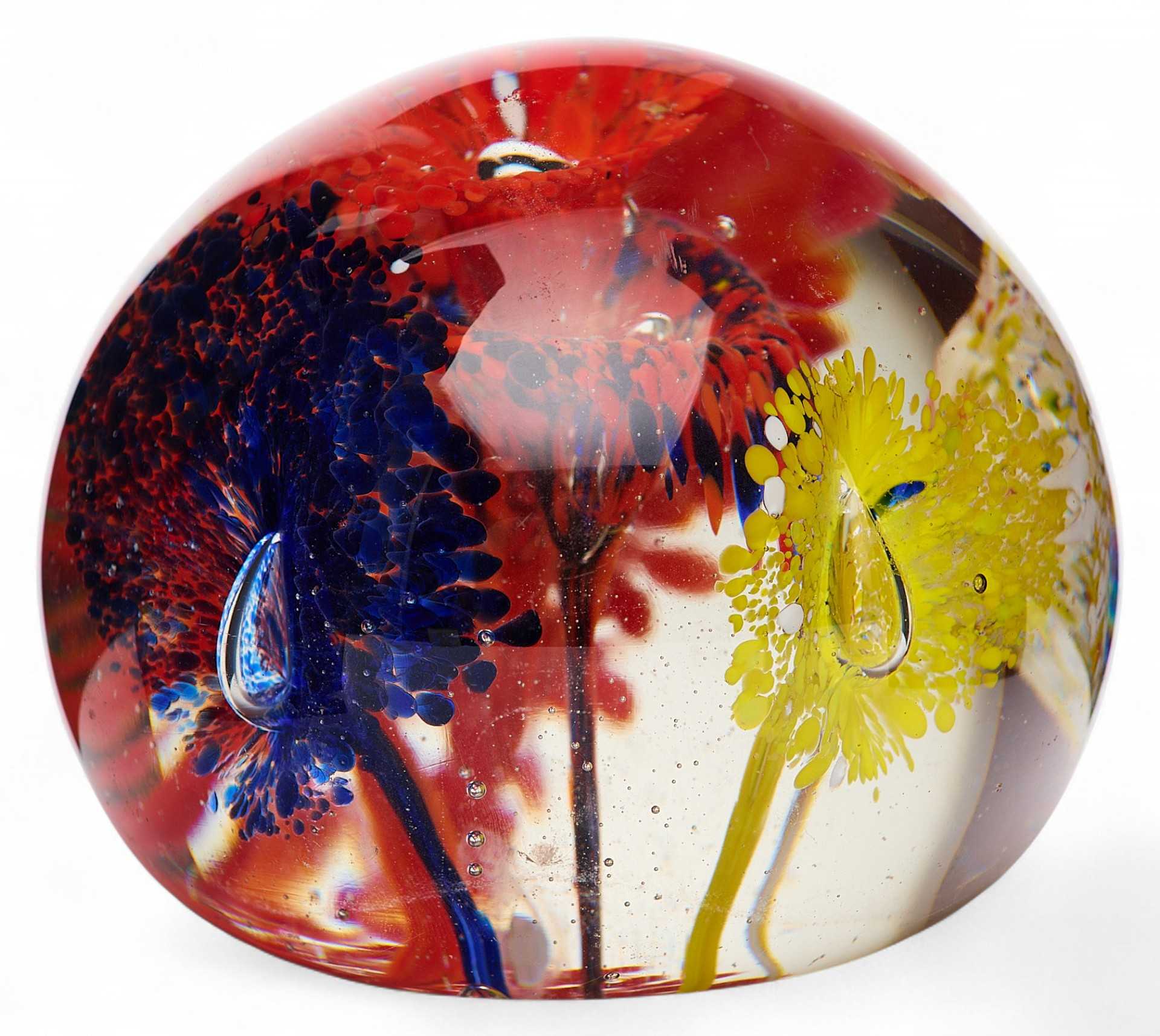 Представлено стеклянное пресс-папье в форме шара. Внутри в технике литья изображены красные и синие цветы. На внутренней (оборотной) стороне предмета гравированная надпись: “TiffanyN.Y.”