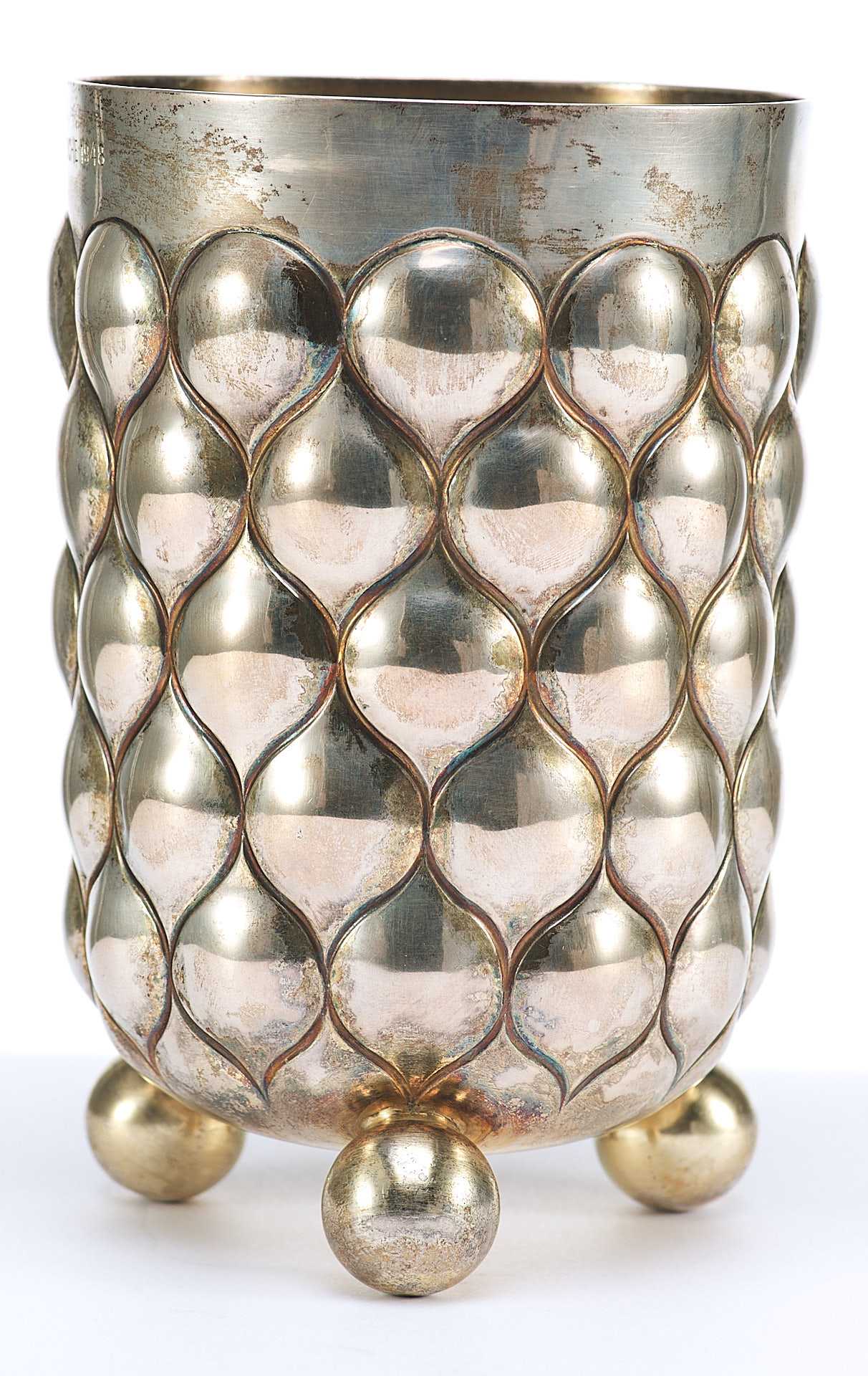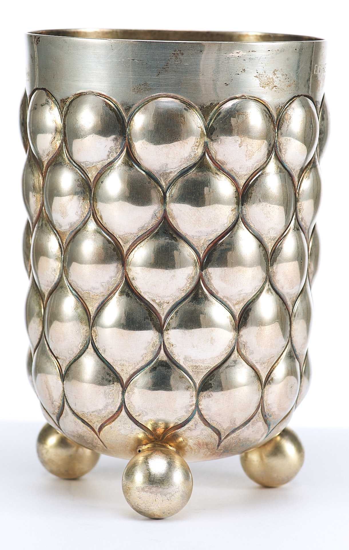 Кубок выполнен в строгом, суровом стиле; поверхность практически полностью покрыта вьшуклым кольчужным орнаментом.