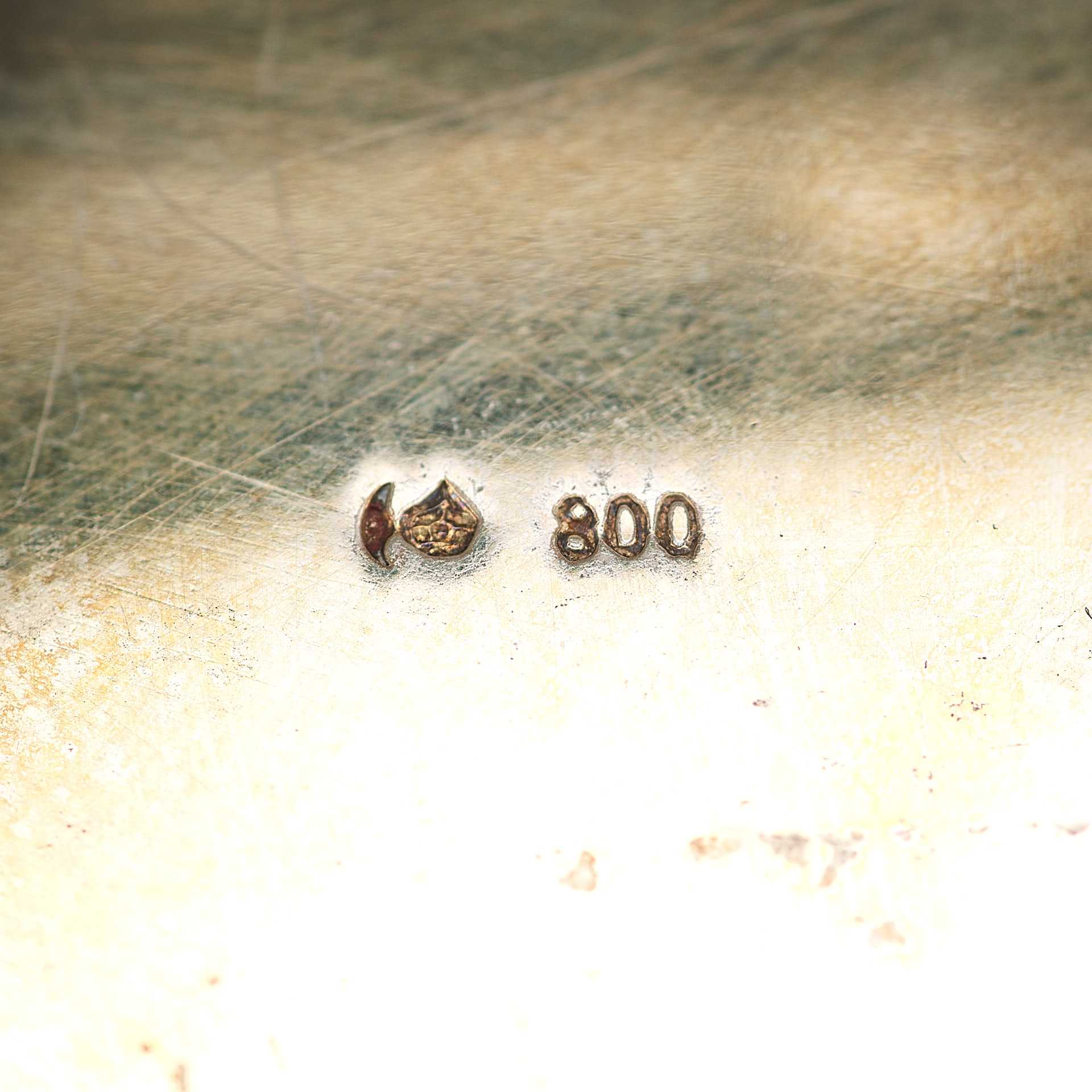 На дне кубка имеются клейма: 1. Обозначение «800» пробы. 2. Изображение короны и полумесяца - пробирное клеймо для изделий из серебра 800 пробы, введено в Германии после 1886